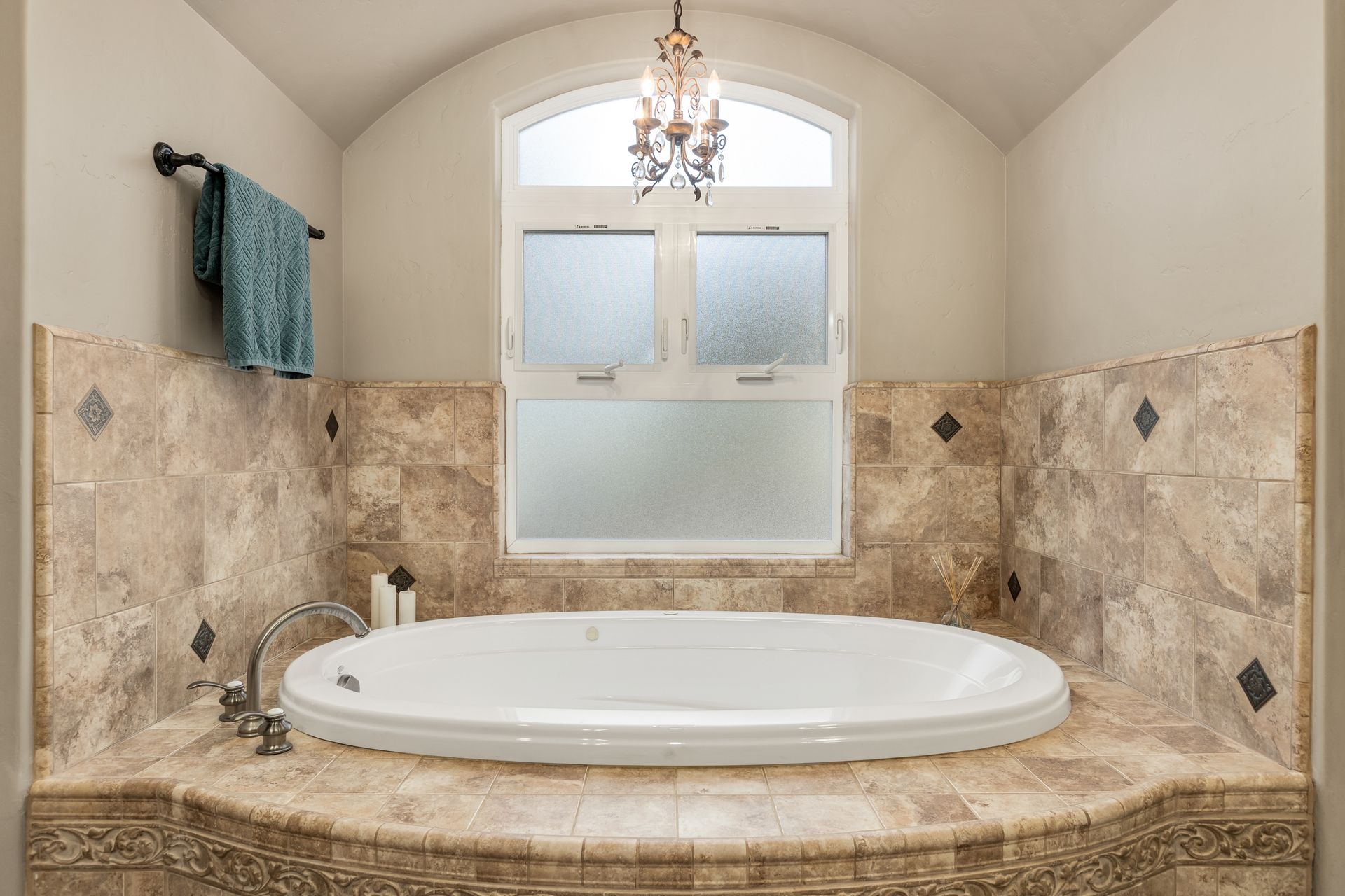 · Luxurious bathroom with separate granite vanities, jetted soaking tub, large walk-in shower with sitting bench and window, and private toilet room