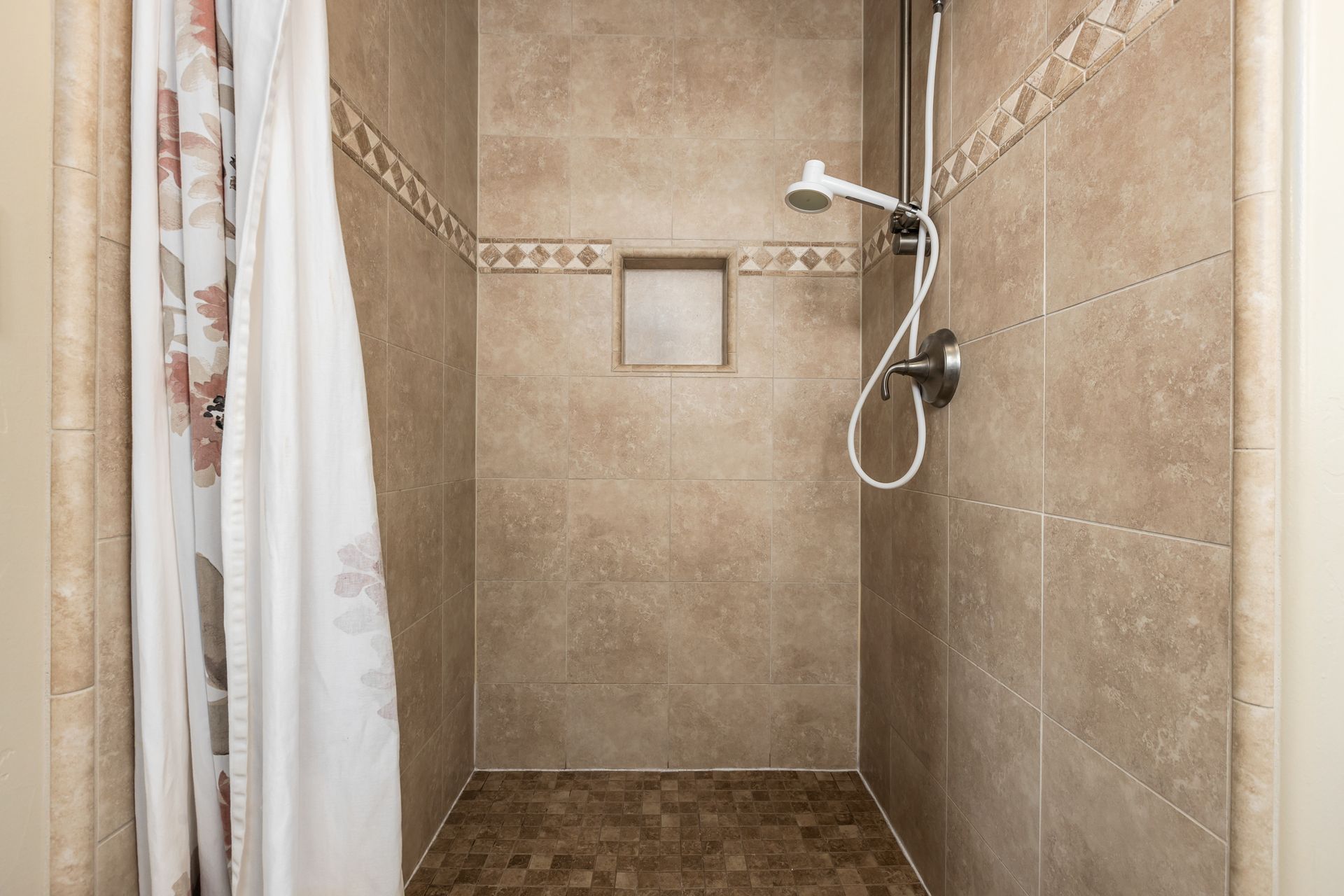 · Full bathroom with tile flooring, shower over tub, and single-sink vanity