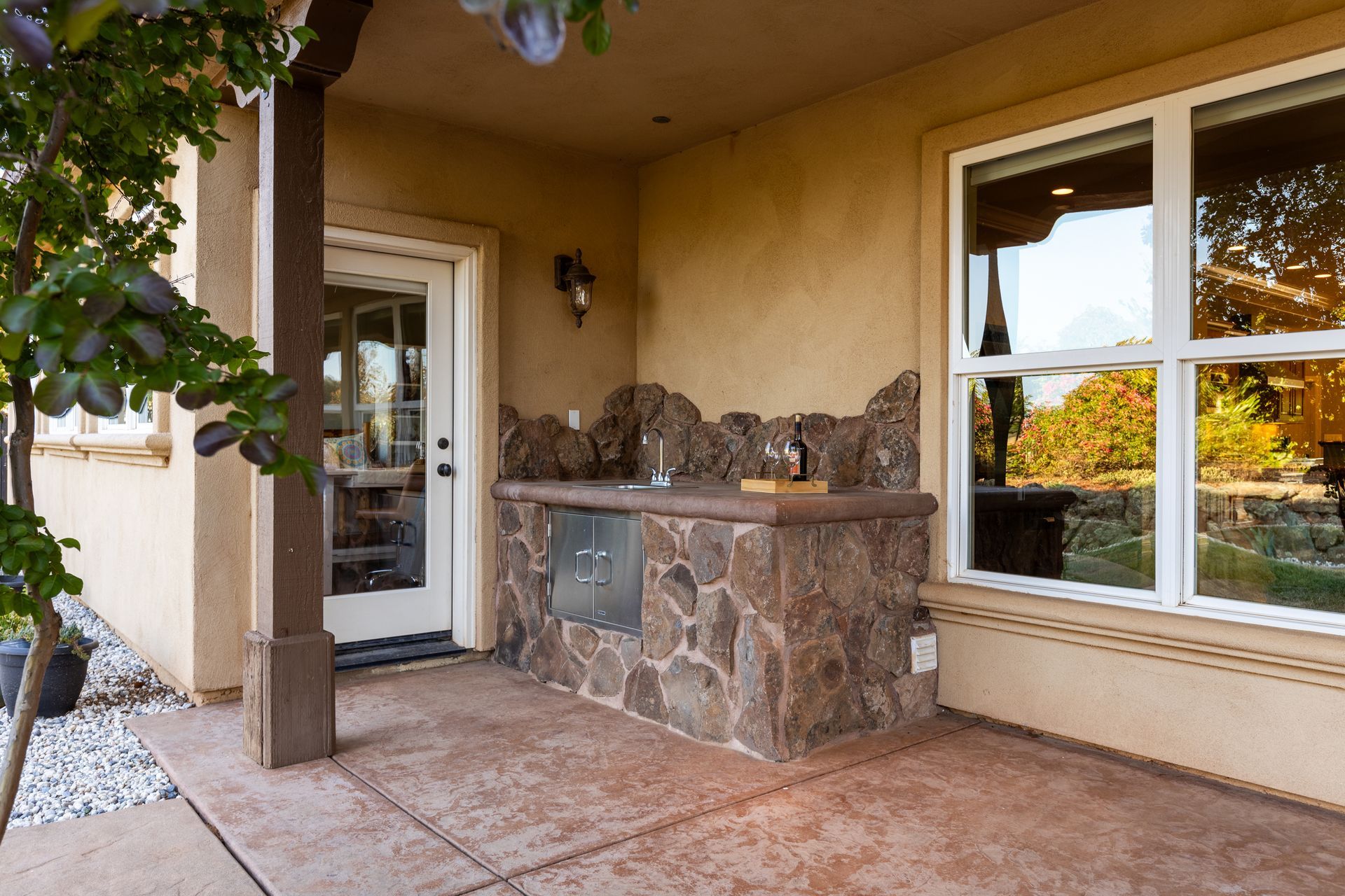 · Covered rear patio with outdoor kitchen (Bull BBQ and refrigerator), bar with sink, and multiple ceiling fans and storage cabinets