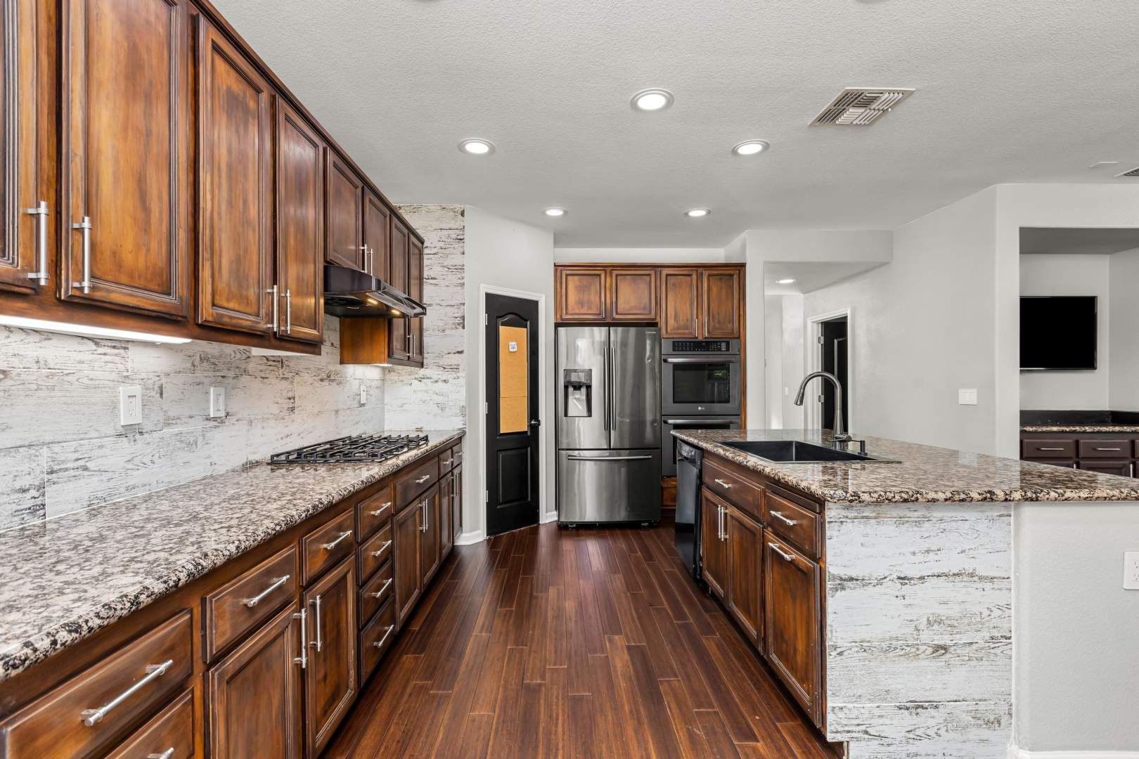 The inviting great room, featuring a cozy gas fireplace, offers picturesque views of the freshly landscaped backyard complete with a spa—a perfect retreat for relaxation. Its open layout seamlessly connects to the remodeled kitchen, which is a culinary enthusiast's dream, boasting a shiplap tile backsplash, large granite dine-up center island, pantry, and newer stainless steel double ovens along with a 5-burner gas stove.