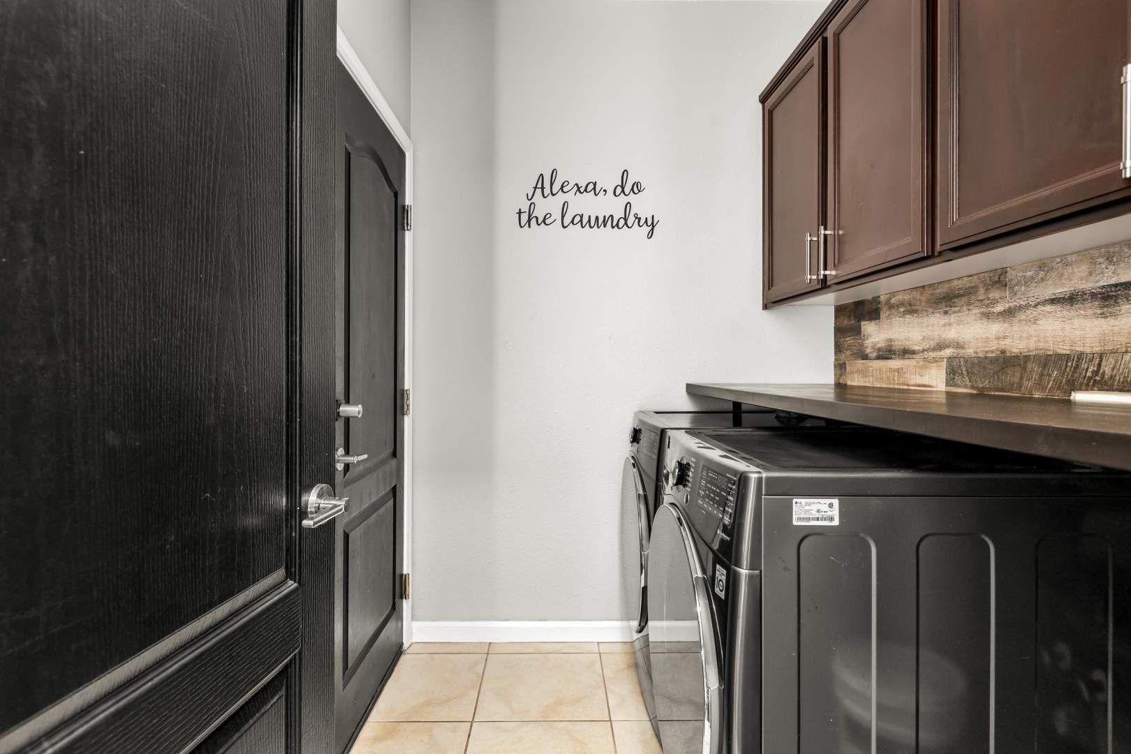 Laundry room with included washer and dryer, folding counter and cabinet storage
