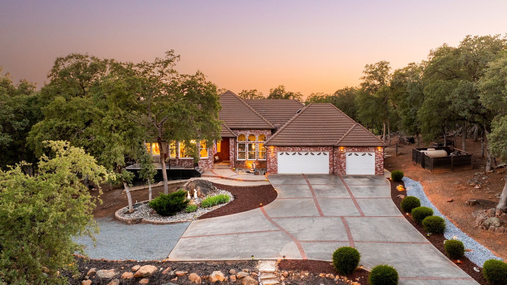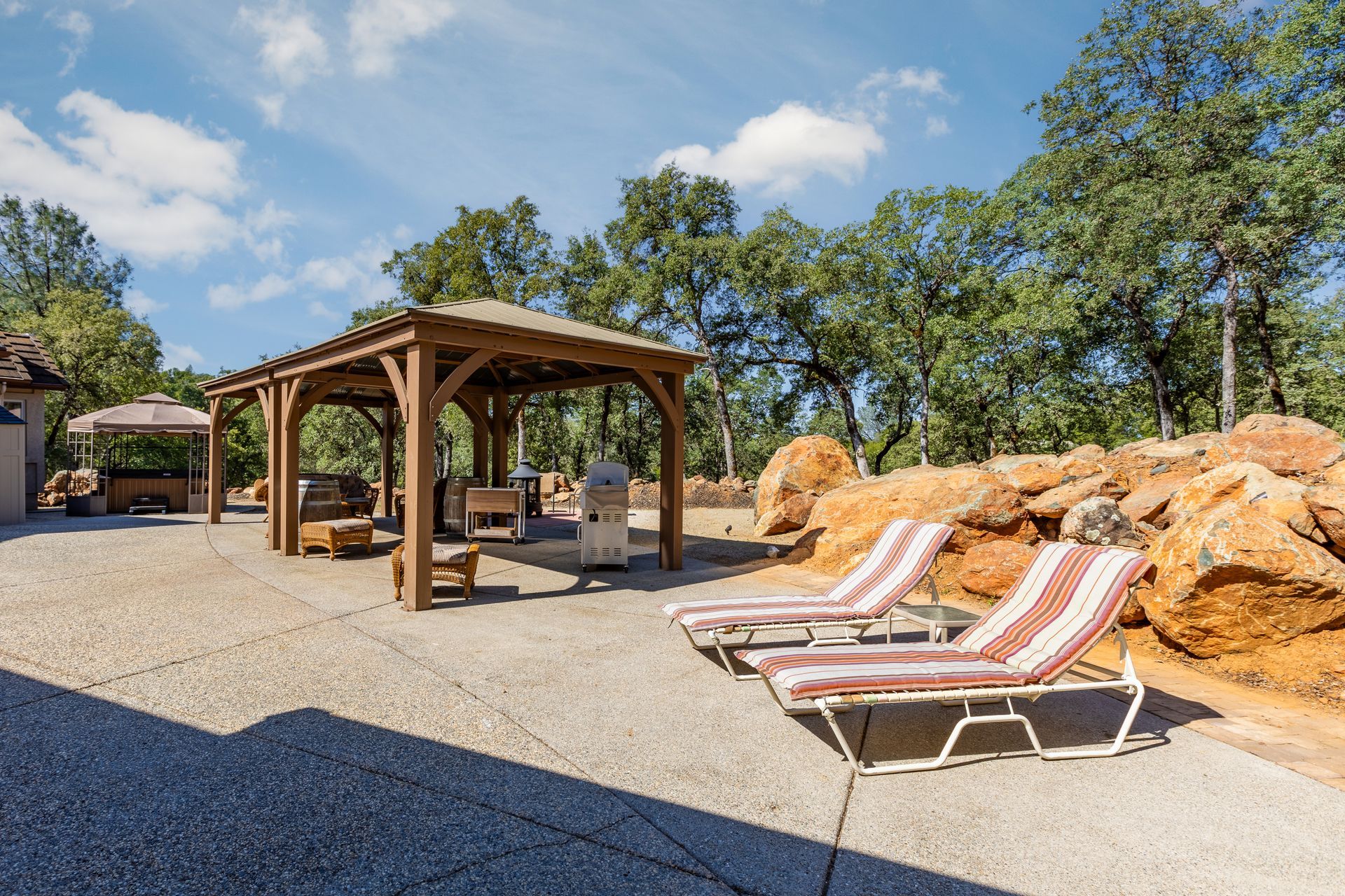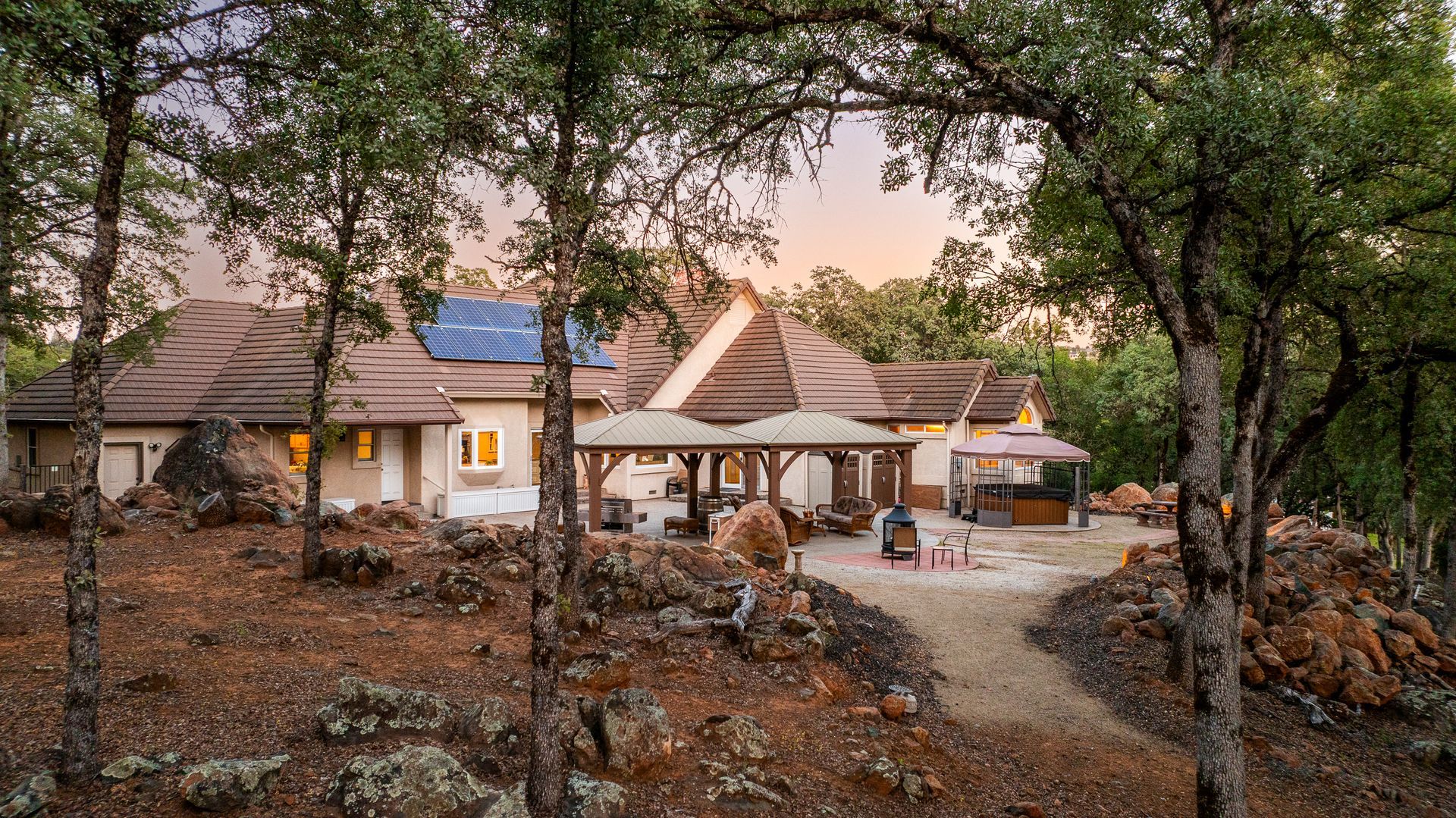 The private backyard retreat is designed for both relaxation and function with two gazebos, a deluxe 6-person Jacuzzi spa and an expansive concrete patio surrounded by natural rock outcroppings. The front deck with beautiful composite Trex decking provides for dining while viewing the trees located on the property. The oversized 3-car garage includes a floored attic with pull down aluminum stairs, 220V EV charging outlet, platform storage and a workbench. There is also a massive gravel pad providing RV storage or space to build a shop or ADU.