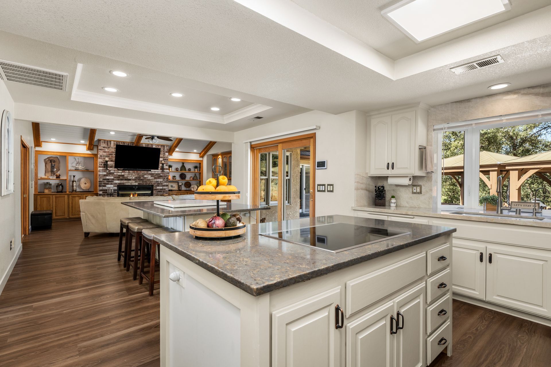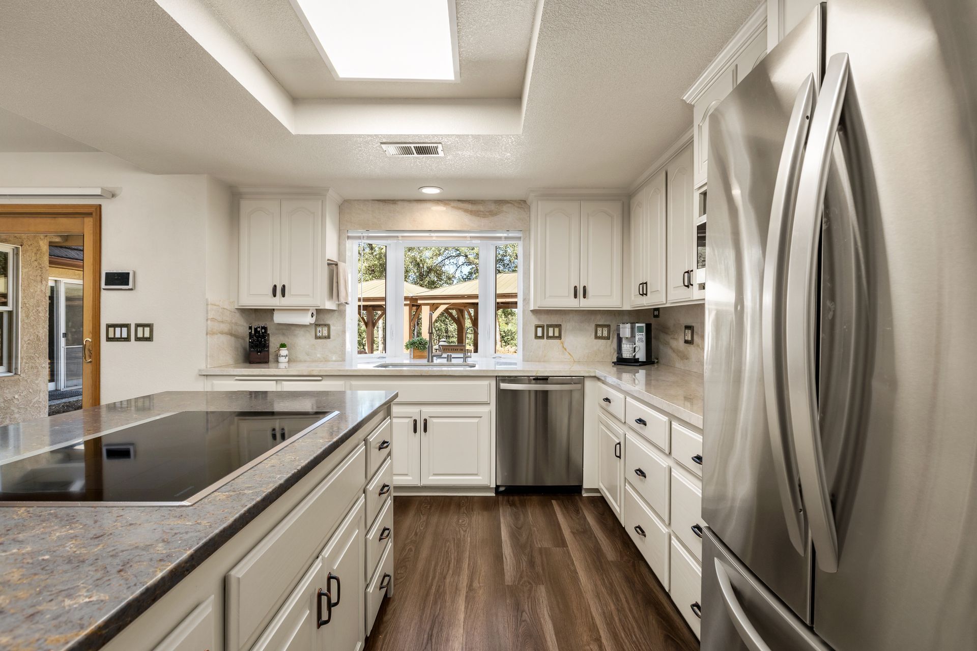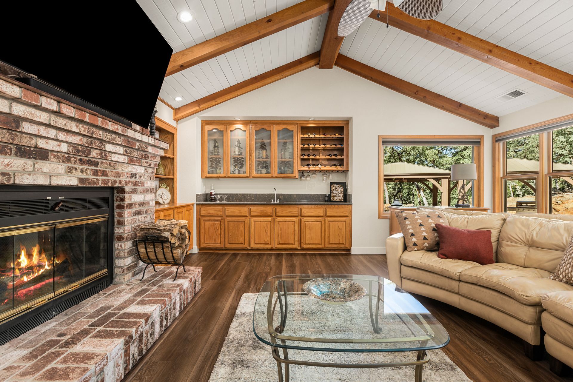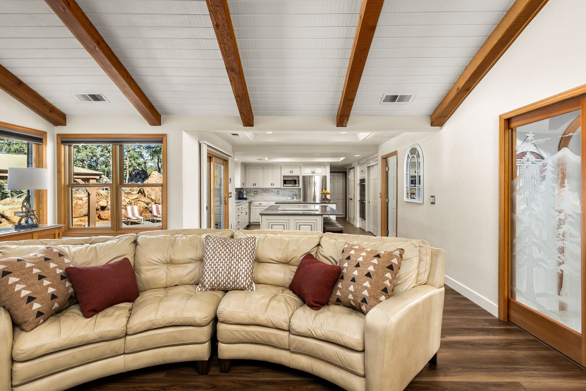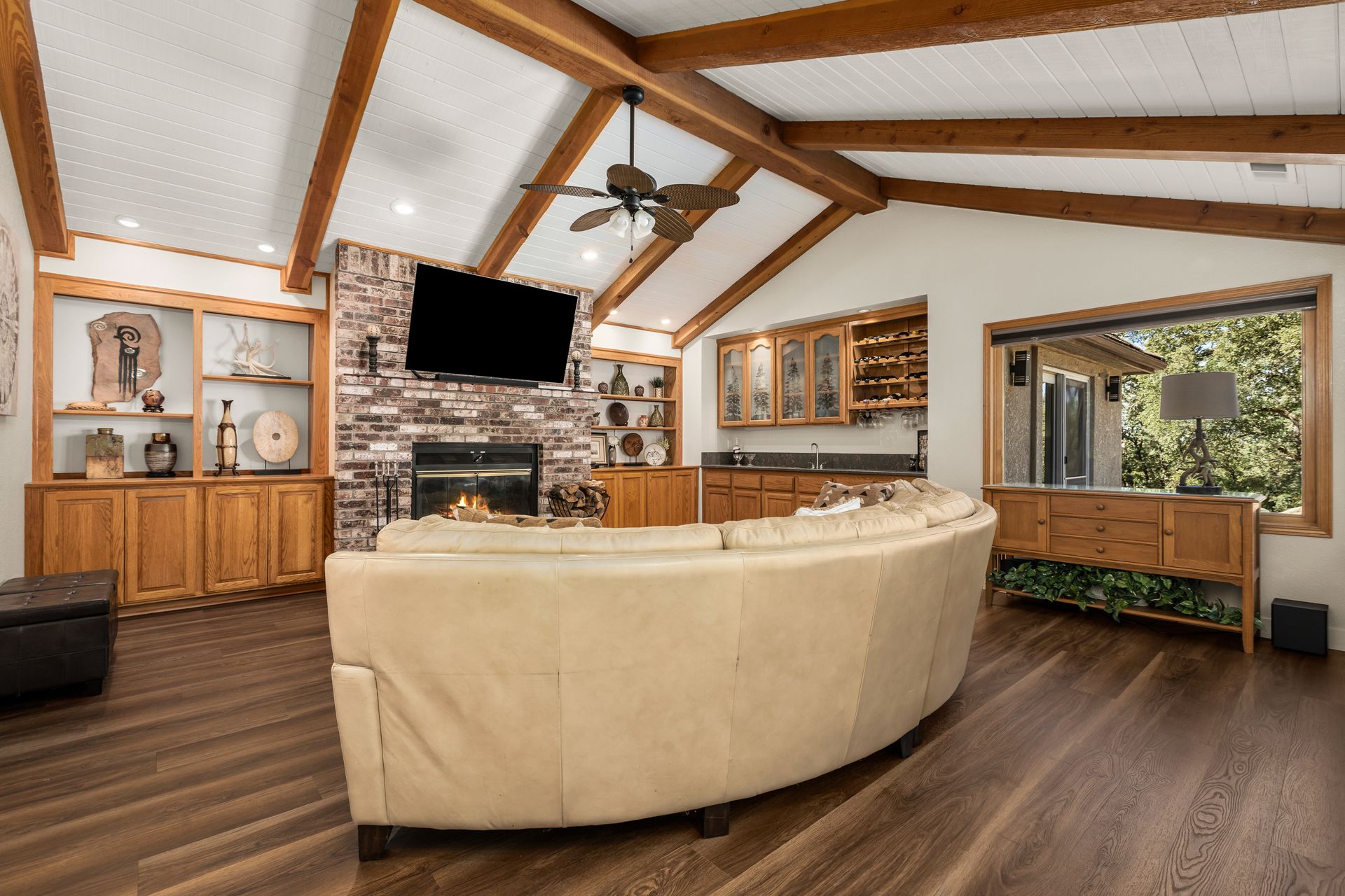 Experience refined country living in this beautifully updated Saddleback Estates home. This single level private home features a fully owned solar system for nearly self-sufficient electrical usage and Generac whole-house generator for peace of mind during emergency power outages. Nestled in a Firewise community just minutes from amenities, this home features an open-concept floor plan complemented by luxury vinyl plank flooring with cork underlay and a great room with a grand wood burning fireplace with built in cabinets, vaulted knotty pine ceilings and a generous bar area, perfect for entertaining. The chef’s kitchen boasts quartzite countertops, dual center islands, stainless steel appliances including a double oven, and two pantry spaces. The expansive dining room, office/flex space and wide hallways leading to the spacious bedrooms provide ample room to spread out.