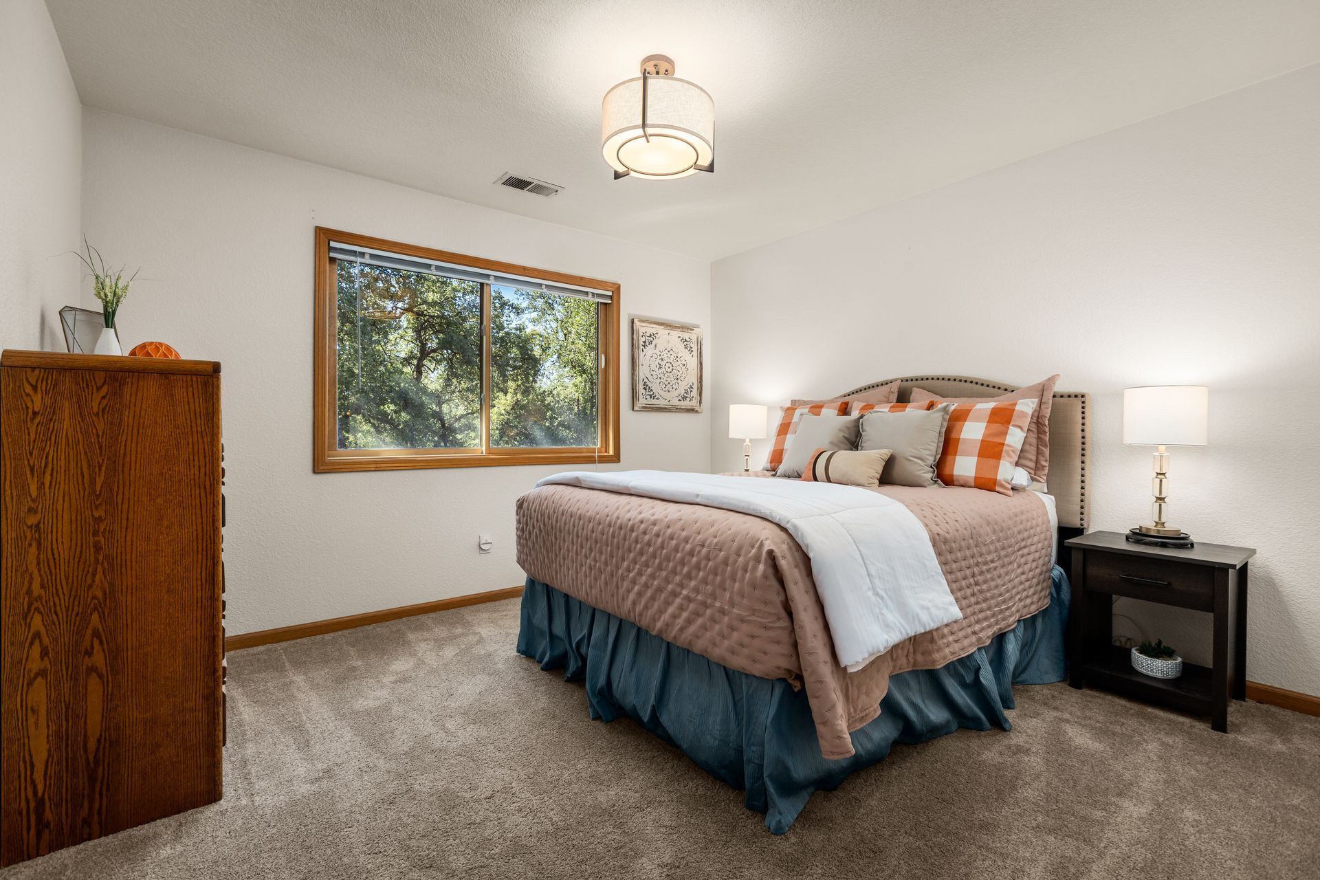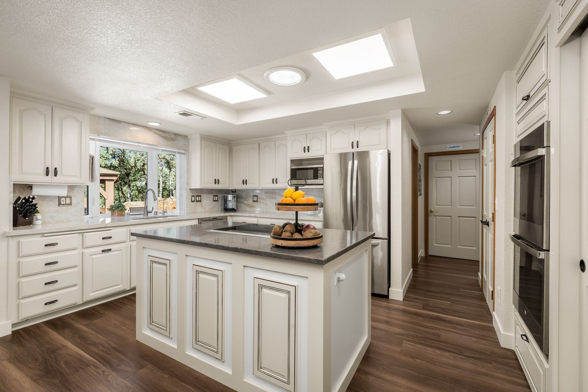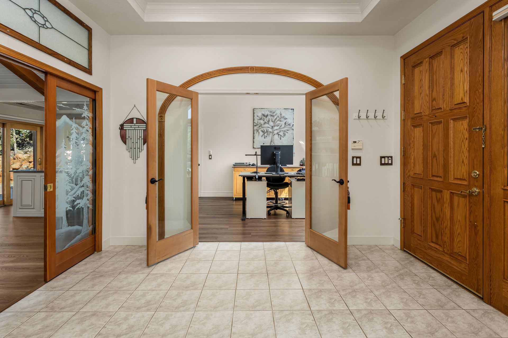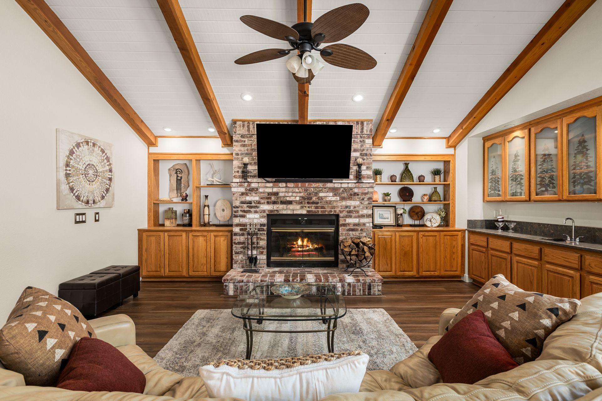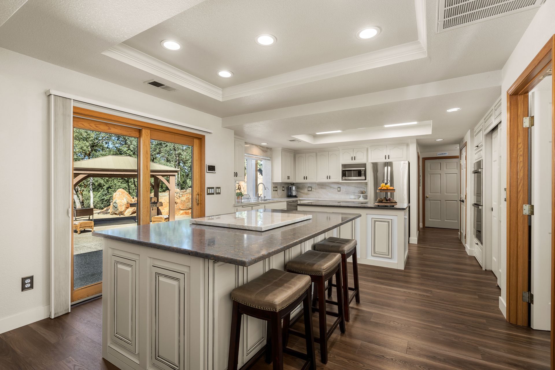 Experience refined country living in this beautifully updated Saddleback Estates home. This single level private home features a fully owned solar system for nearly self-sufficient electrical usage and Generac whole-house generator for peace of mind during emergency power outages. Nestled in a Firewise community just minutes from amenities, this home features an open-concept floor plan complemented by luxury vinyl plank flooring with cork underlay and a great room with a grand wood burning fireplace with built in cabinets, vaulted knotty pine ceilings and a generous bar area, perfect for entertaining. The chef’s kitchen boasts quartzite countertops, dual center islands, stainless steel appliances including a double oven, and two pantry spaces. The expansive dining room, office/flex space and wide hallways leading to the spacious bedrooms provide ample room to spread out.
