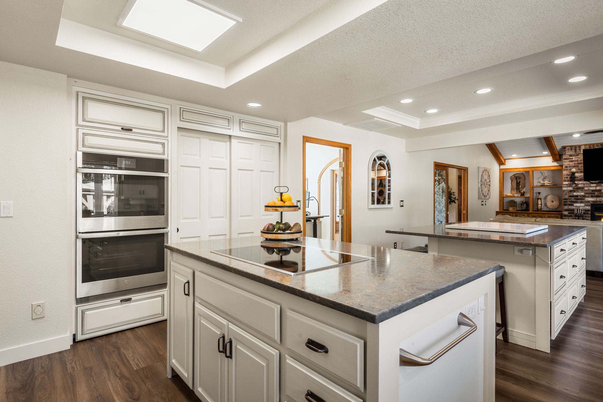 · Two large center islands: one with induction cooktop and downdraft, one with seating for 6 and utility drawers