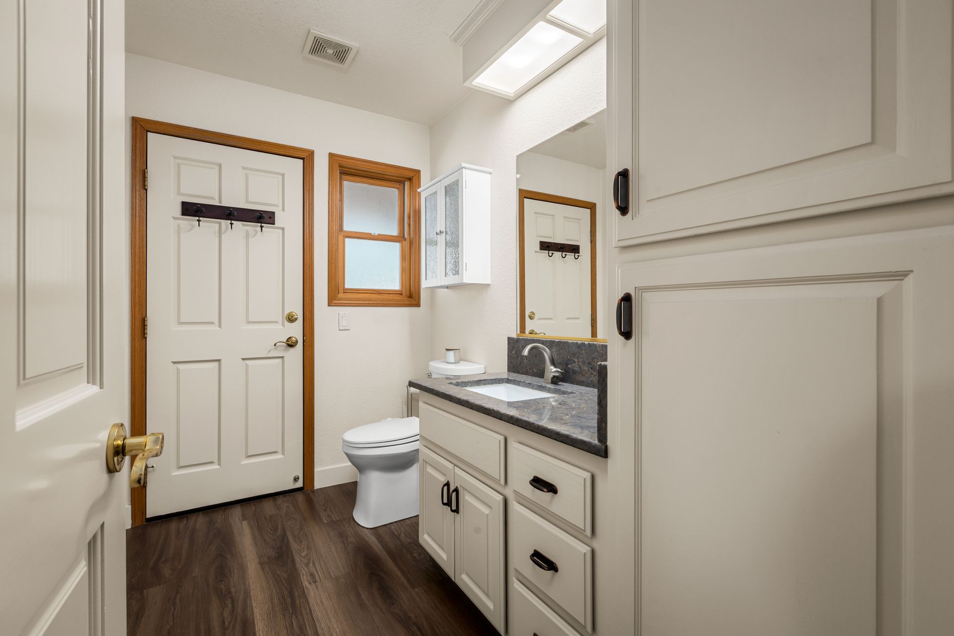 Laundry Room behind kitchen with sink, upper and lower cabinets, quartz counters, additional pantry storage and ozone water treatment