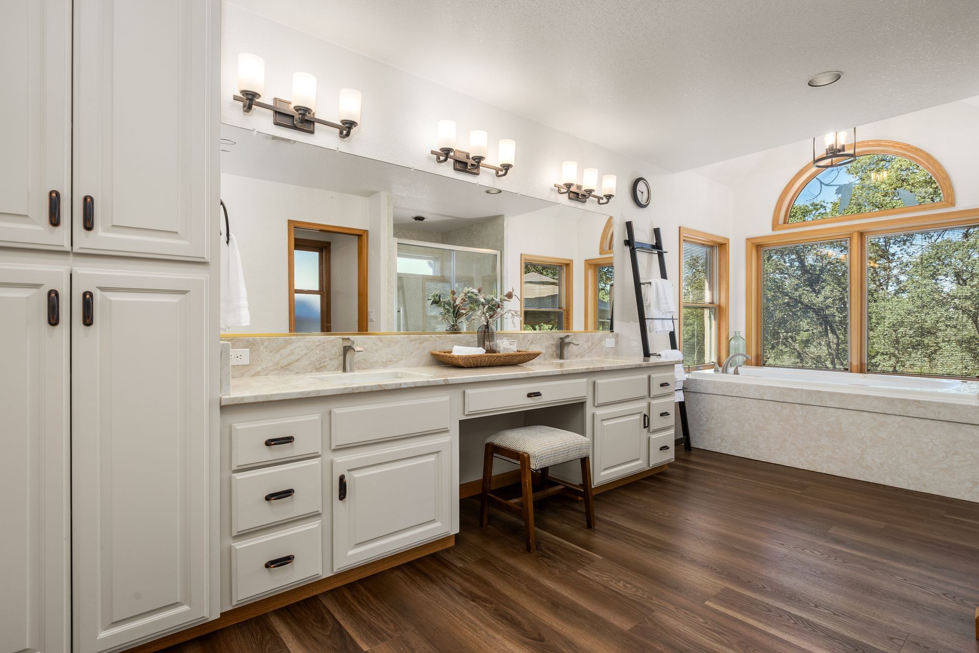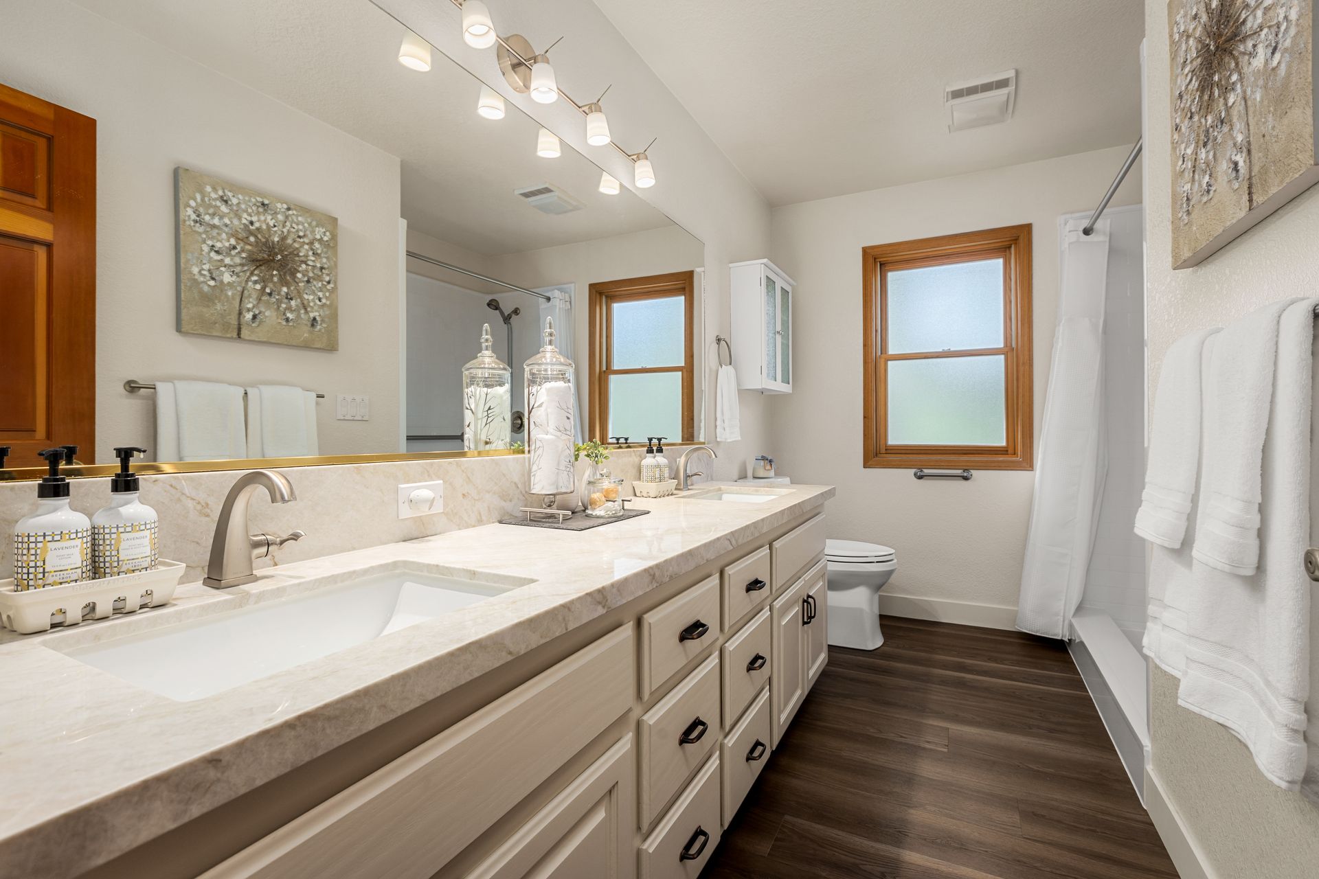 - Remodeled En suite bath with quartzite double vanity with makeup desk, jetted tub framed by windows (including etched stained glass transom window), huge walk-in shower with heat lamp, private toilet room with frosted window