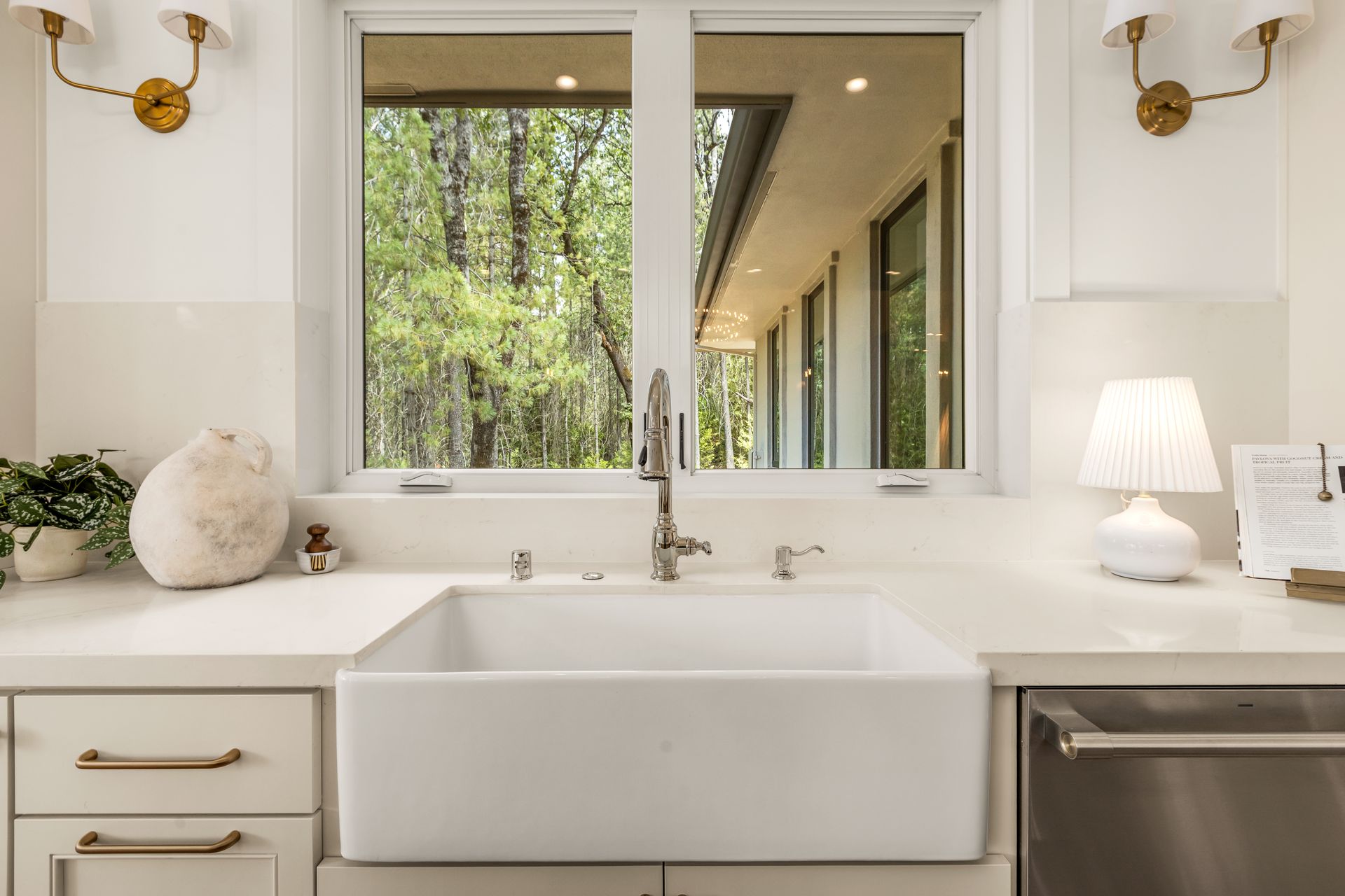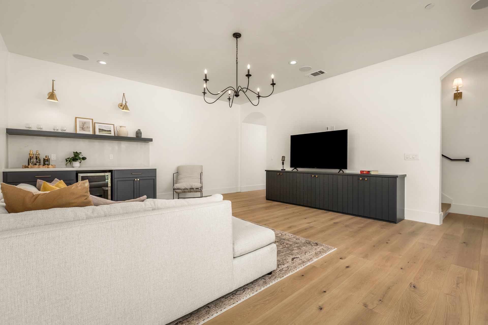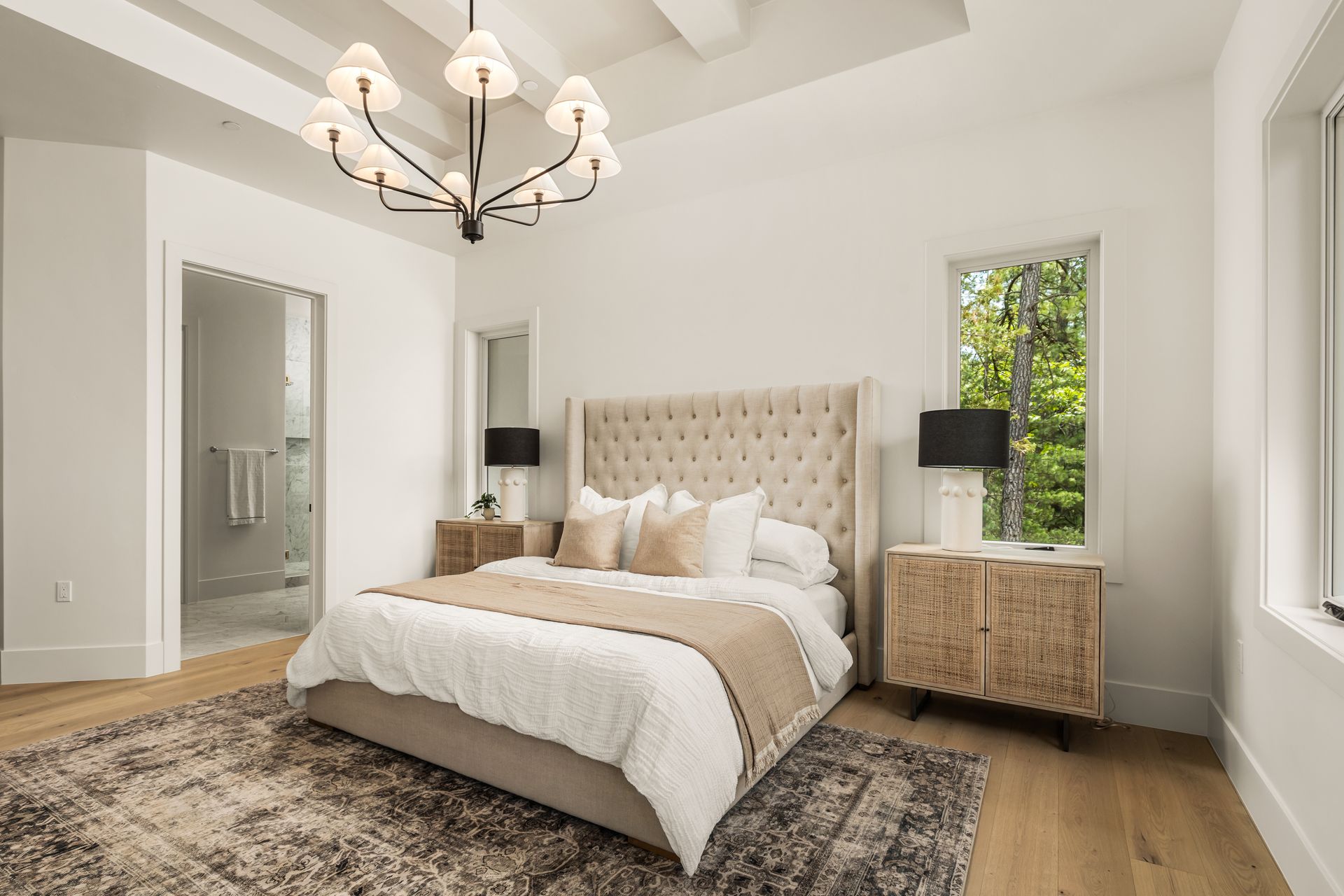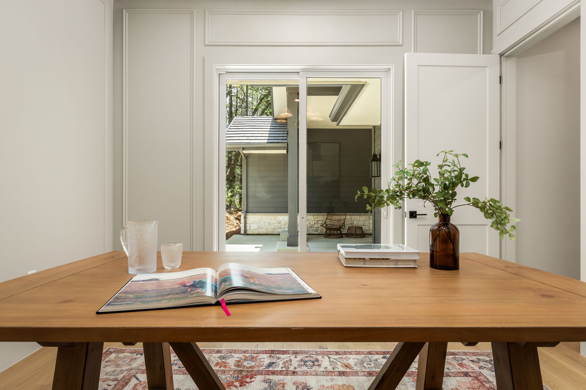 Step through the double glass doors into a breathtaking great room with 17-foot vaulted ceilings with white beams and expansive windows that frame serene views of the forest beyond. Light dances across the European white oak floors, while the glow of a designer chandelier and the linear fireplace create an inviting atmosphere that feels both grand and grounded. The heart of the home is the chef’s kitchen - anchored by a 10-foot island and appointed with Monogram appliances, custom cabinetry, and a stylish walk-in pantry -designed for memorable meals and gatherings that flow effortlessly into the dining areas and covered outdoor patio.