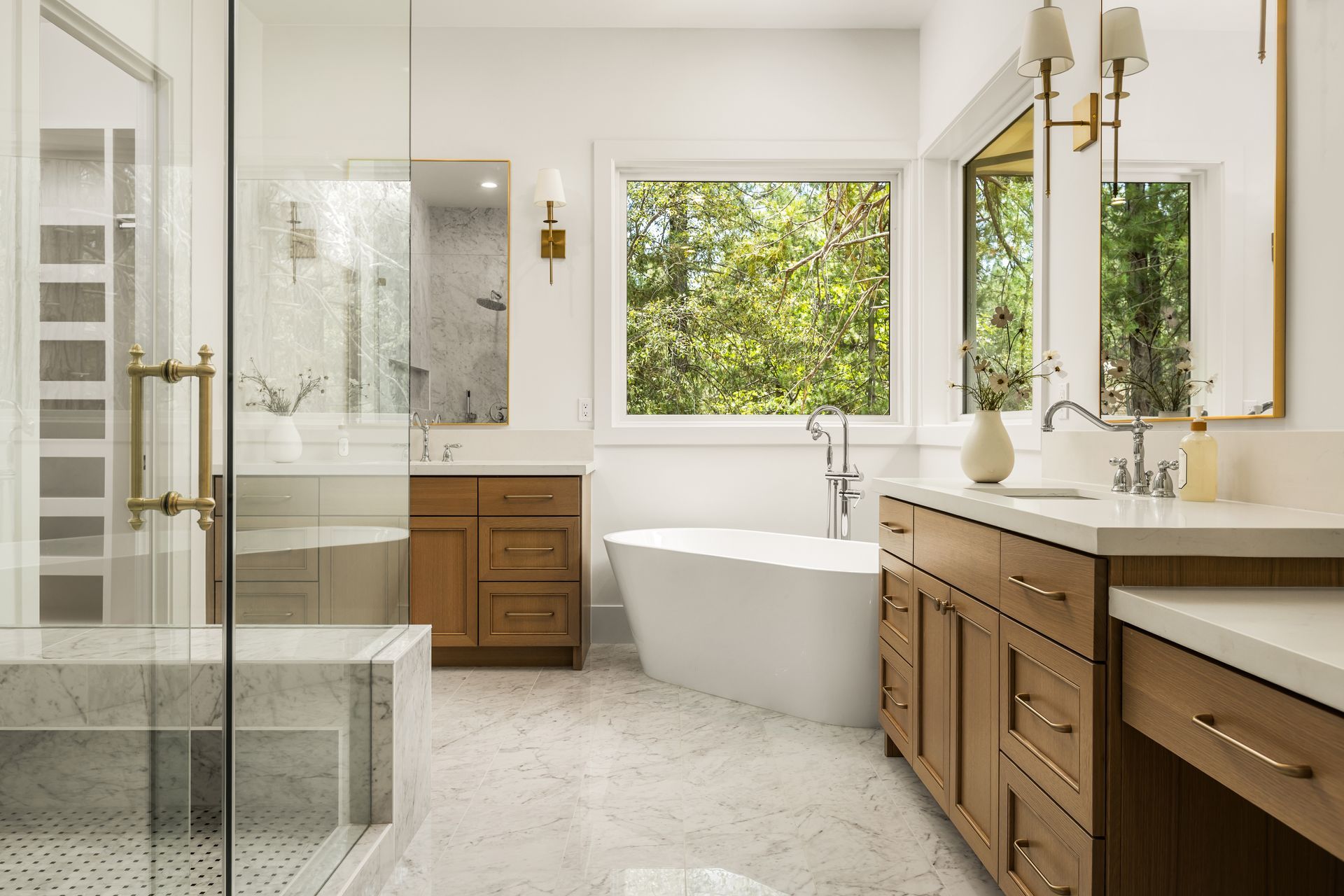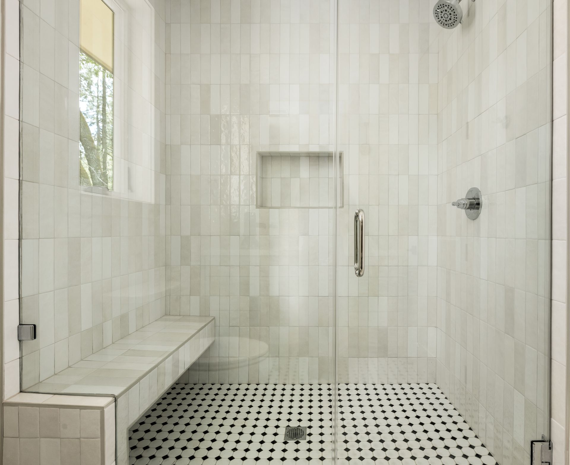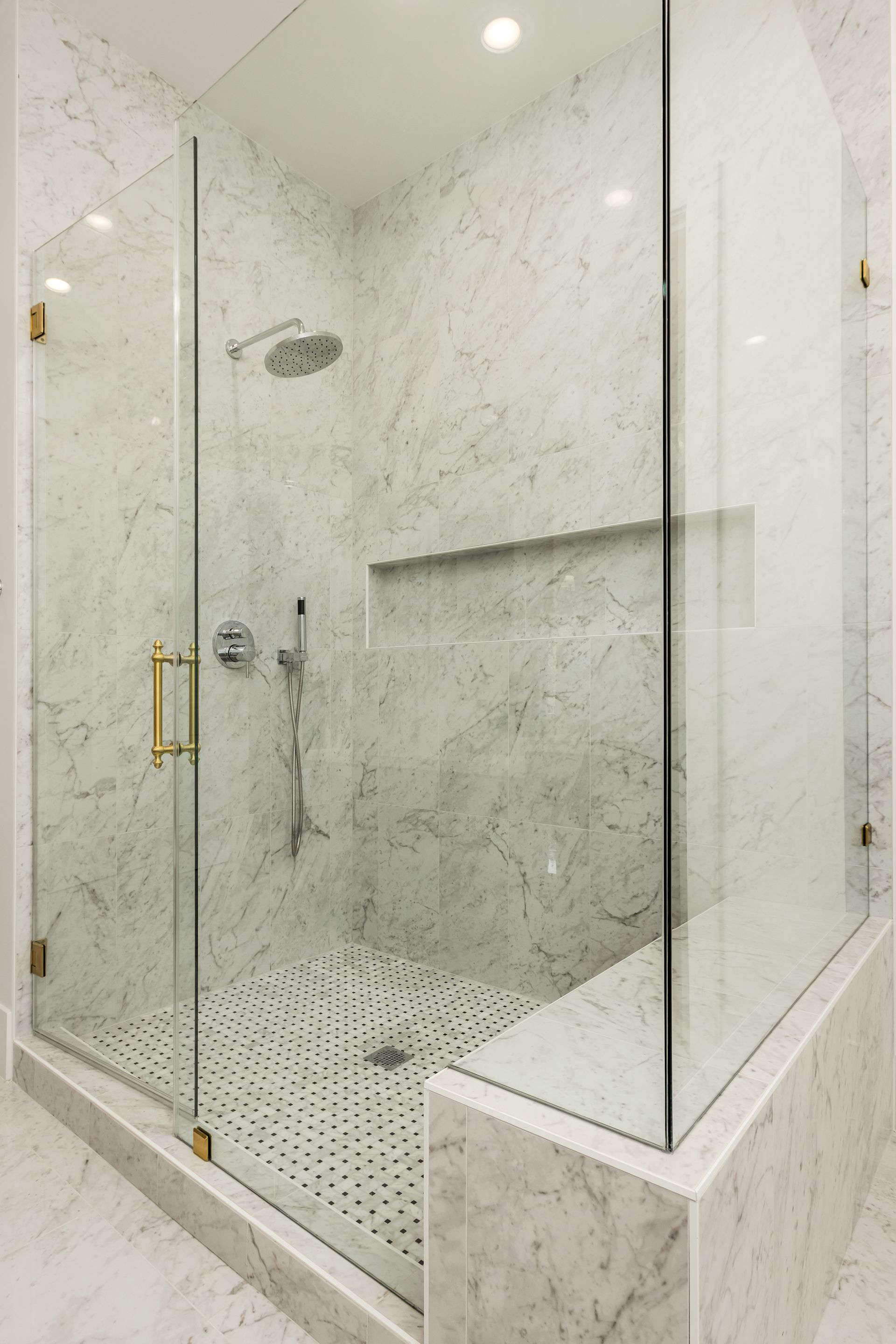 - Frameless Glass Walk-In Shower with Dual Showerheads, Bench and Floor-to-Ceiling Tile