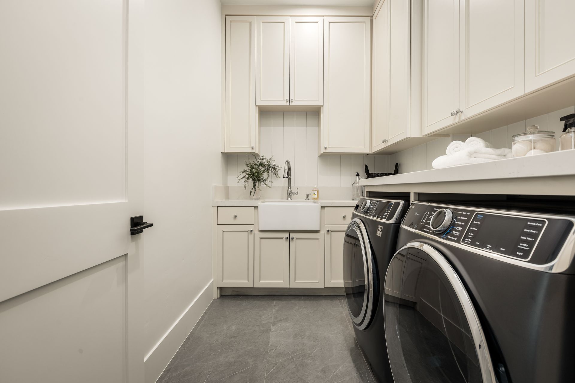Laundry with Apron Sink, GE Profile Washer/Dryer, Upper and Lower Storage, and Custom Wall Paneling