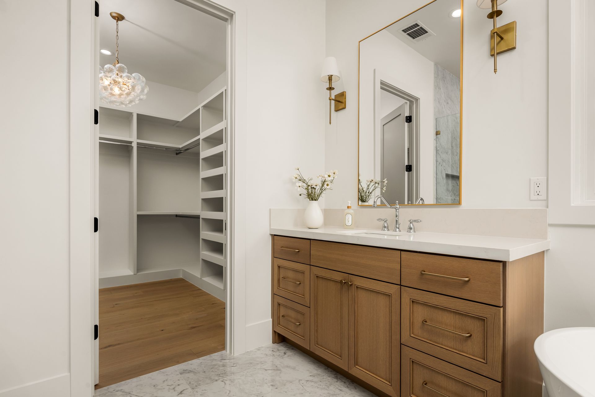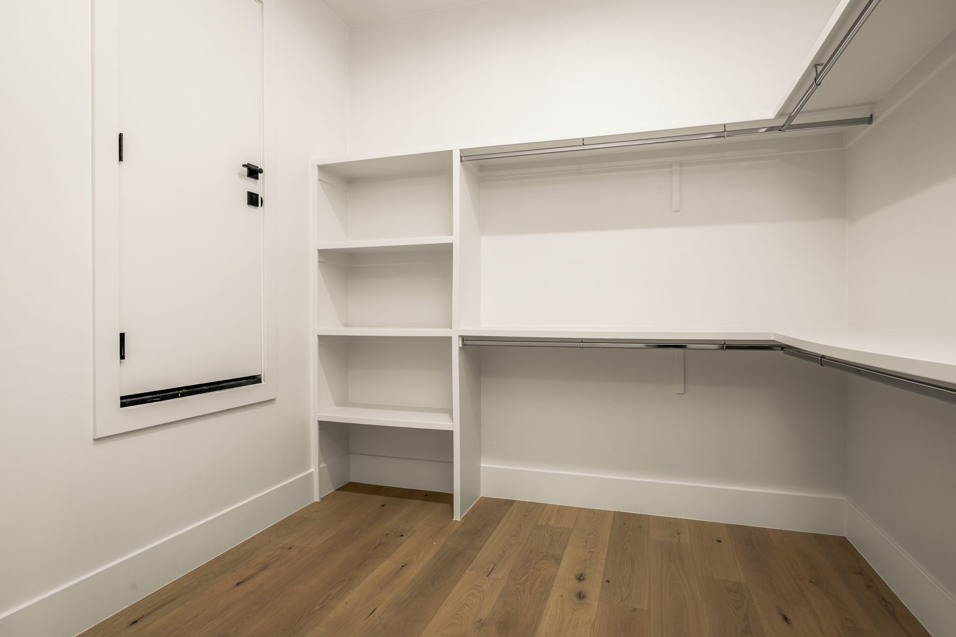 - Large Custom Walk-In Closet with Shelving, Built-Ins and Designer Lighting