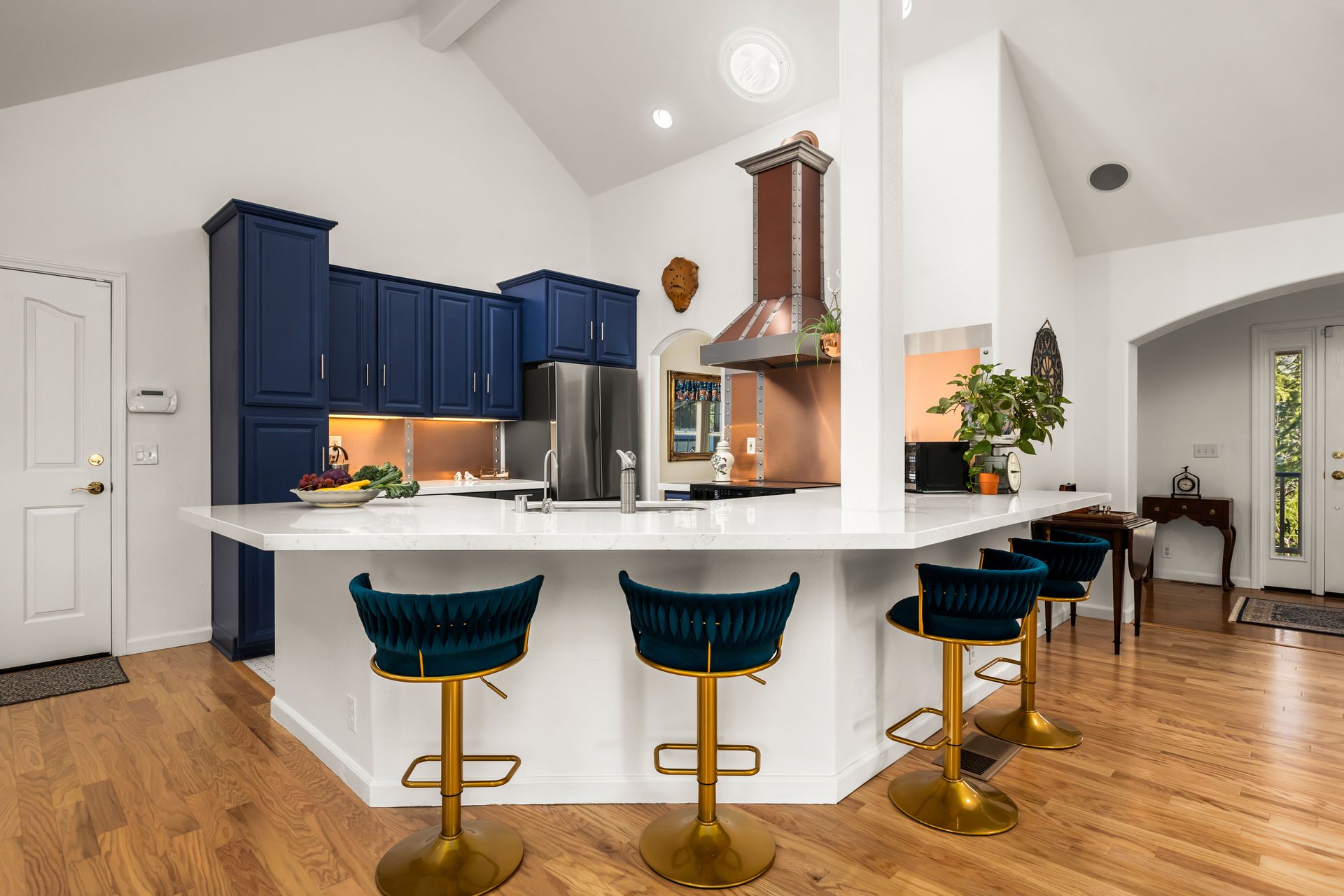 - Kitchen: Fully remodeled with a five-person dine-up bar, stainless steel Samsung appliances and sink, quartz countertops, AquaSana water filter and faucet, copper backsplash, and a stylish copper range hood. Stupped for gas stove.