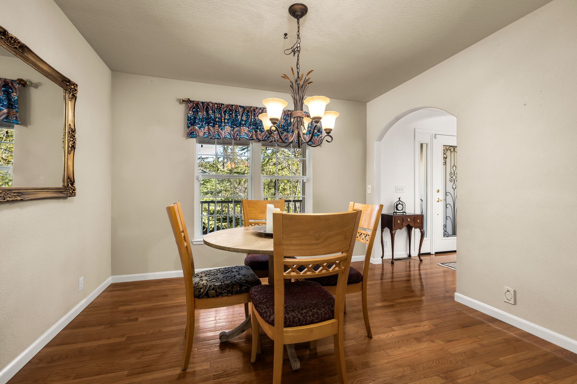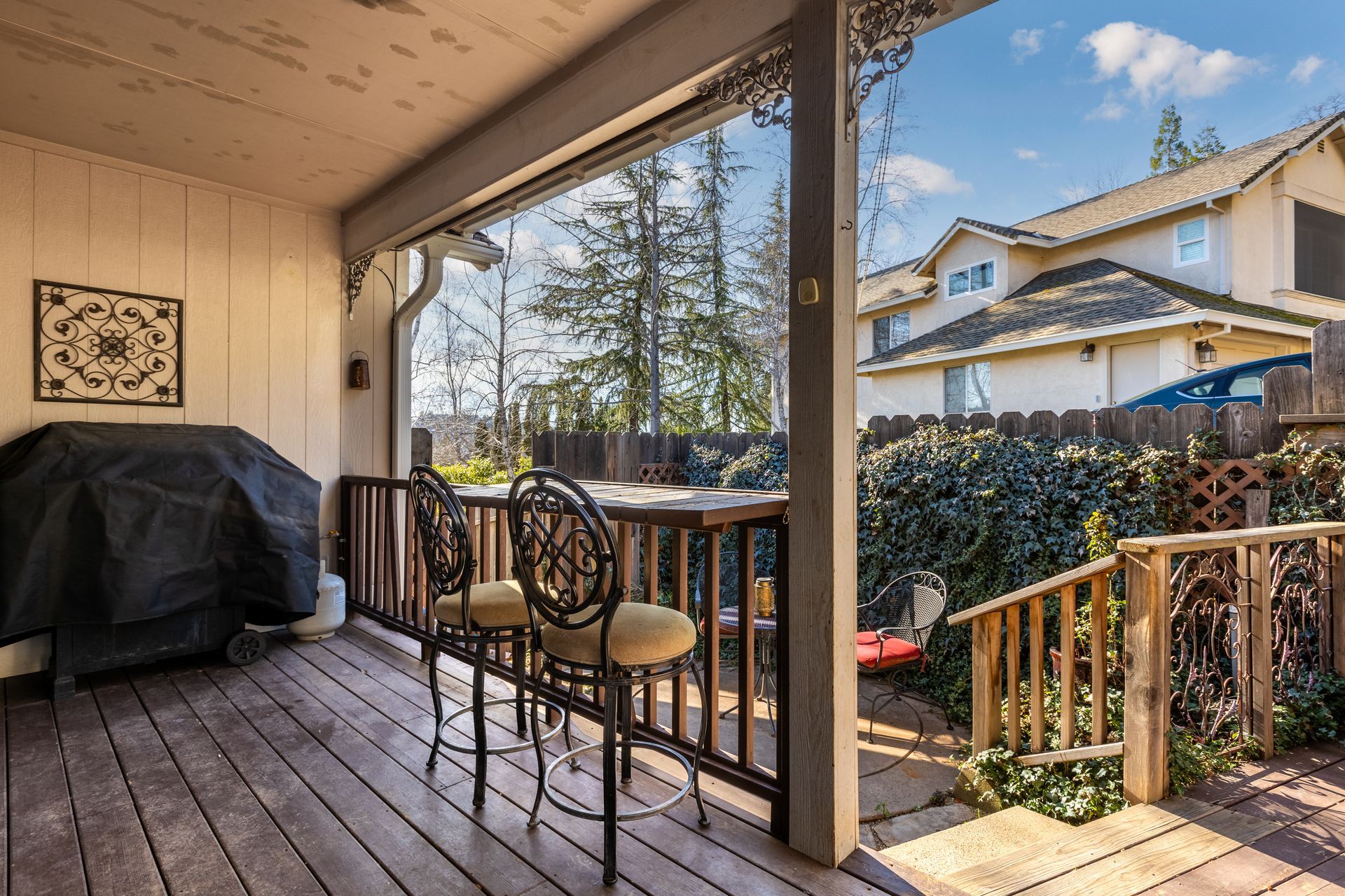 - Dining Nook and Outdoor Dining: Unique silver ceiling and copper pendant light. A back door leads to a covered deck and sitting area with a CableShade canopy, enclosed by an ivy-lined fence with a gated entry to separate the side and back yards.