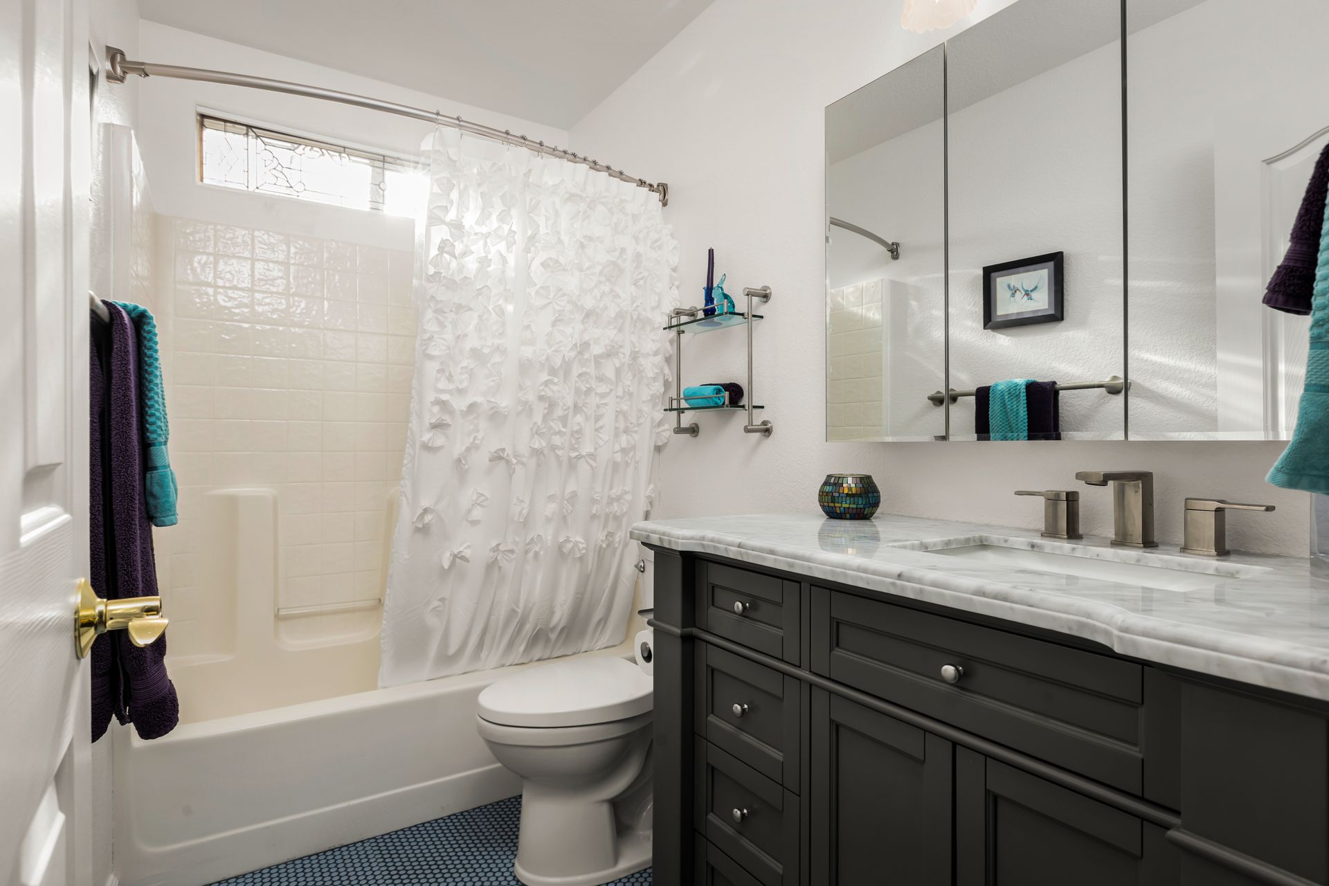 - Secondary Bedrooms & Hallway: Two well-sized bedrooms with hardwood floors and ceiling fans. Also on this hallway is a coat closet by the front door, a large linen closet and a remodeled secondary bathroom featuring a shower over tub, stained glass window, and a vanity with a marble countertop and soft-close cabinets and drawers.