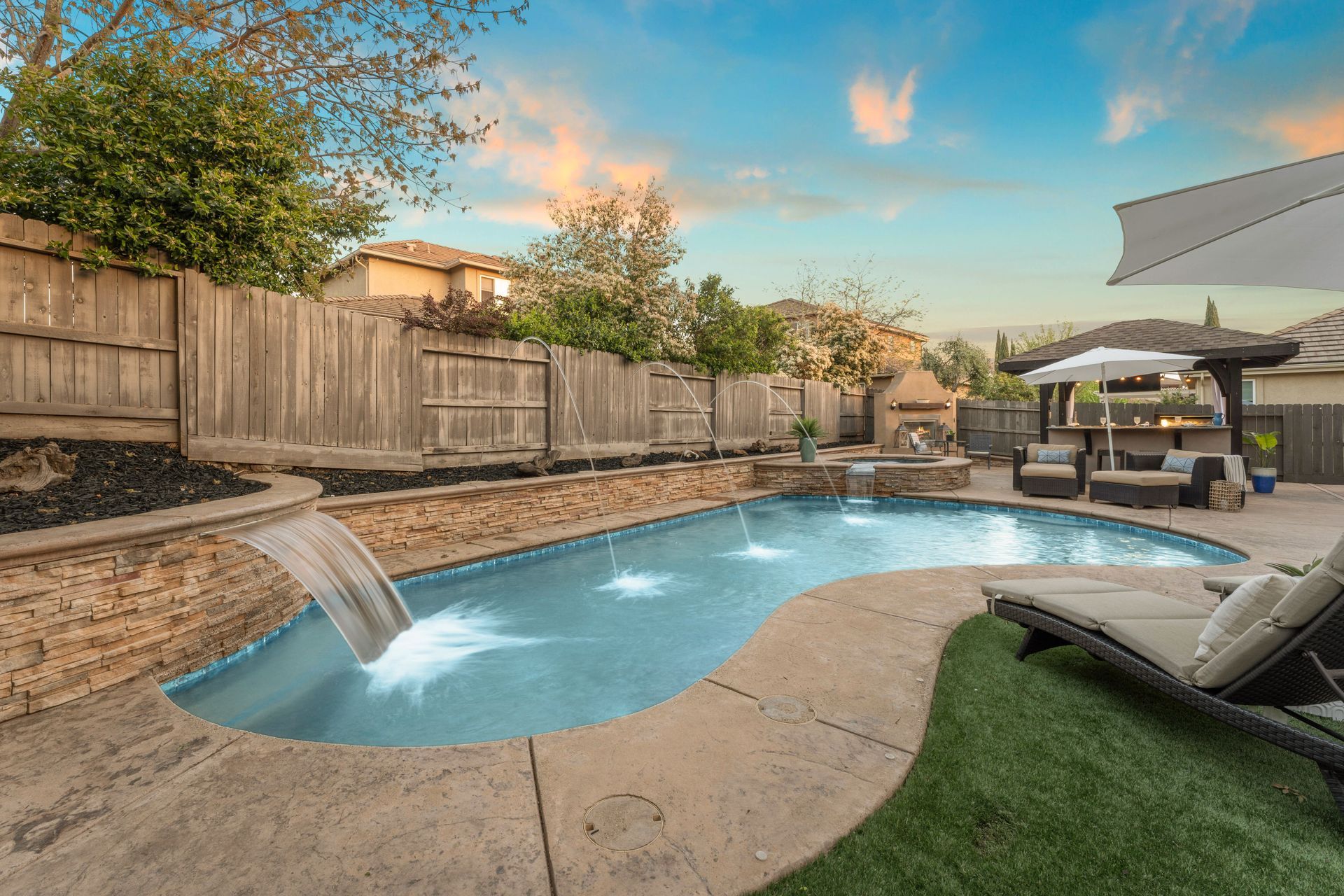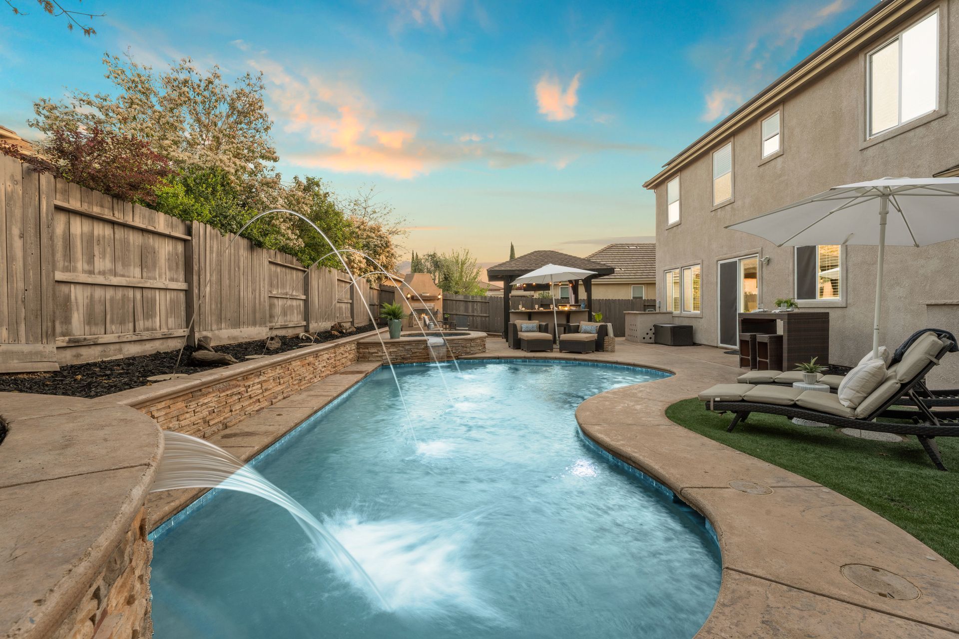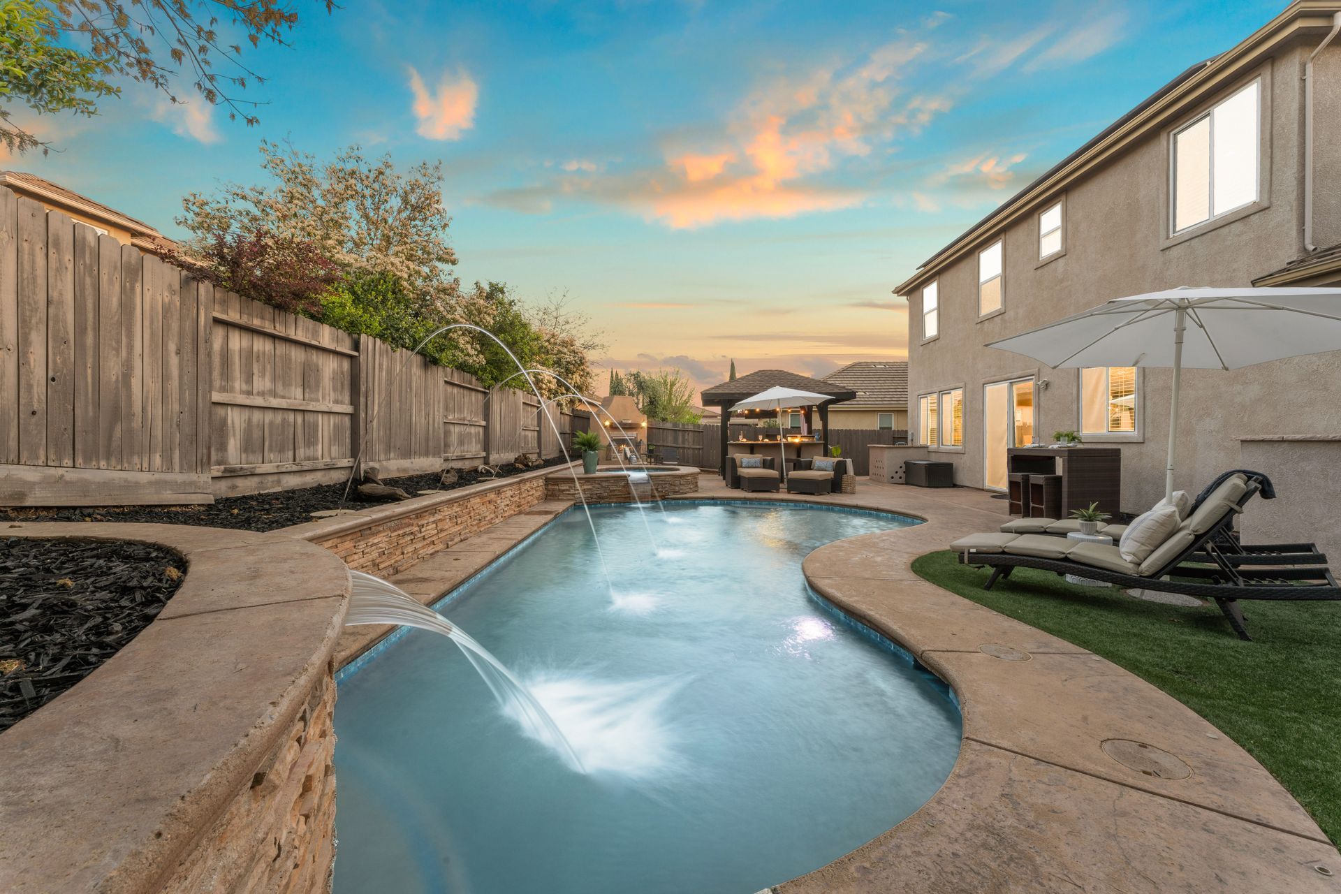 The backyard is a private paradise with a built-in heated, salt water pool with tranquil waterfalls. It also features a spa, a covered outdoor kitchen, a cozy fireplace, turf grass for year-round enjoyment. As a resident of Blackstone, you’ll have access to resort-style amenities, including a state-of-the-art fitness center, sparkling pools, and scenic walking trails. Plus, this home is located within top-rated school districts, making it an exceptional choice for families.