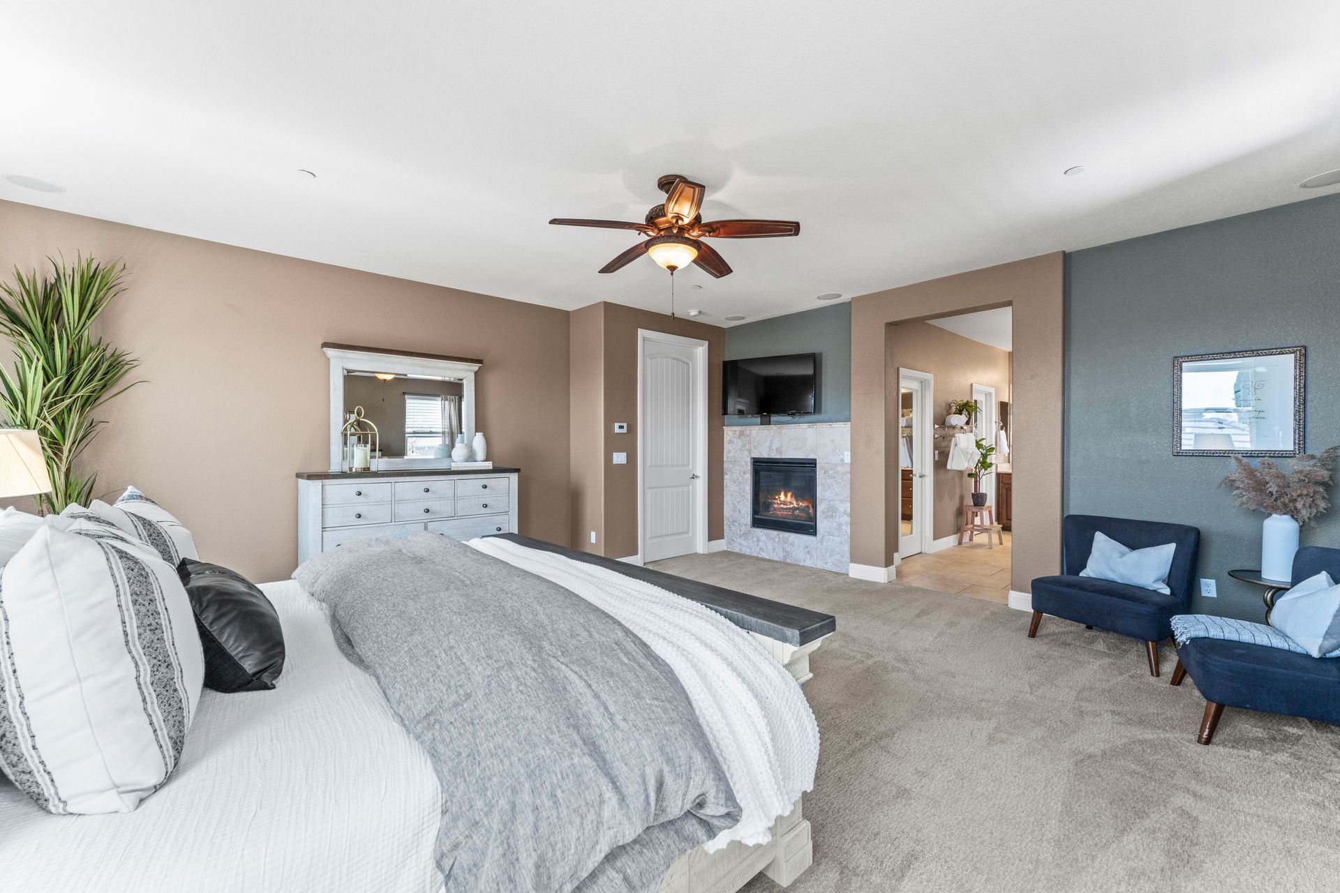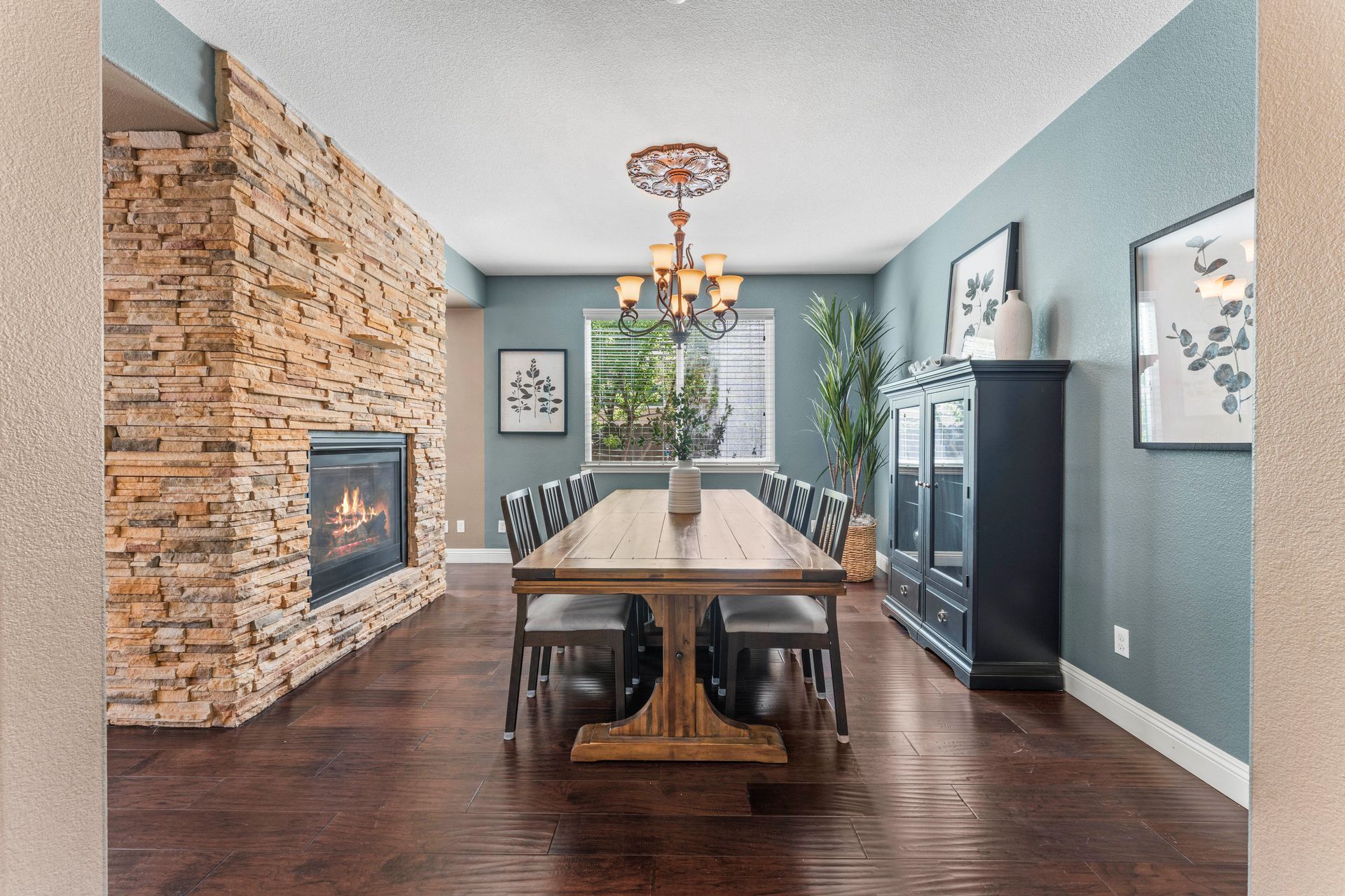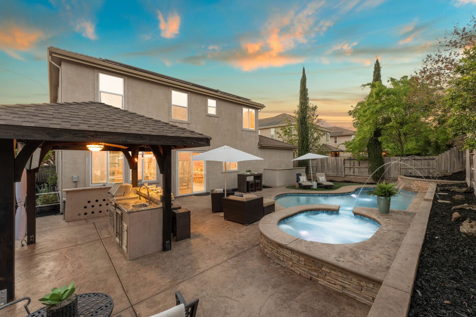 The backyard is a private paradise with a built-in heated, salt water pool with tranquil waterfalls. It also features a spa, a covered outdoor kitchen, a cozy fireplace, turf grass for year-round enjoyment. As a resident of Blackstone, you’ll have access to resort-style amenities, including a state-of-the-art fitness center, sparkling pools, and scenic walking trails. Plus, this home is located within top-rated school districts, making it an exceptional choice for families.