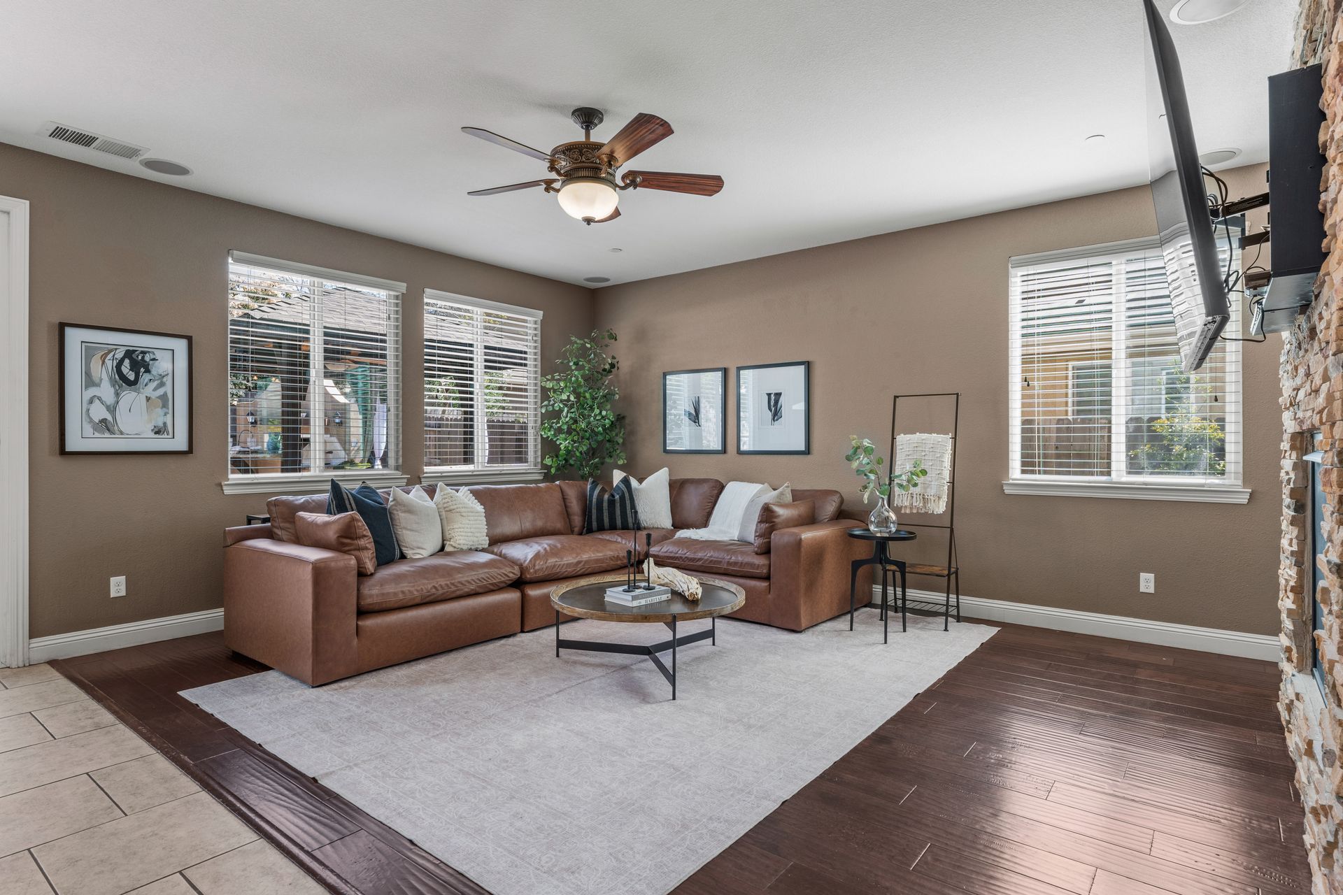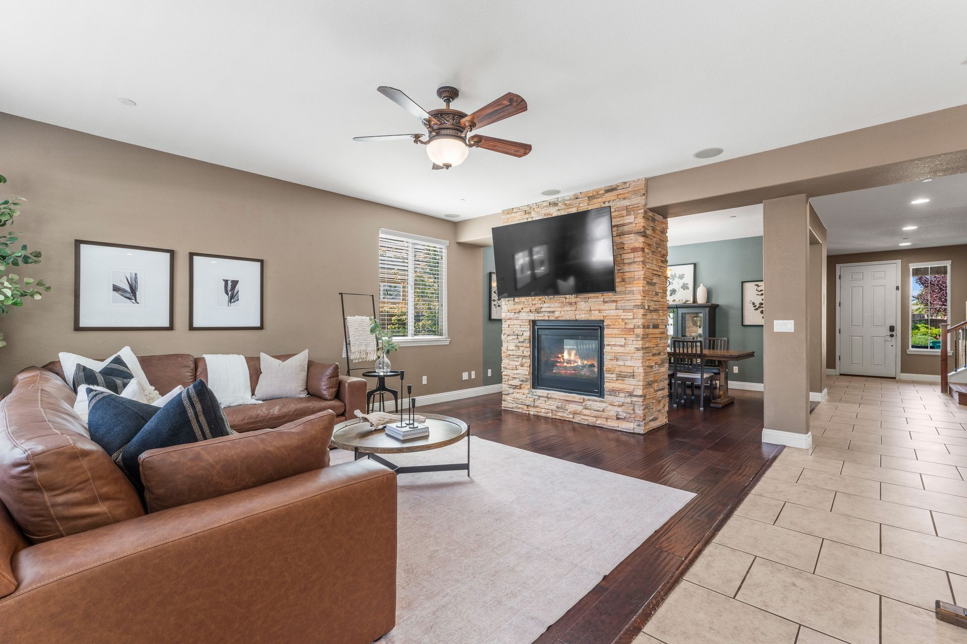 Step inside the main entry to soaring ceilings, an open-concept design, a double-sided fireplace, hardwood floors and an abundance of natural light. The gourmet kitchen is a chef’s dream, with abundant counter space , gas cooktop, double ovens and a large granite island for gatherings.