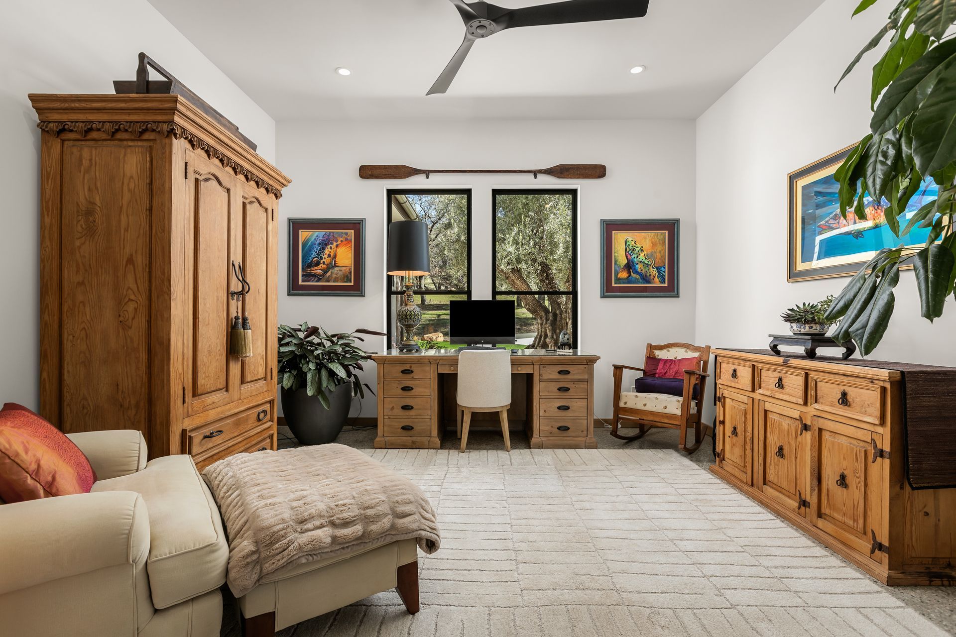 - Spacious room with 10’ ceilings, linear windows along one side and views over the exquisite front and side landscaping on the others