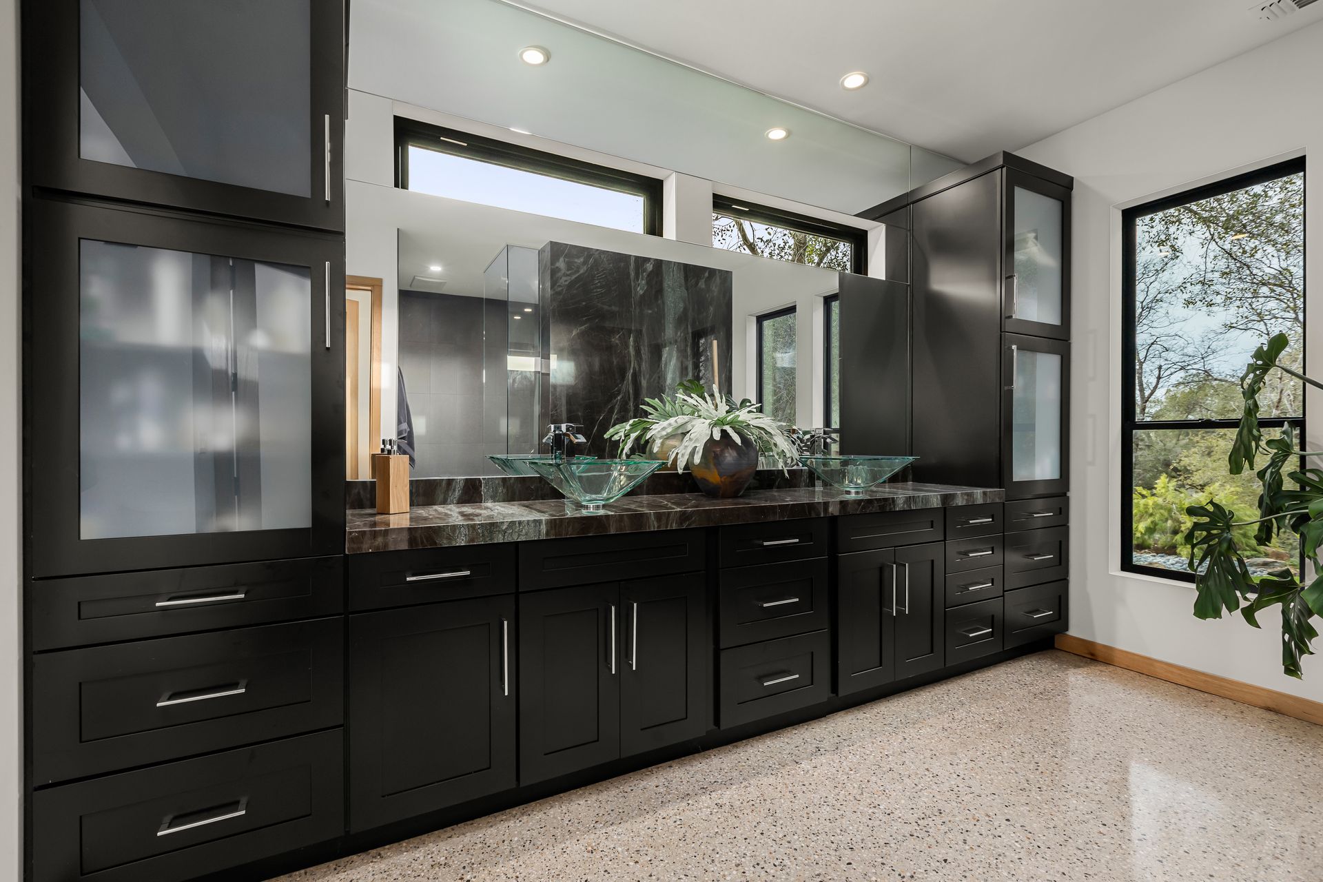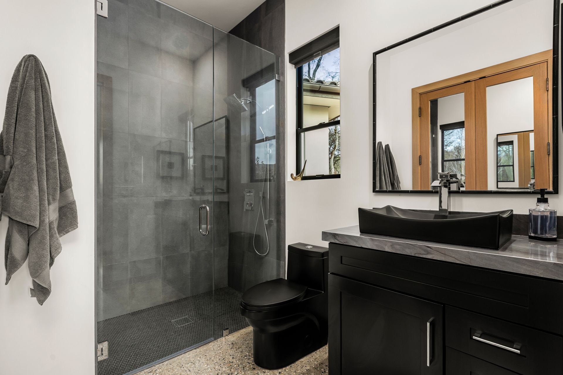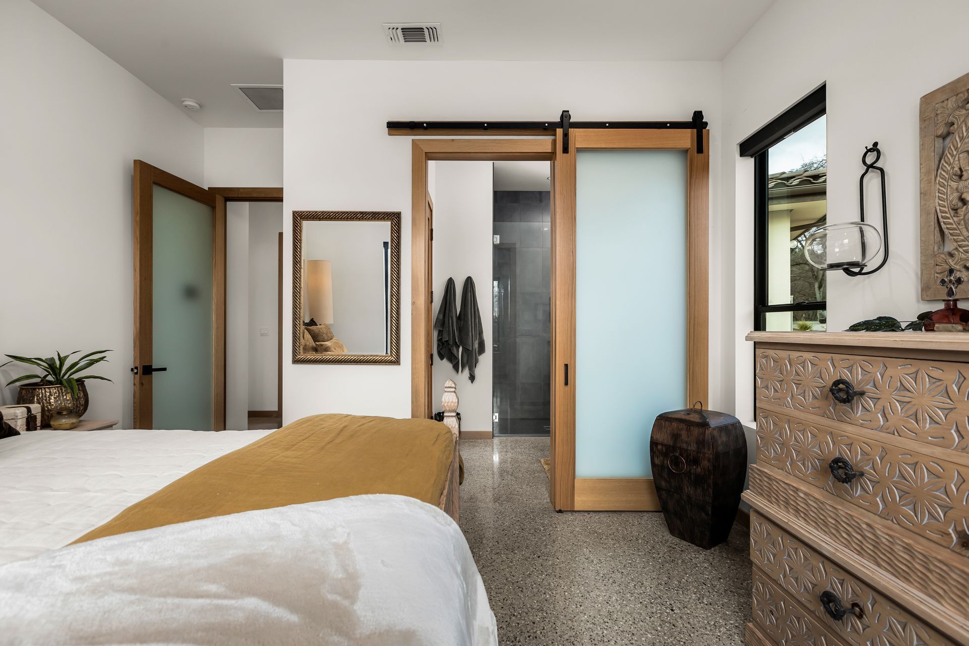 Ensuite is on the opposite side of the home with a White Oak barn door to the bathroom which features an edgeless glass walk-in shower with dual shower heads, a single vessel sink with quartzite countertops and mirror encased White Oak closet doors