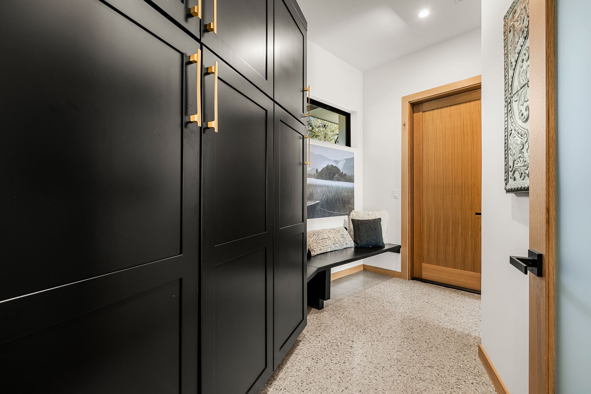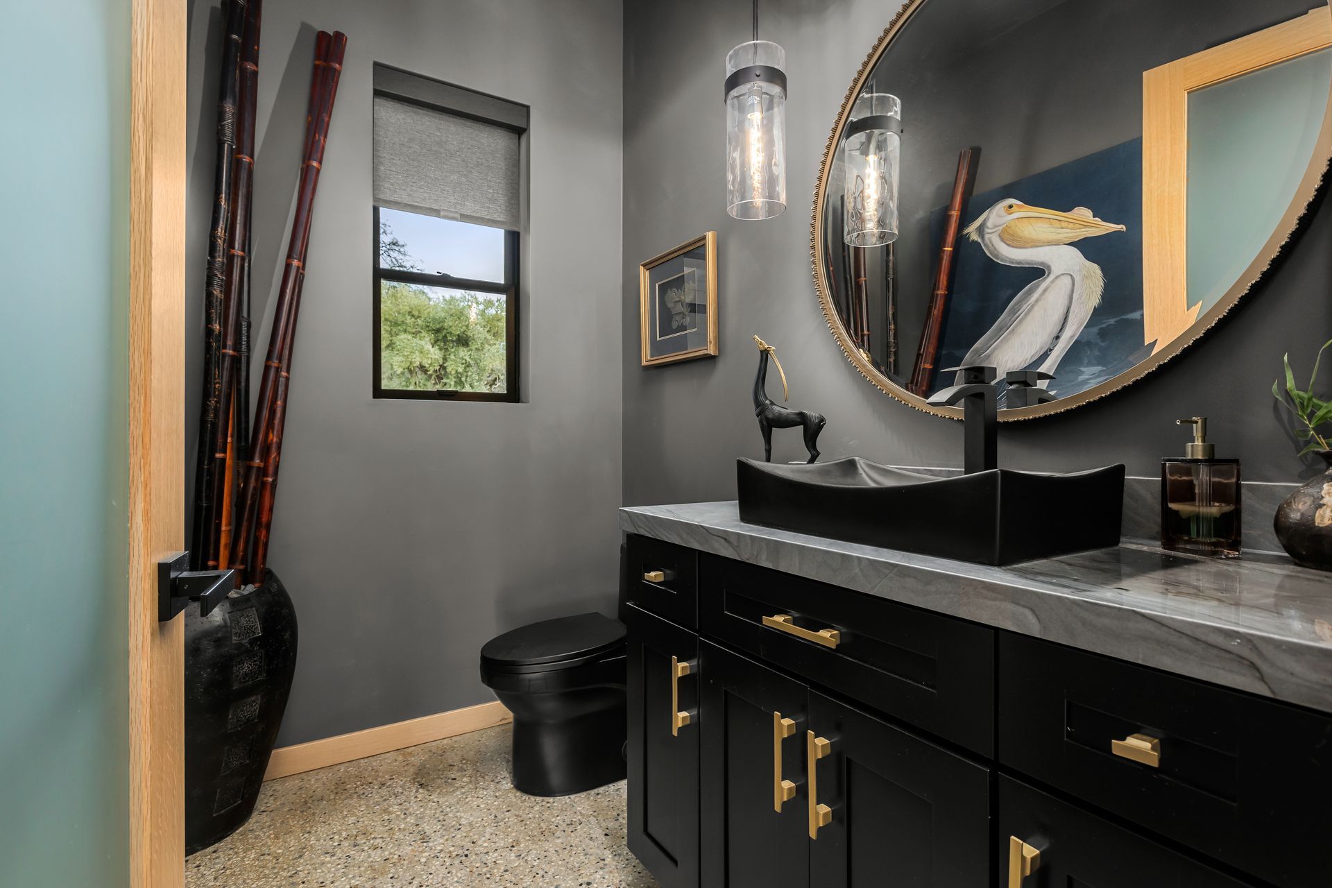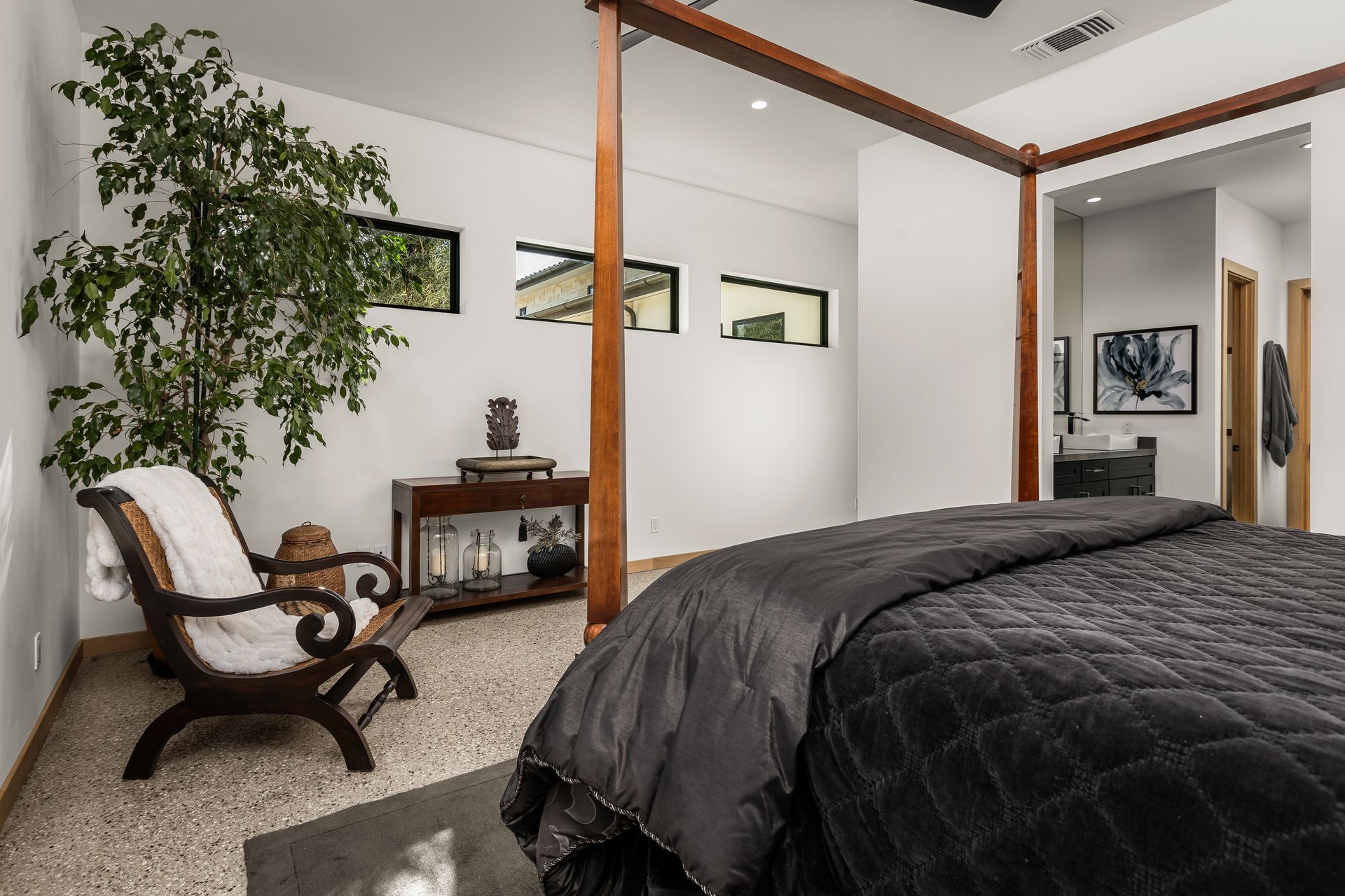 Ensuite is on the opposite side of the home with a White Oak barn door to the bathroom which features an edgeless glass walk-in shower with dual shower heads, a single vessel sink with quartzite countertops and mirror encased White Oak closet doors