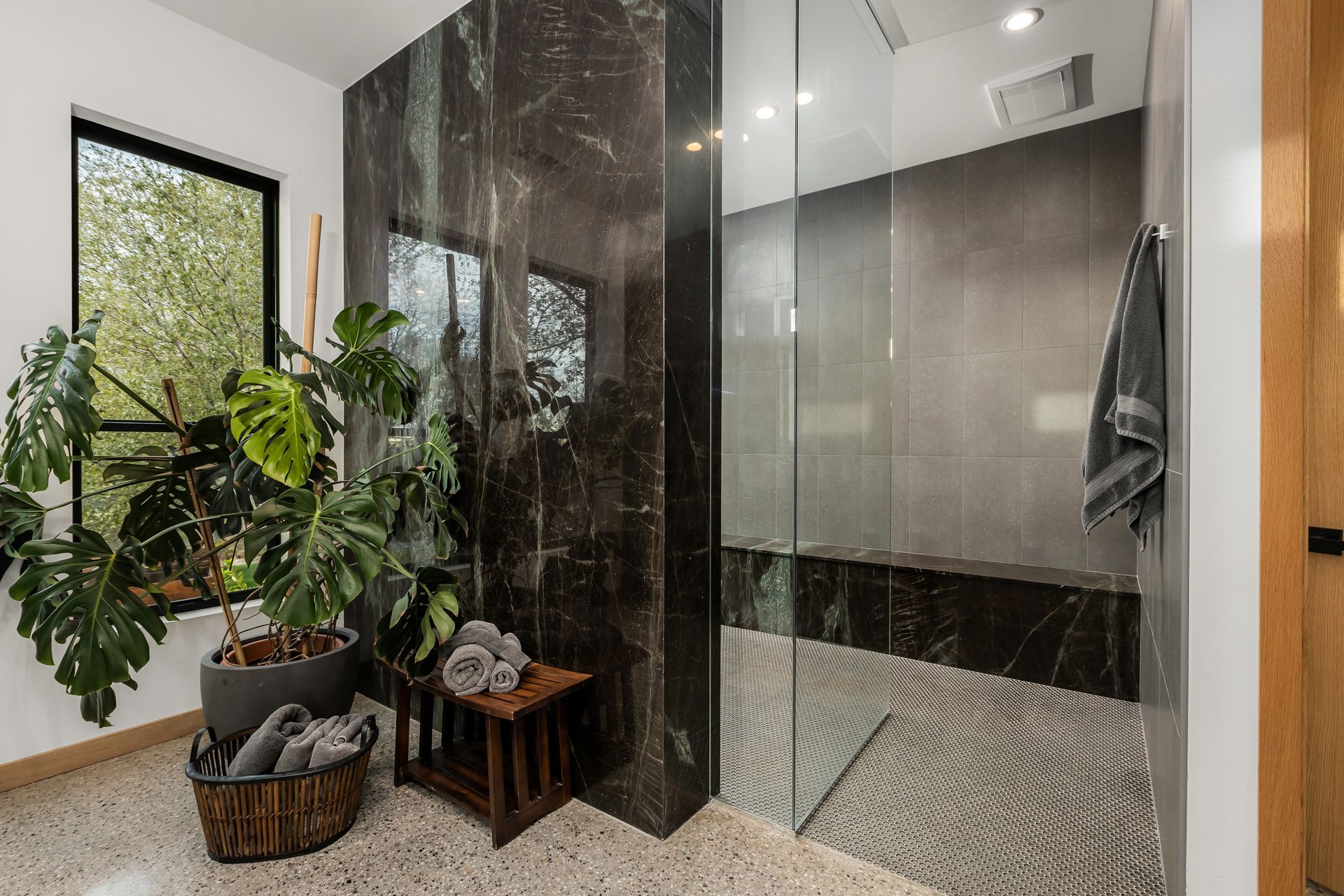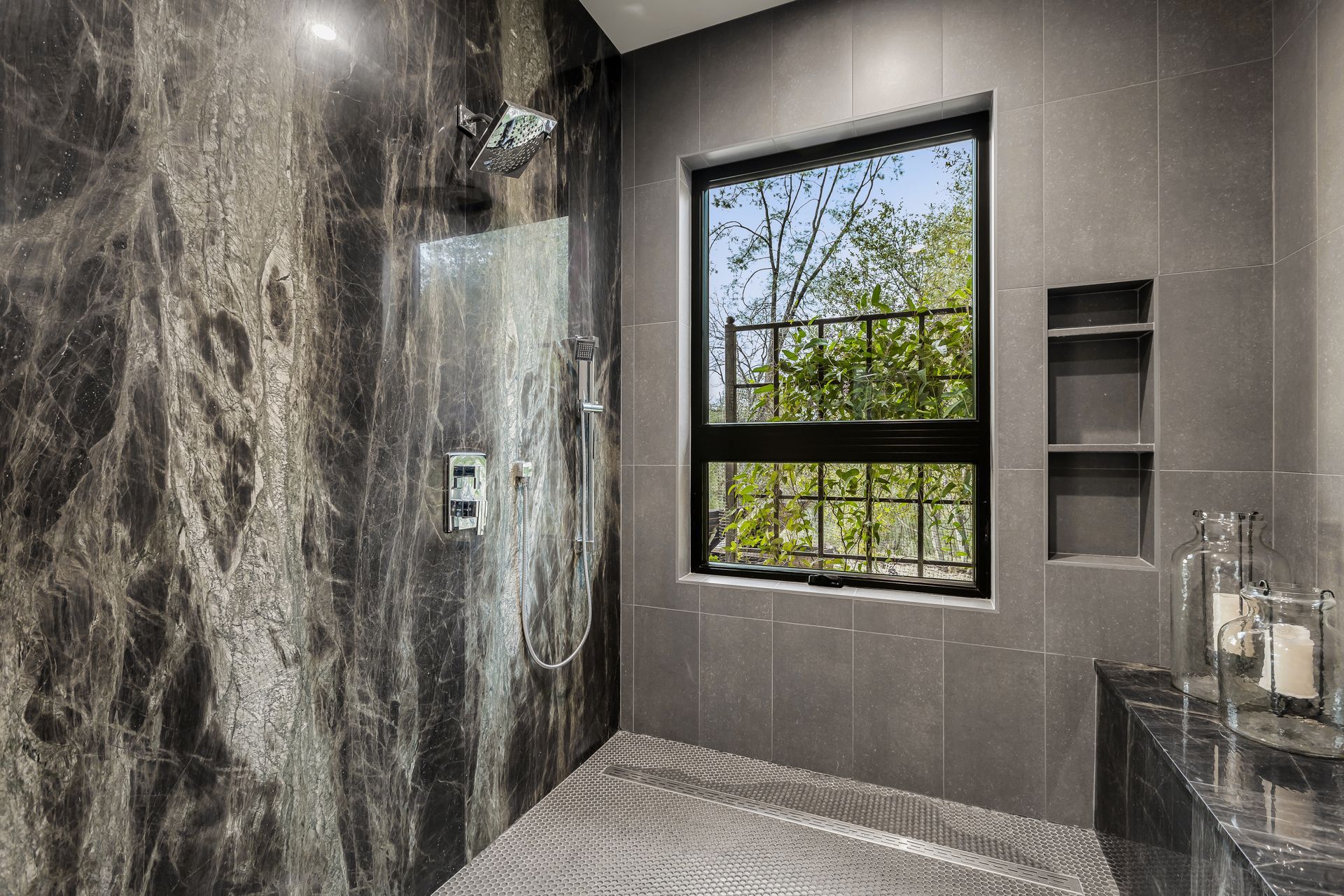 - Spa-like bath with a gorgeous granite floor to ceiling slab wall both in and out of the massive walk-in shower; wall to wall sitting bench and dual shower heads