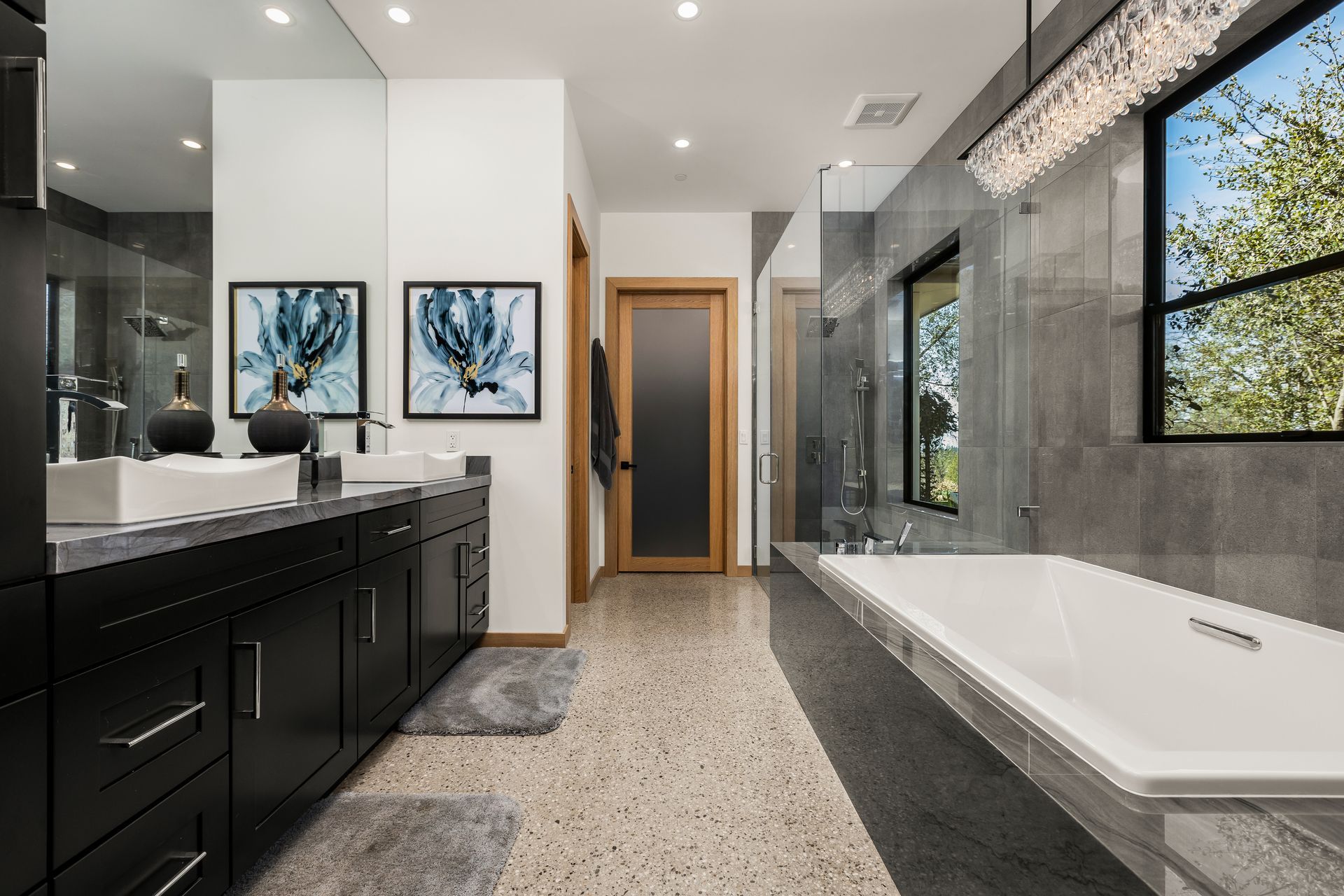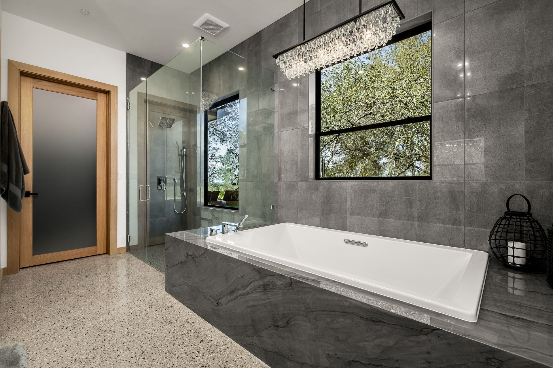 - Spa bath with a soaking tub for two with shower wand and chandelier overhang; edgeless glass walk-in shower with built in seating and dual shower heads