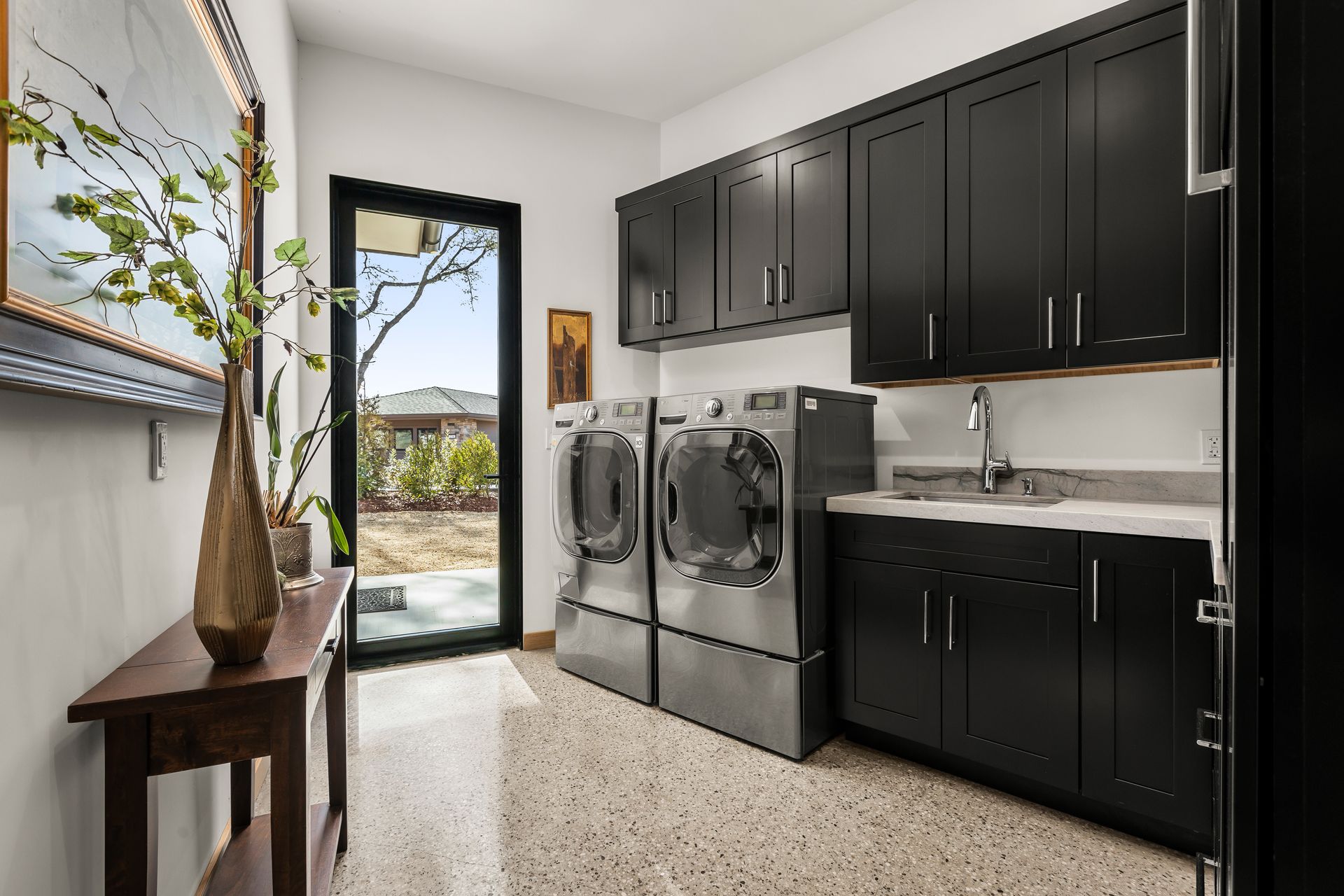 There is also a spacious office, gorgeous guest powder room, a laundry room with cabinetry, sink and glass door to the side yard and a mud room with a sitting bench and cabinetry.