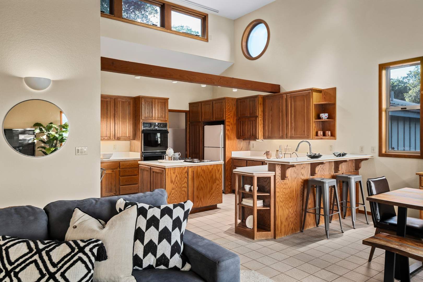 The great room with its vaulted ceiling, incredible views and natural light; pouring in through the natural wood-trimmed windows, welcomes you. The tastefully designed kitchen is a chef’s dream with a center island, double ovens, a pantry, and a dine-up bar. It has all the conveniences for daily meals and it’s open-concept is perfect for hosting guests and entertaining.