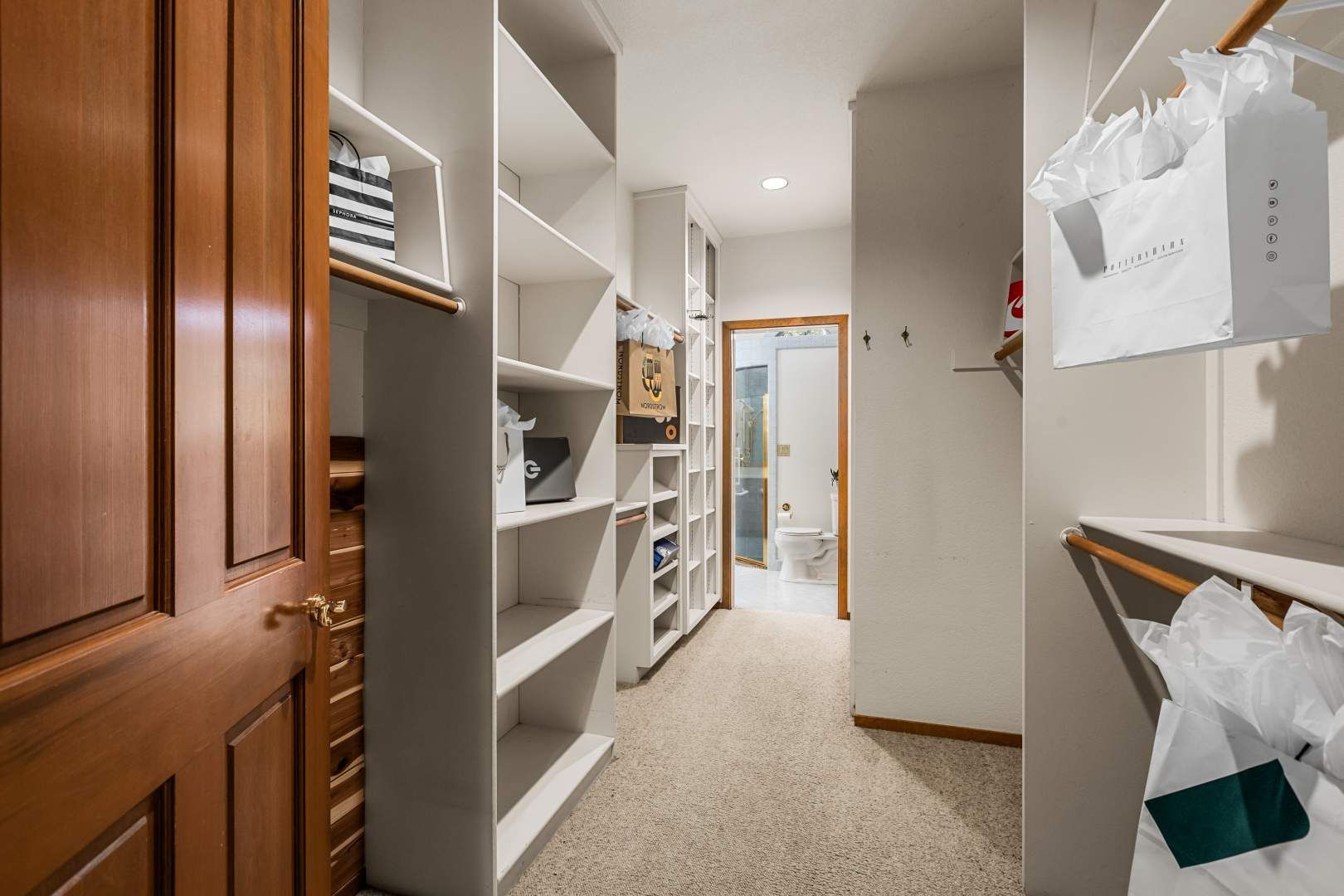 Main primary suite with vaulted ceilings, picture windows, sliding door to private deck, sitting room, large walk-in closet with built ins, bath with dual sinks, large walk-in shower with a beautiful arch window, sitting bench and dual shower heads