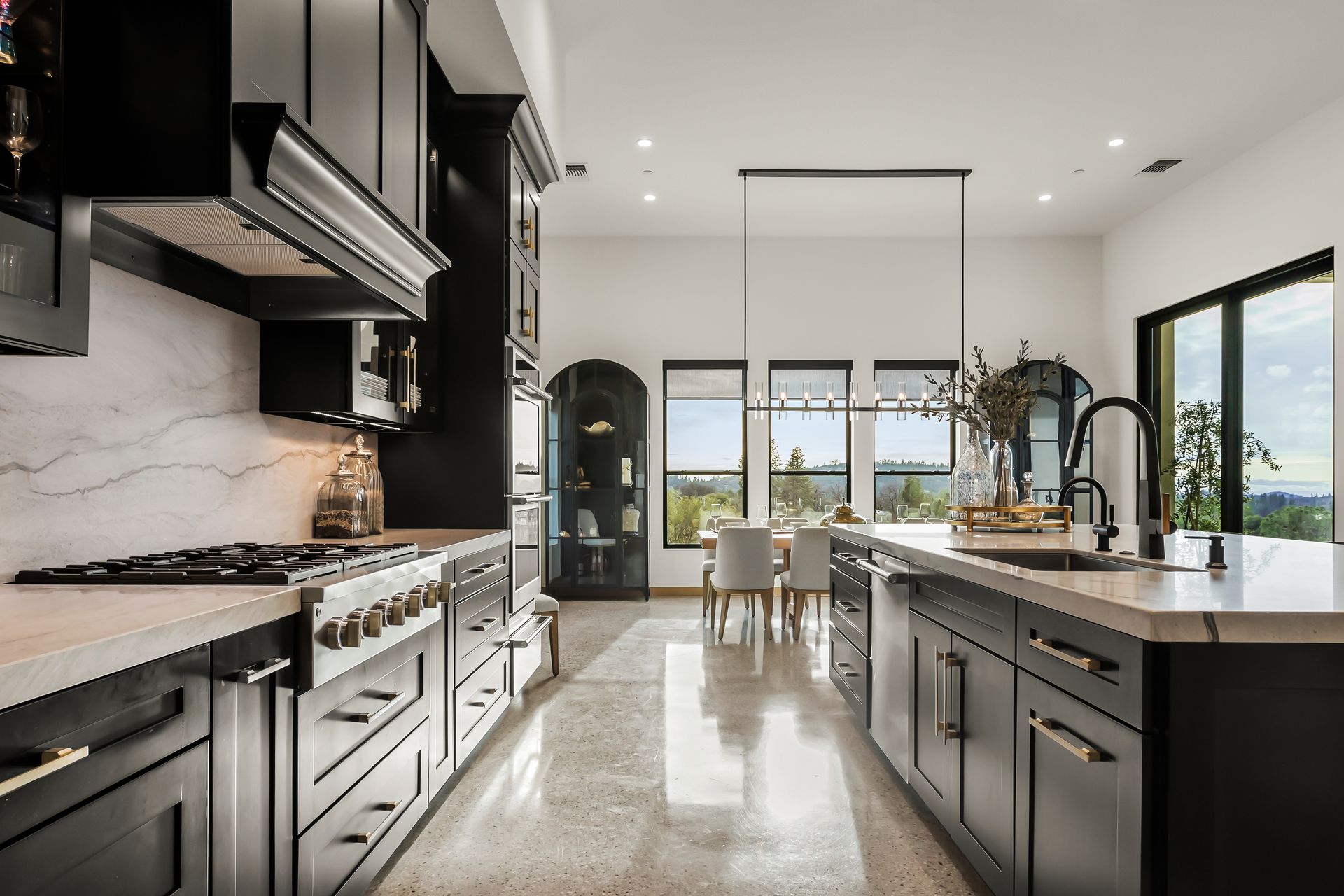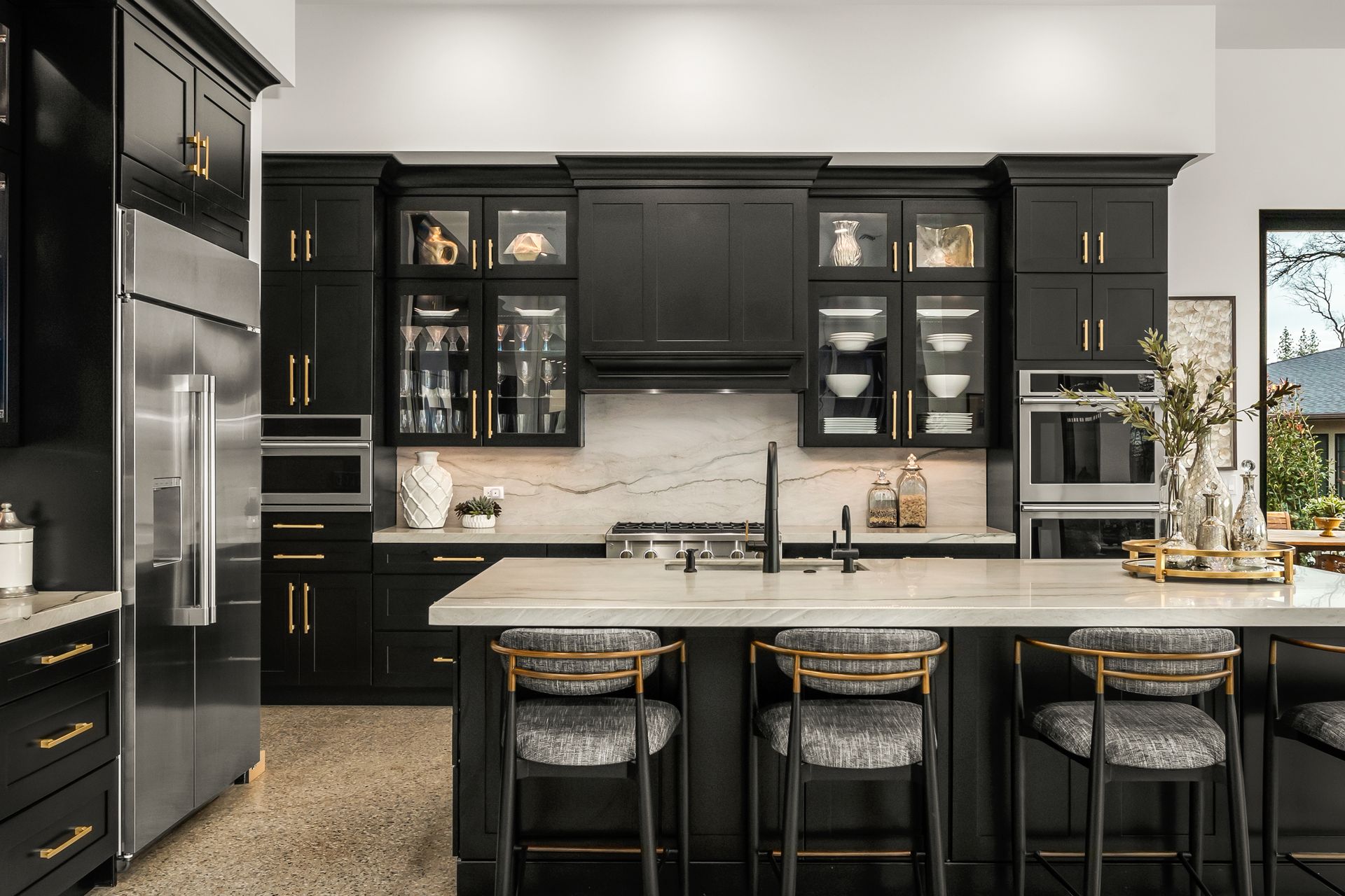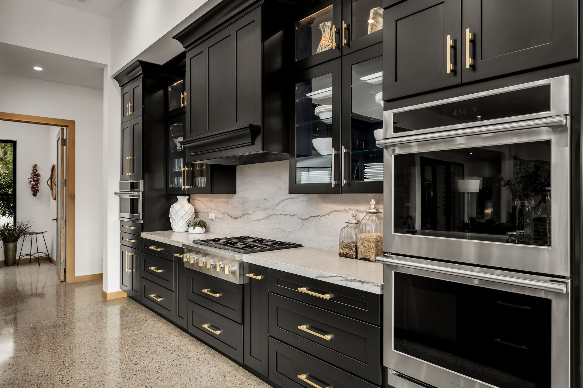 - Cabinetry with soft-close custom-made utilitarian drawers and cabinets with glass showcase uppers