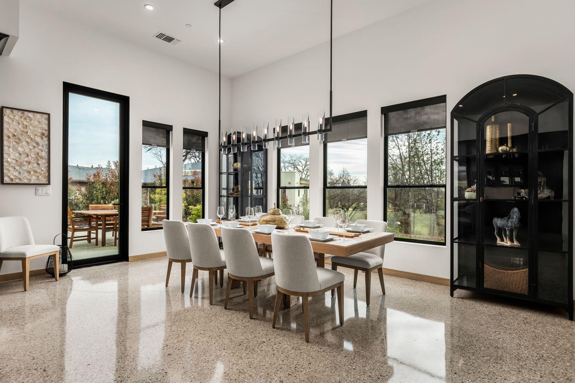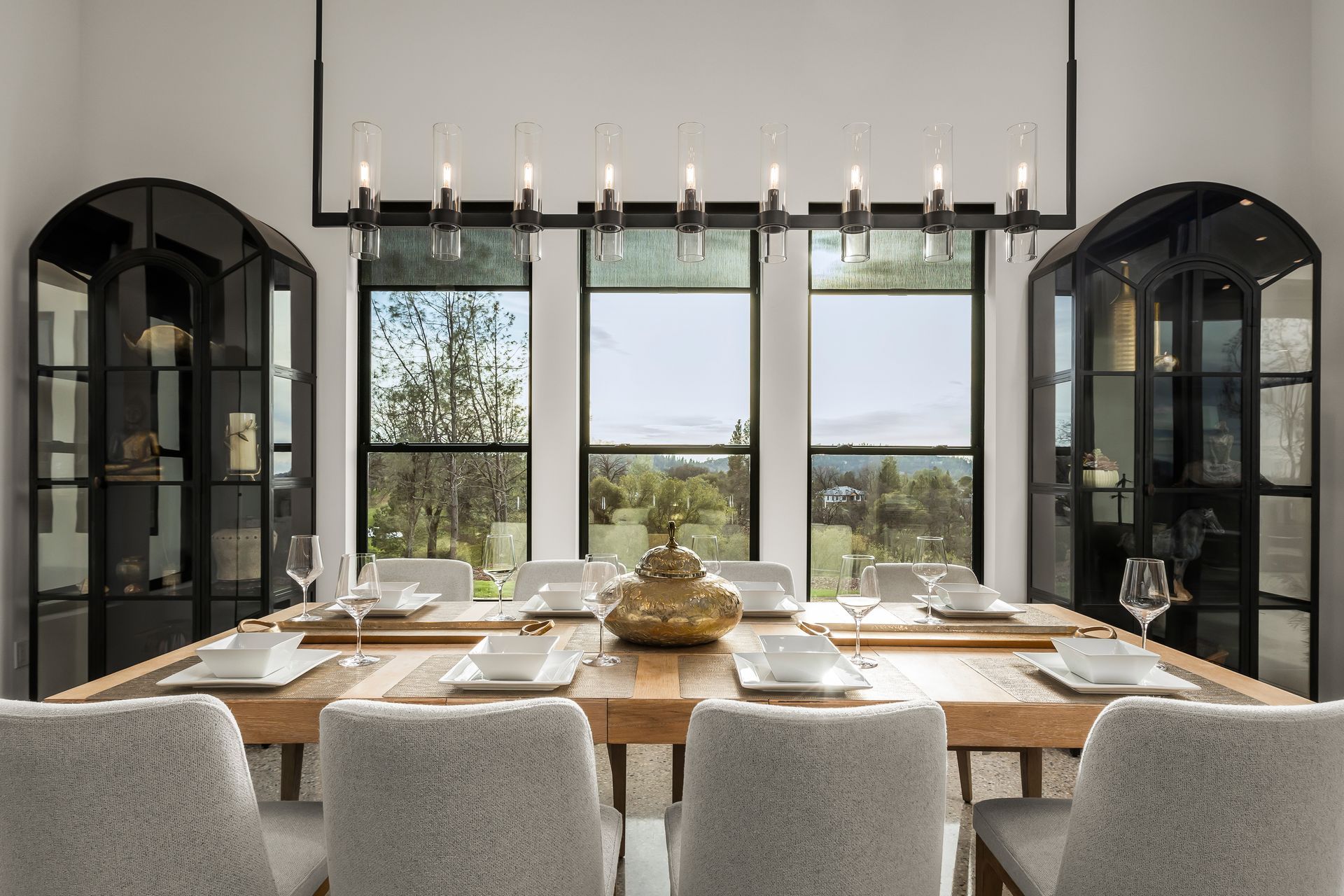 - Formal dining room with linear chandelier and glass doors to flanking patios
