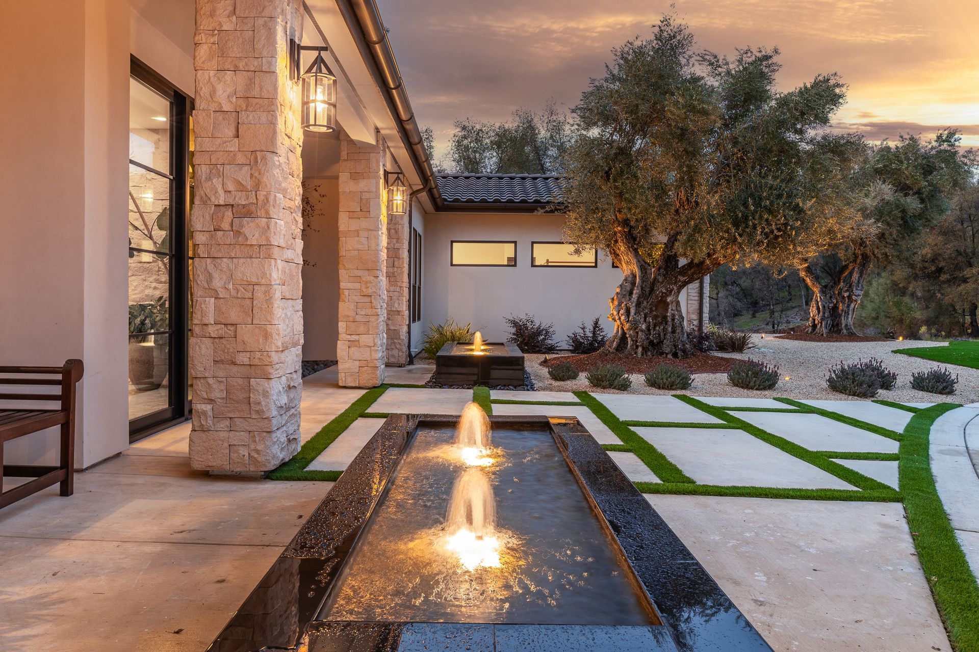 - Dramatic and elegant landscaping with 100+ year old Olive trees, lighting, turf and water fountains