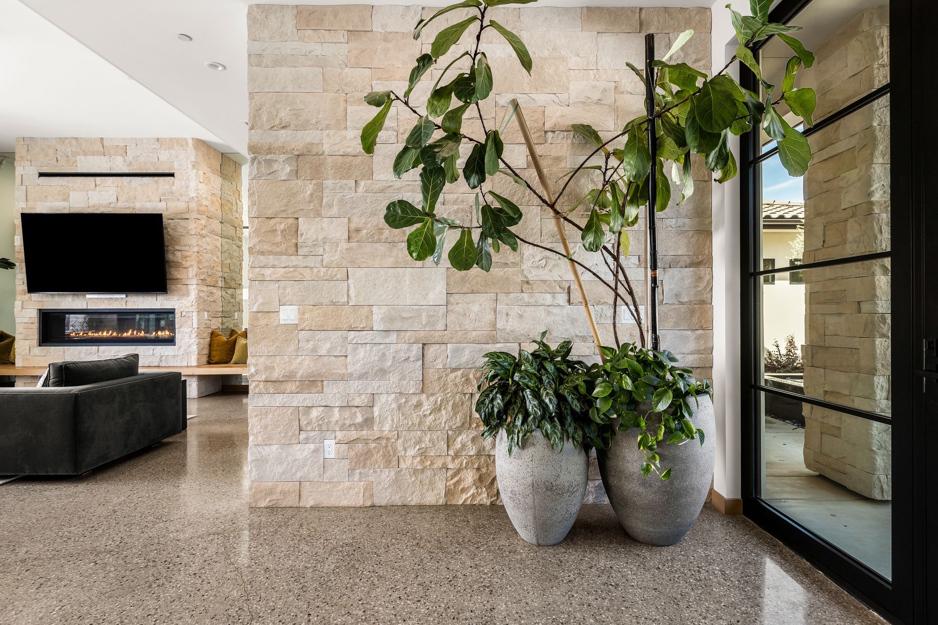 - 12’ Floor to ceiling stone fireplace with a linear gas fireplace and heat wall to actively radiate heat into the room, complimentary white Oak aesthetic decorating bench for visual appeal