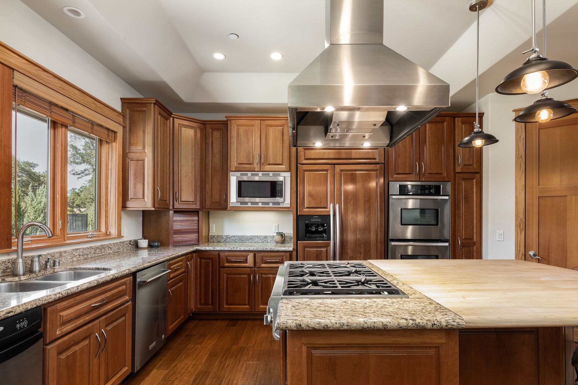 Boasting main floor living and an ideal open floor plan, this home is set up to entertain. The beautiful great room has cathedral wood ceilings with exposed beams and is open to the formal dining area, chef's kitchen and the office/library with gorgeous floor to ceiling built in shelves, cabinets, sitting benches and glass French doors. The kitchen features a 4 person dine up center island with a Thermador six-burner gas cook top and hood. From the great room and the master bedroom, you can step out onto the expansive covered deck to relax, dine and enjoy the views. The backyard can be accessed from the main level master bedroom, office/library and the laundry room, which is just off the kitchen for easy BBQing.