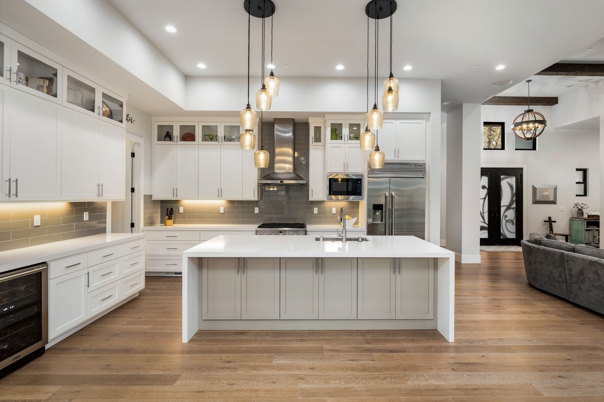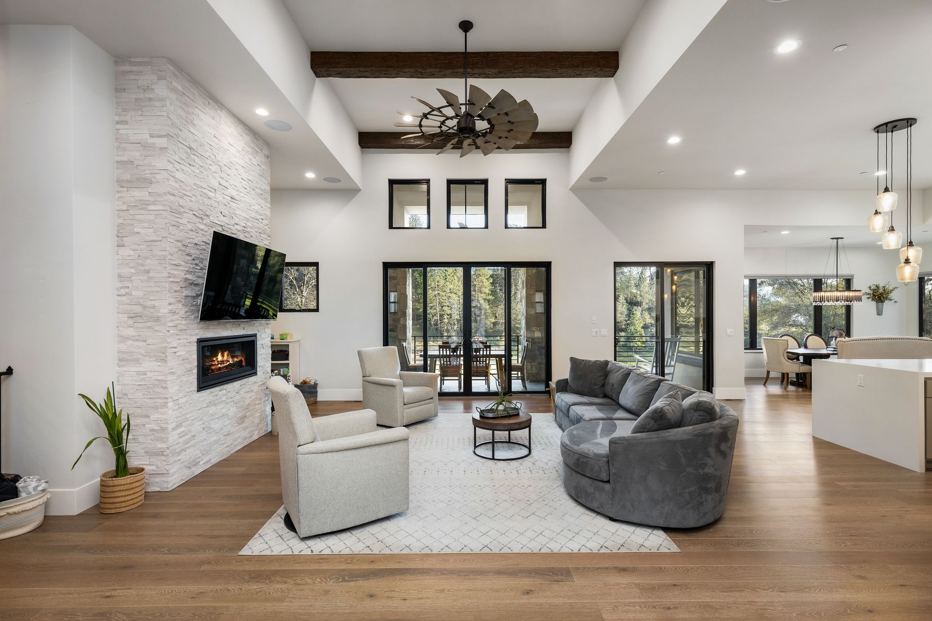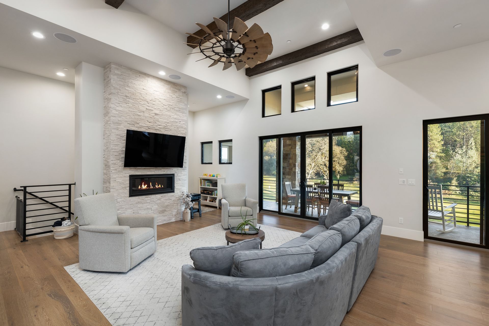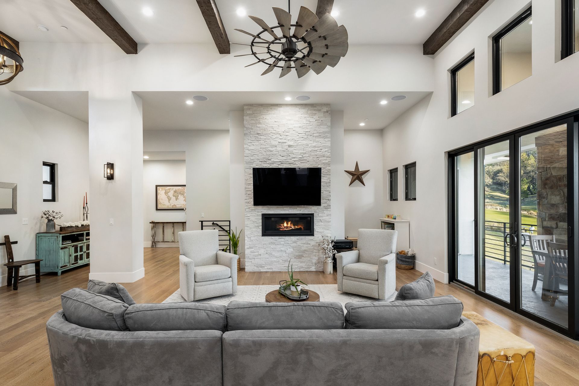 Luxury contemporary finishes include wood floors, abundant sliders and windows, double entry iron door, focal modern fireplaces with stacked ledger stone surround, ceiling beams, designer light fixtures and fans, designer finishes in each bath, custom cabinetry with soft close drawers and doors, quartz counters with waterfall edges, surround sound so much more.