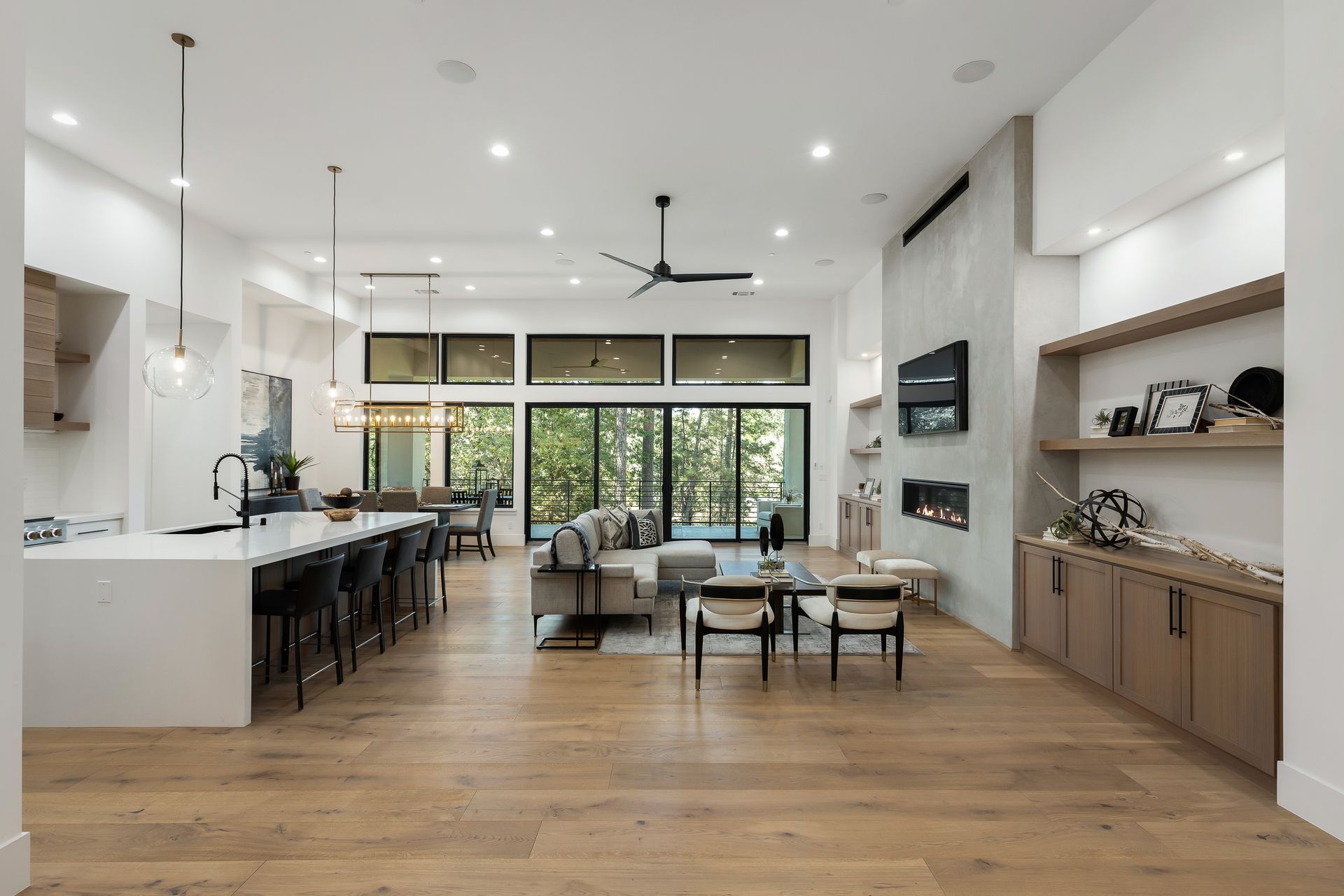 It is easy to enjoy all this home has to offer with an ideal open floor plan and all main floor living! The walls of windows and large double sliding doors bring in beautiful natural light and open to an incredible extra-large outdoor covered deck with knotty Pine ceilings. Luxury appointments include black framed windows and sliding doors, high quality 9-inch plank wood floors and stairs, a modern linear fireplace, designer light fixtures and pendants, OWNED solar, beautiful tile accent walls, quartz counters, custom cabinetry, 2 surround sound systems, a 3-car garage with lifetime epoxy floors, and so much more!