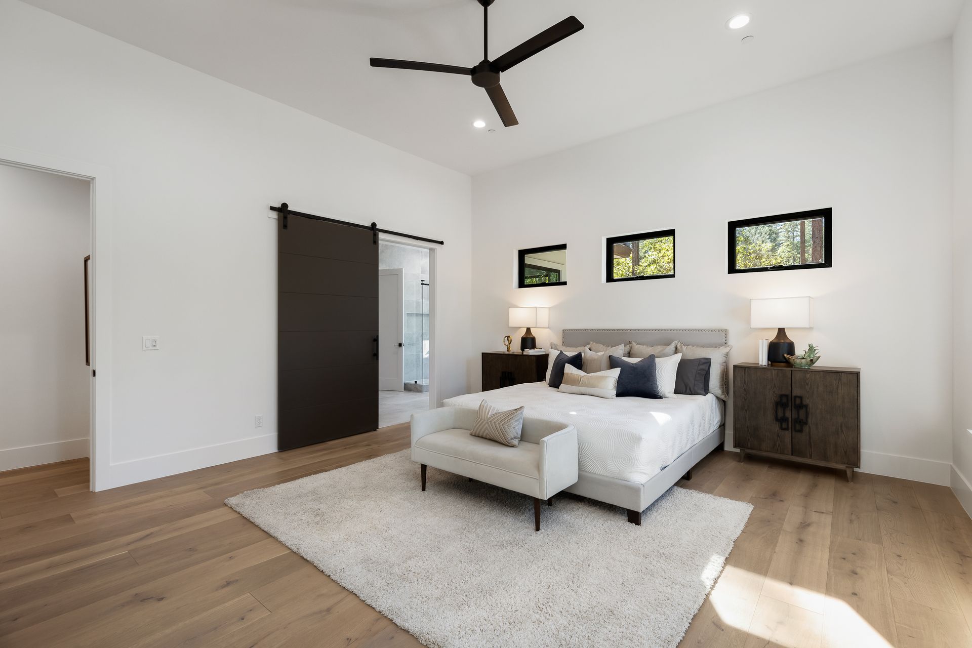 The master suite is located on its own wing and boasts a spacious master bedroom with a door to the deck and large picture windows for the views. A barn door leads to the en suite bath with floor-to-ceiling tile accent walls, 2 vessel sinks, quartz counter, soaking tub, a walk-in shower with multiple shower heads, and a large walk-in closet with a door to the laundry room and full bath, off the garage. This laundry room has abundant cabinetry and includes a dog shower area. The full bathroom, off the garage was designed so you could access it directly from the garage to clean up before entering the home.