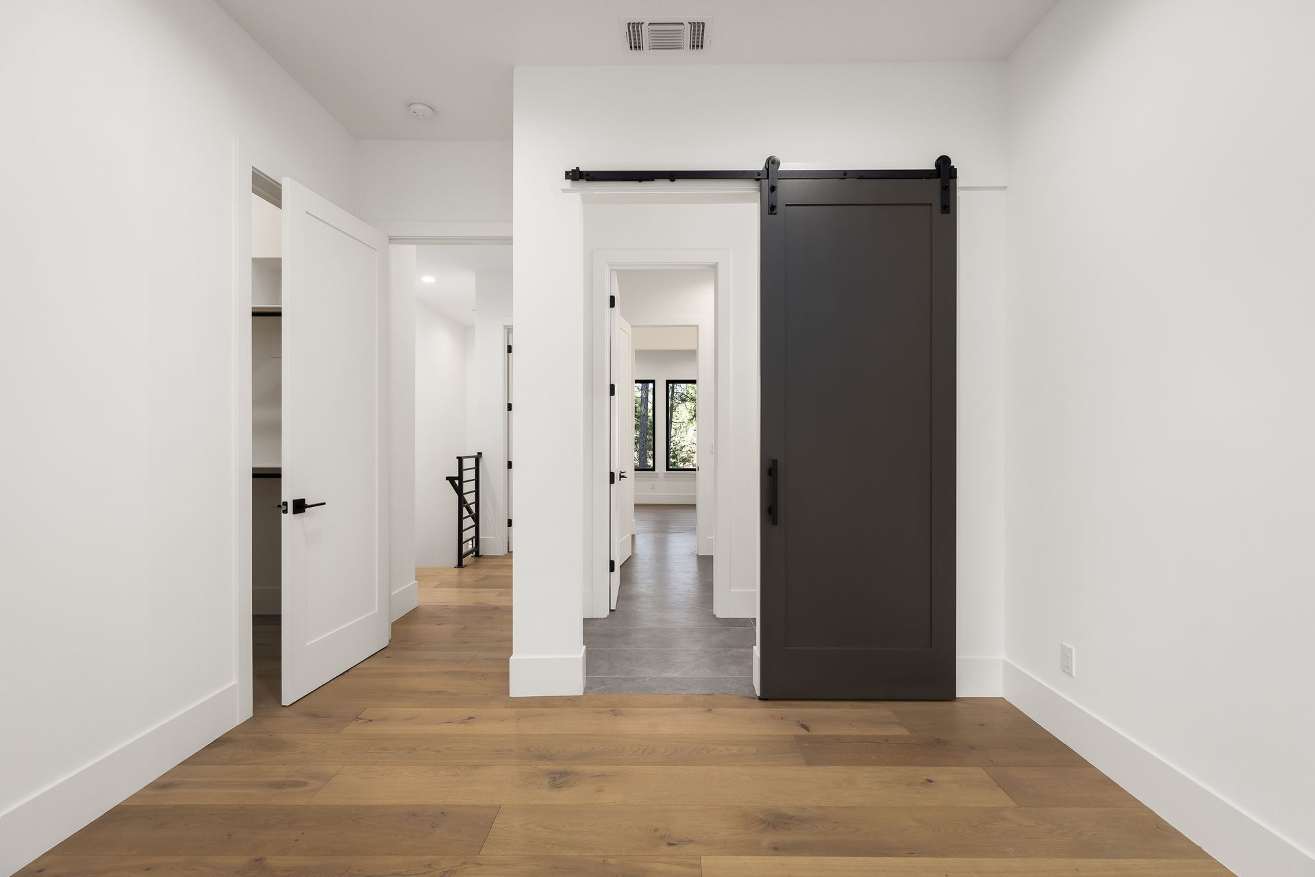 The formal entry is flanked by an office (with outside access off the exterior entry area) and a sitting/music room which could be a second office (with a built-in accent wall). Jack-n-Jill bedrooms complete the main floor and are on the opposite side of the master. Each bedroom has a walk-in closet and a barn door to its own sink area. Privacy doors separate the shared shower over tub and toilet.