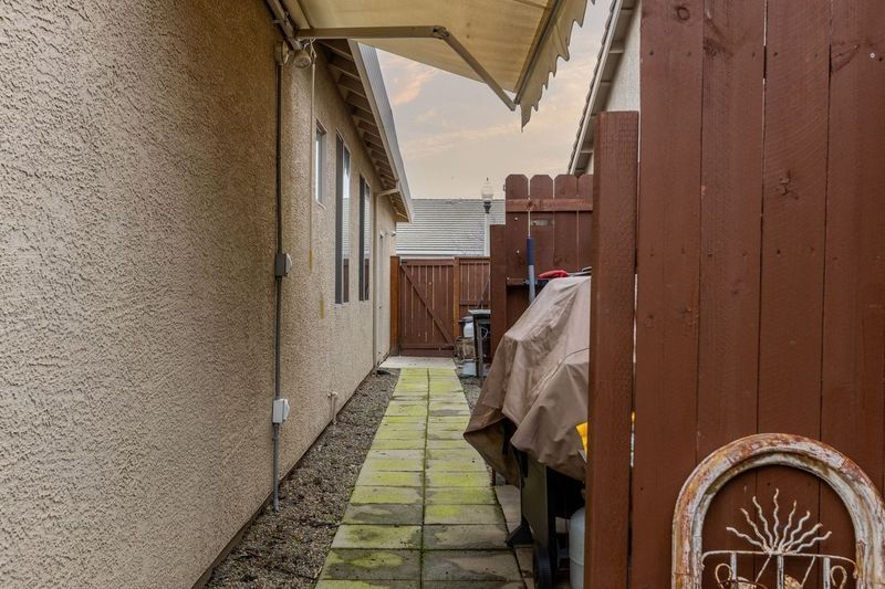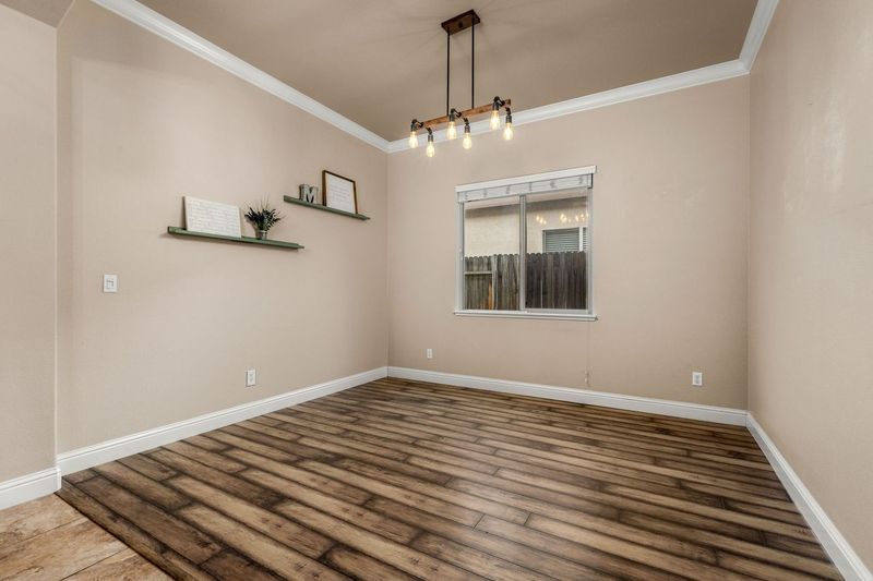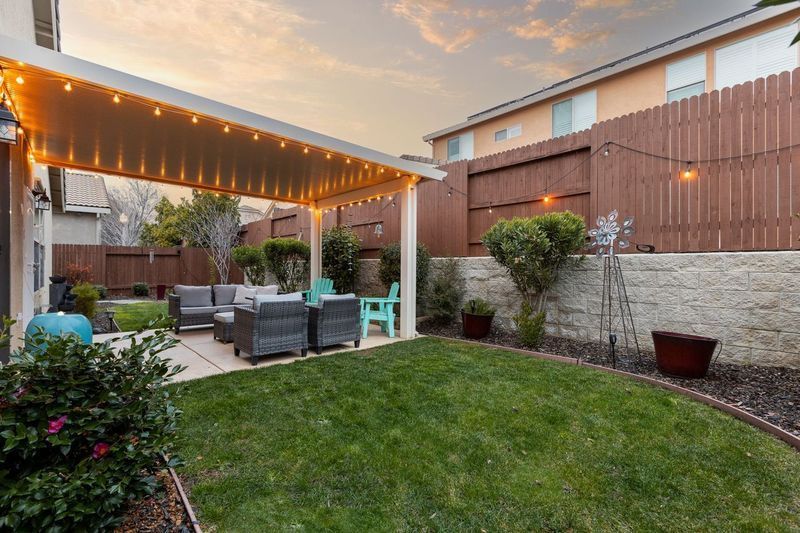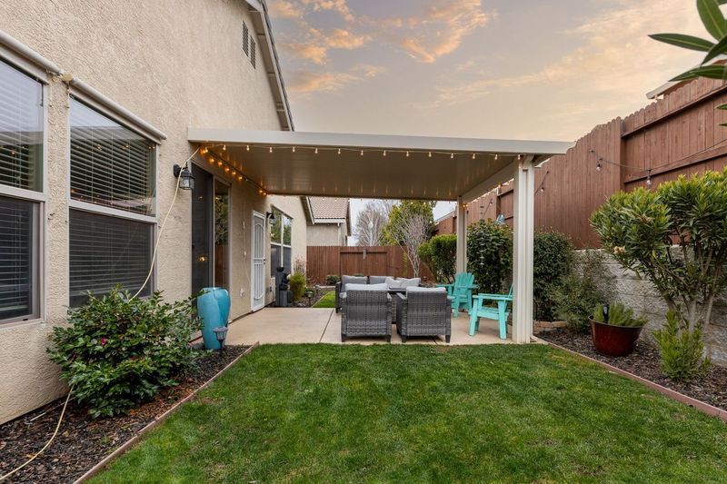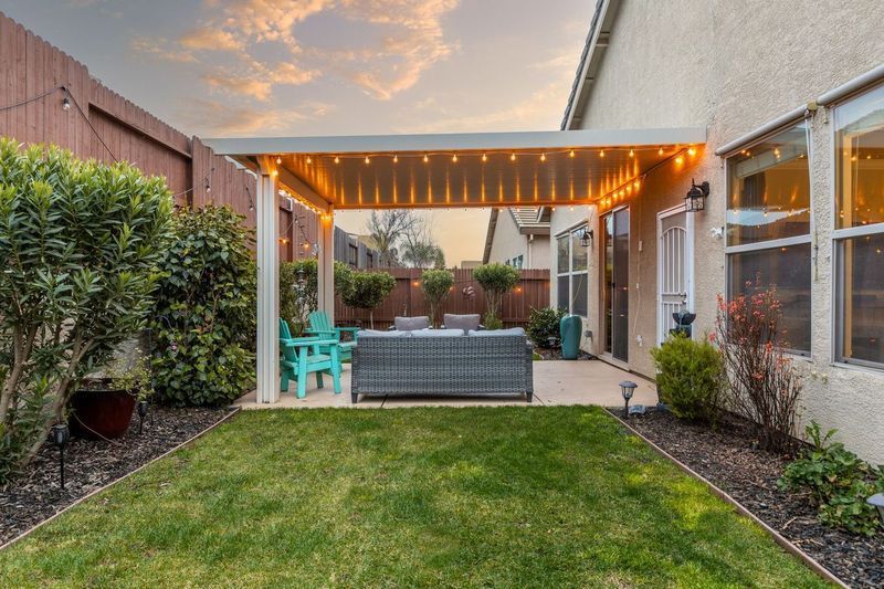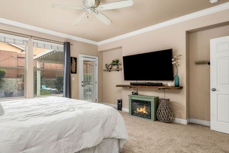 Step inside from the front porch into the formal entry and be greeted by soaring 10-foot ceilings, elegant crown molding, and an arched hallway leading to an inviting open layout. The great room features durable laminate flooring, a cozy gas fireplace, and a sliding glass door that leads to the private, low-maintenance backyard with a covered patio—perfect for relaxing or entertaining. The backyard also features a raised planter on one side of the home and an awning that covers the BBQ area on the other.