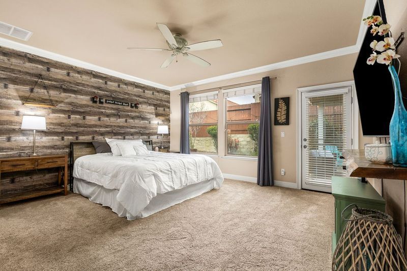 The spacious primary suite offers a peaceful retreat with private outdoor access, a huge walk-in closet, dual vanities, a soaking tub, and a walk-in shower. A junior suite features its own full bathroom and walk-in closet, and the third bedroom is located at the front of the home, adjacent to a full hall bath with a shower-over-tub.