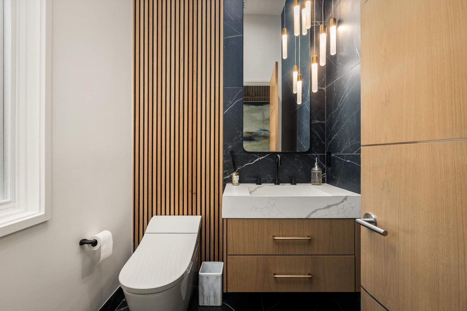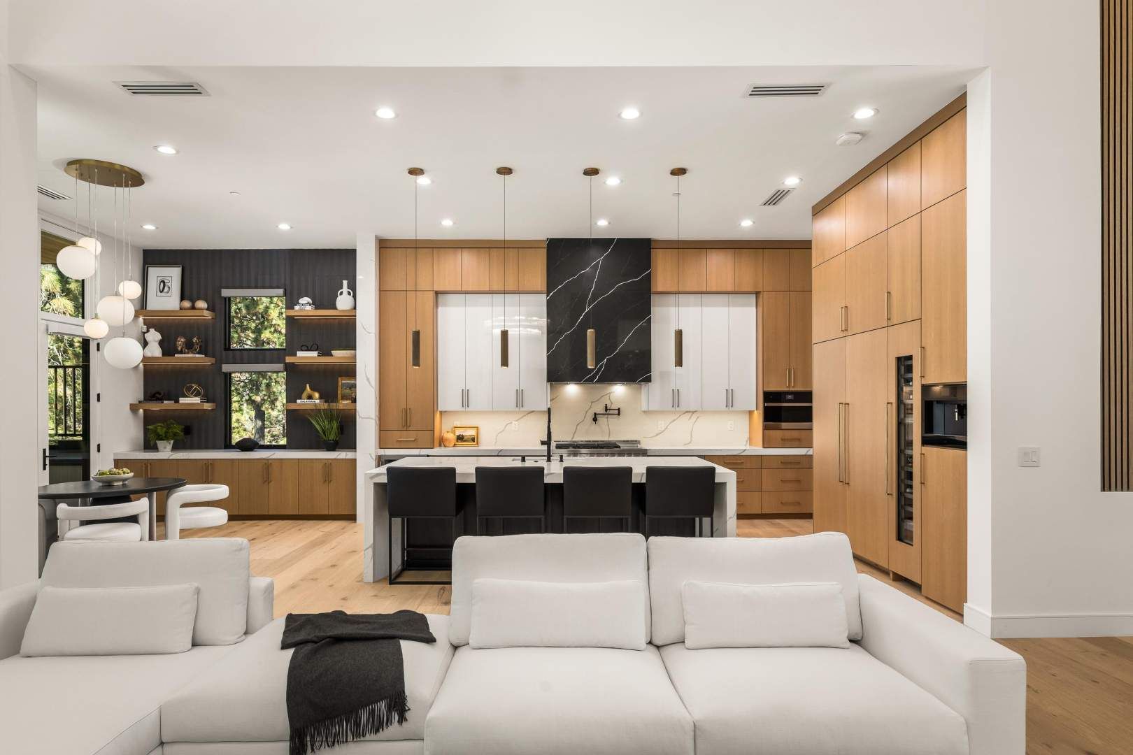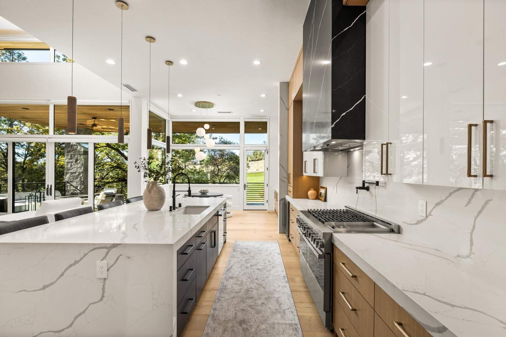 Sophisticated finishes and uncompromising quality incorporate a variety of textures like European wood slats and white Oak wall paneling, quartz and porcelain Italian full slabs, wide-plank European oak flooring, custom white Oak cabinetry, white Oak doors, concrete ceilings, and a floating staircase with white Oak stair threads and glass stairwell railings. These unique designer chandeliers are truly incredible and demand attention like the 8-foot dining chandelier, the 5 ft x 5 ft stairwell chandelier, custom alabaster stone chandeliers and more.