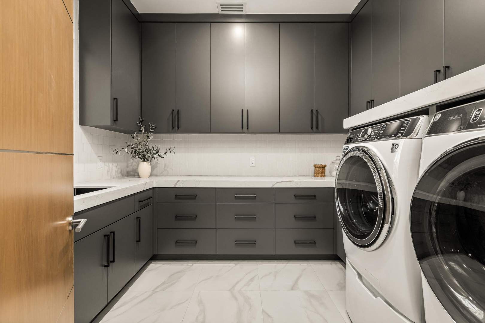 The culinary kitchen and prep kitchen include premium JennAir appliances like a 48-in gas range with a custom wrapped quartz hood, a 60-in and a 36-in refrigerator/freezer, 2 dishwashers, built-in coffee maker, a Thermador wine fridge, a Zepher beverage refrigerator, a 10-ft center island with quartz waterfall edges, and amazing high-quality floor-to-ceiling (12 feet) cabinetry.