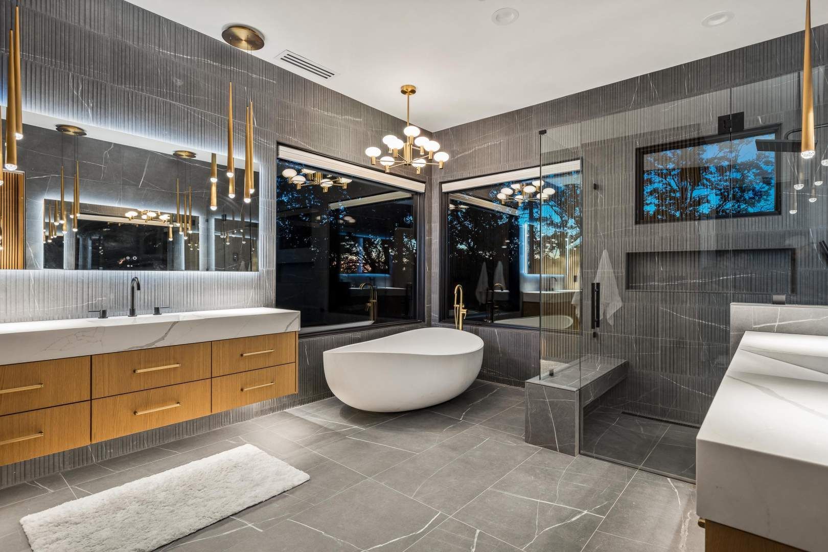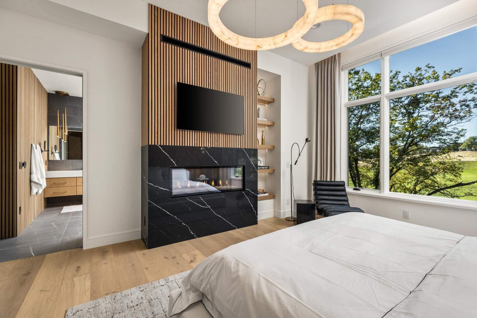 Every bedroom in this home is en suite, providing ultimate comfort and convenience for each resident and guest. The primary suite offers ample space for relaxation and rejuvenation with a linear fireplace, display shelves, reading lights, stone chandelier, and views out over the course. The spacious primary bathroom is designed with a large soaking tub, walk-in shower with an electric shower faucet and multiple shower heads, 2 vanities with quartz counters, automated under counter lighting, bidet, and a large closet with custom cabinets and drawers.