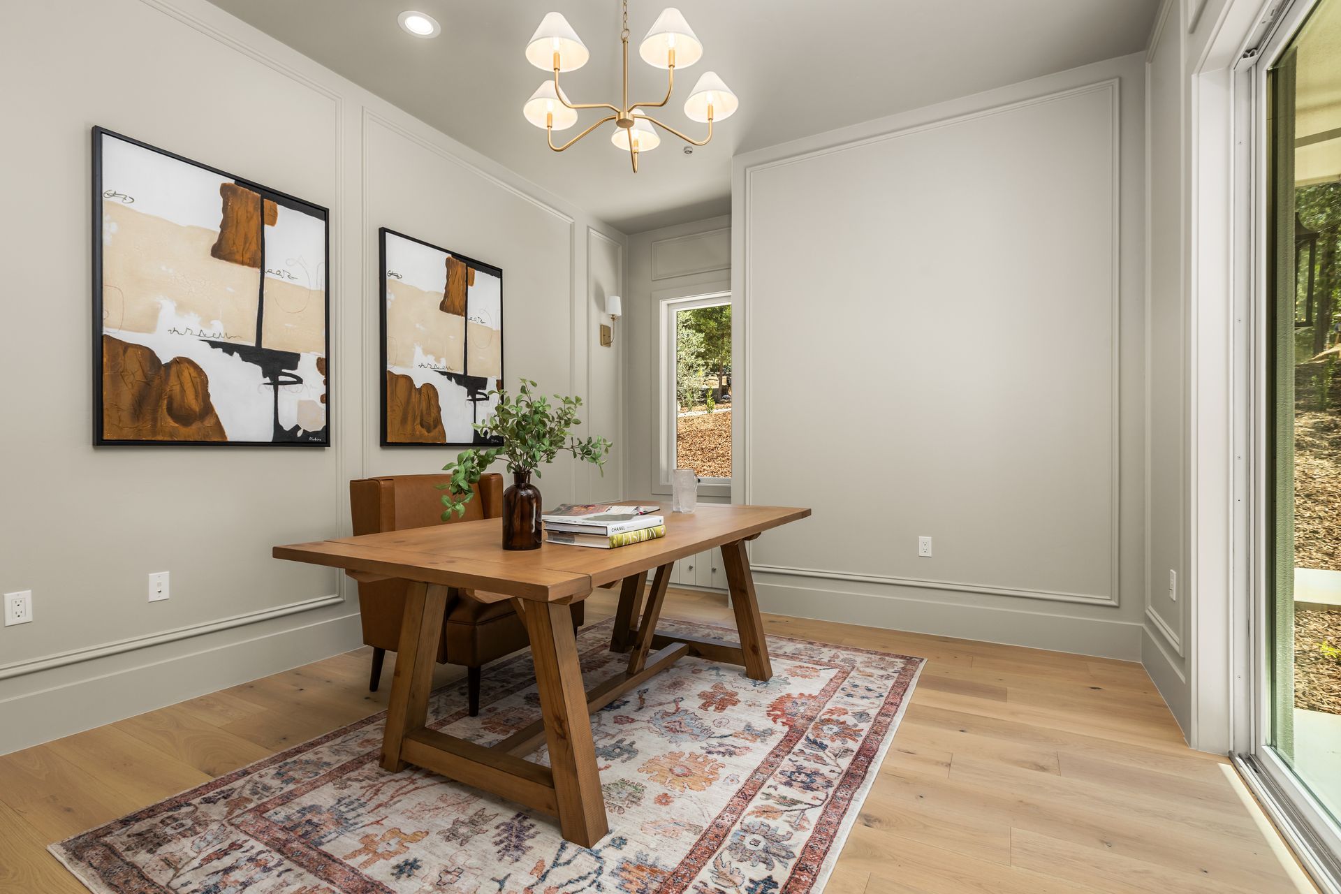 Step through the double glass doors into a breathtaking great room with 17-foot vaulted ceilings with white beams and expansive windows that frame serene views of the forest beyond. Light dances across the European white oak floors, while the glow of a designer chandelier and the linear fireplace create an inviting atmosphere that feels both grand and grounded. The heart of the home is the chef’s kitchen - anchored by a 10-foot island and appointed with Monogram appliances, custom cabinetry, and a stylish walk-in pantry -designed for memorable meals and gatherings that flow effortlessly into the dining areas and covered outdoor patio.