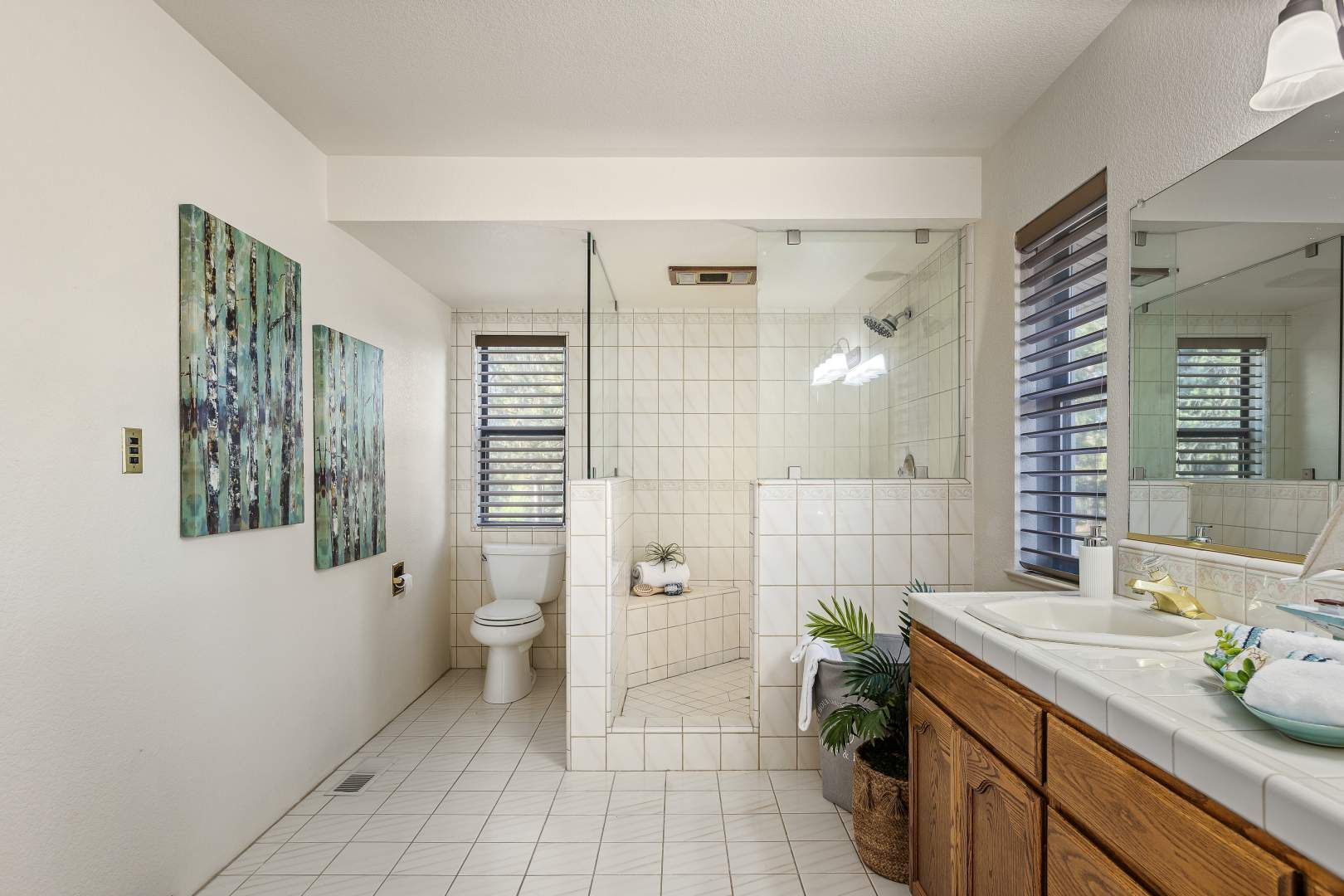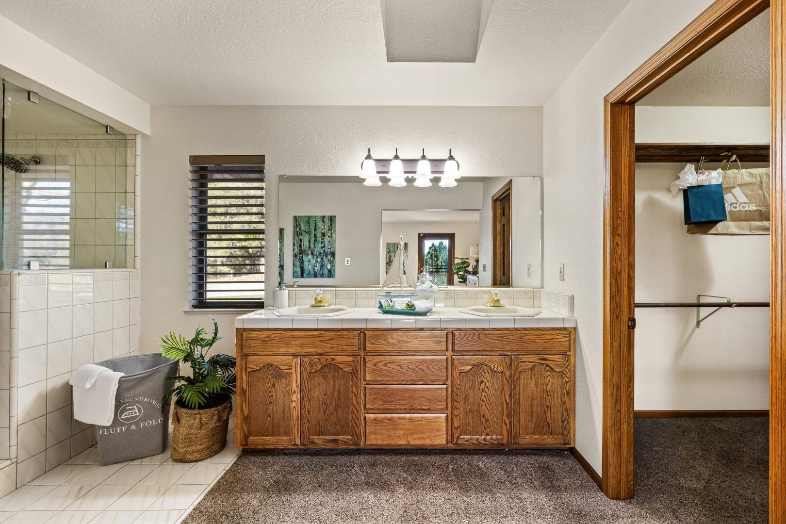 • Master bath with a skylight, large walk-in shower, double sink vanity and large walk-in closet with a sitting bench