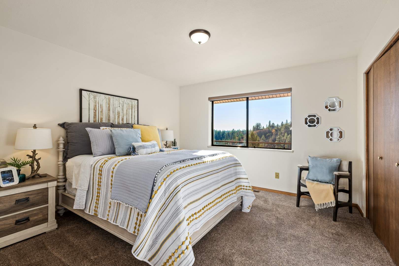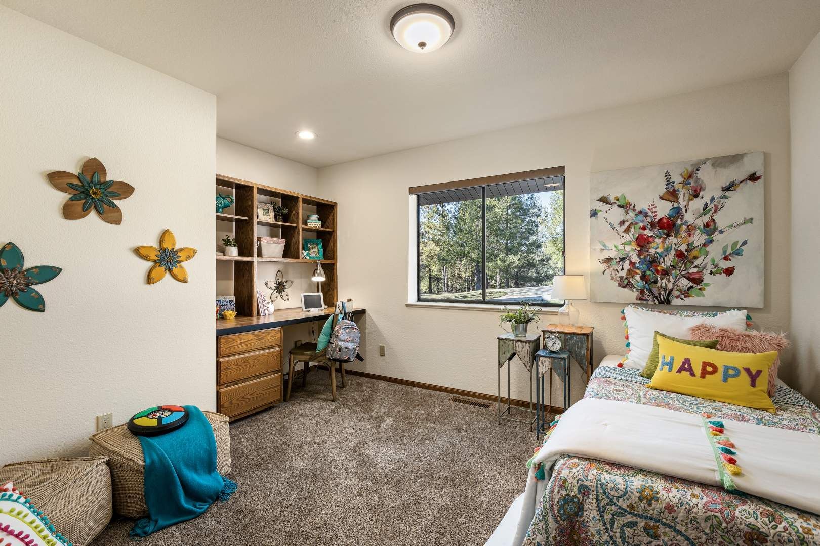 • Bedroom on other side of the home with plush carpet and a built-in desk and bookcase
