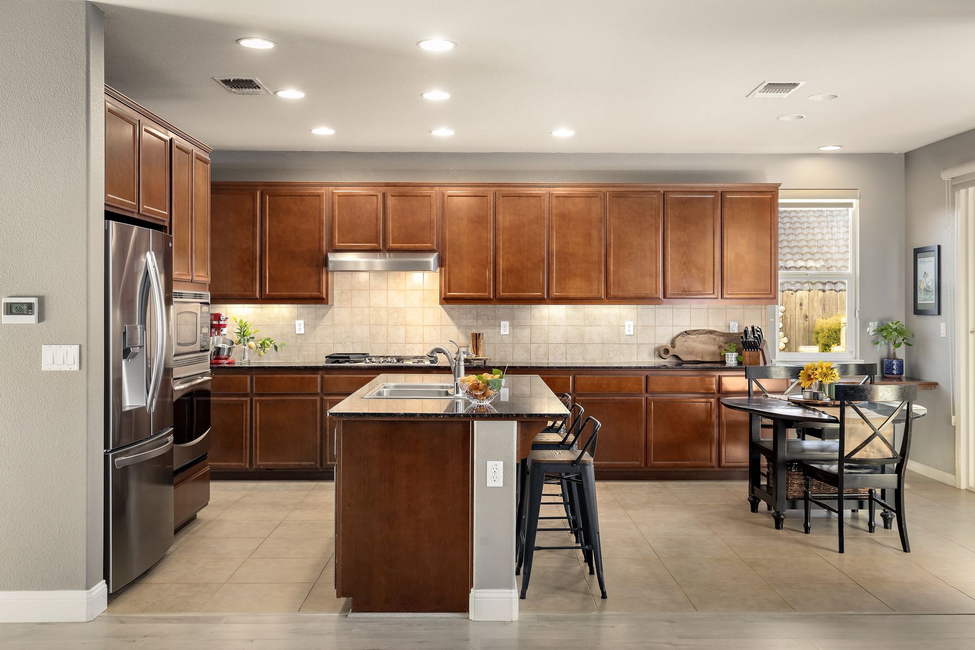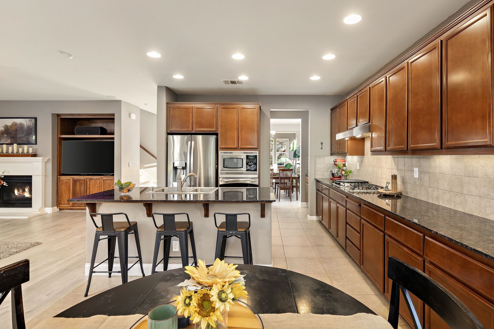Kitchen with granite slab counters and abundant cabinetry, stainless steel appliances and double sink, four person dine up bar, built in desk, sliding door to outdoor covered patio, walk in pantry