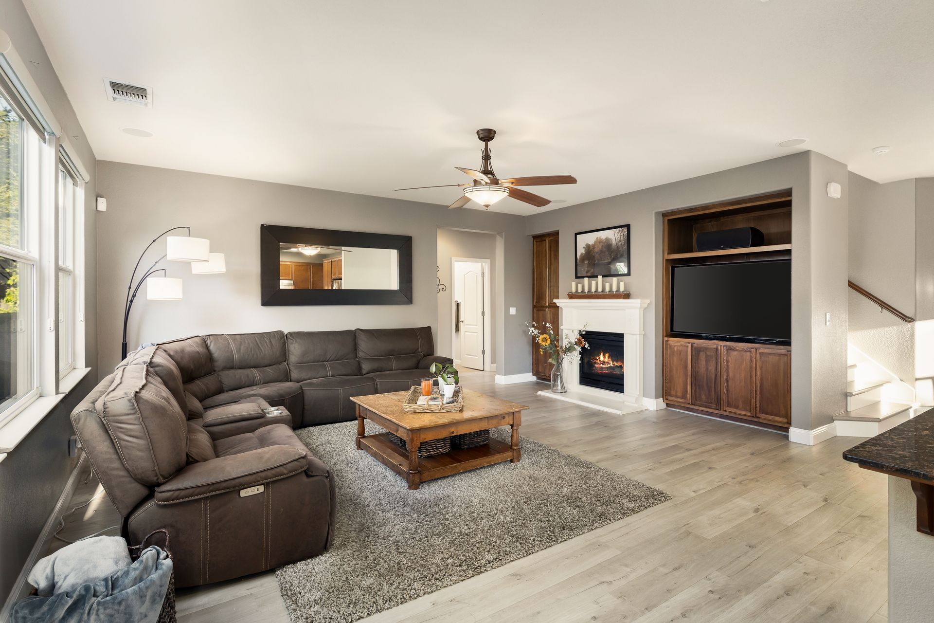 Great room with a gas log fireplace, built in entertainment center and surround sound speakers
