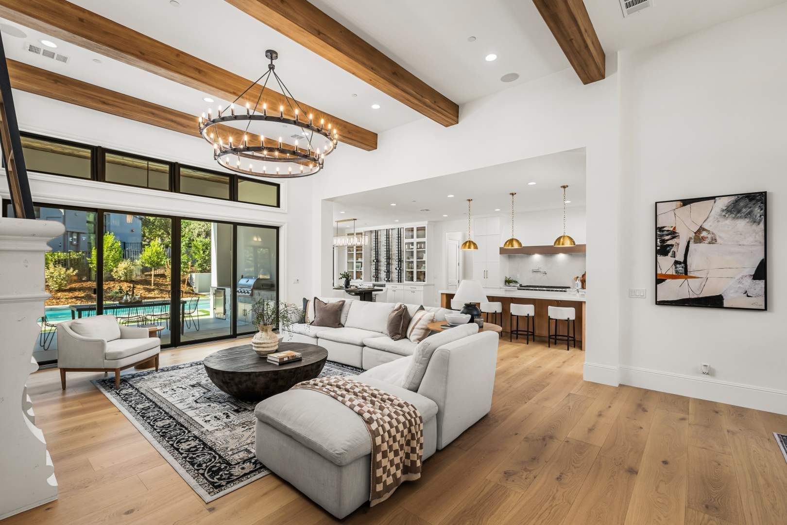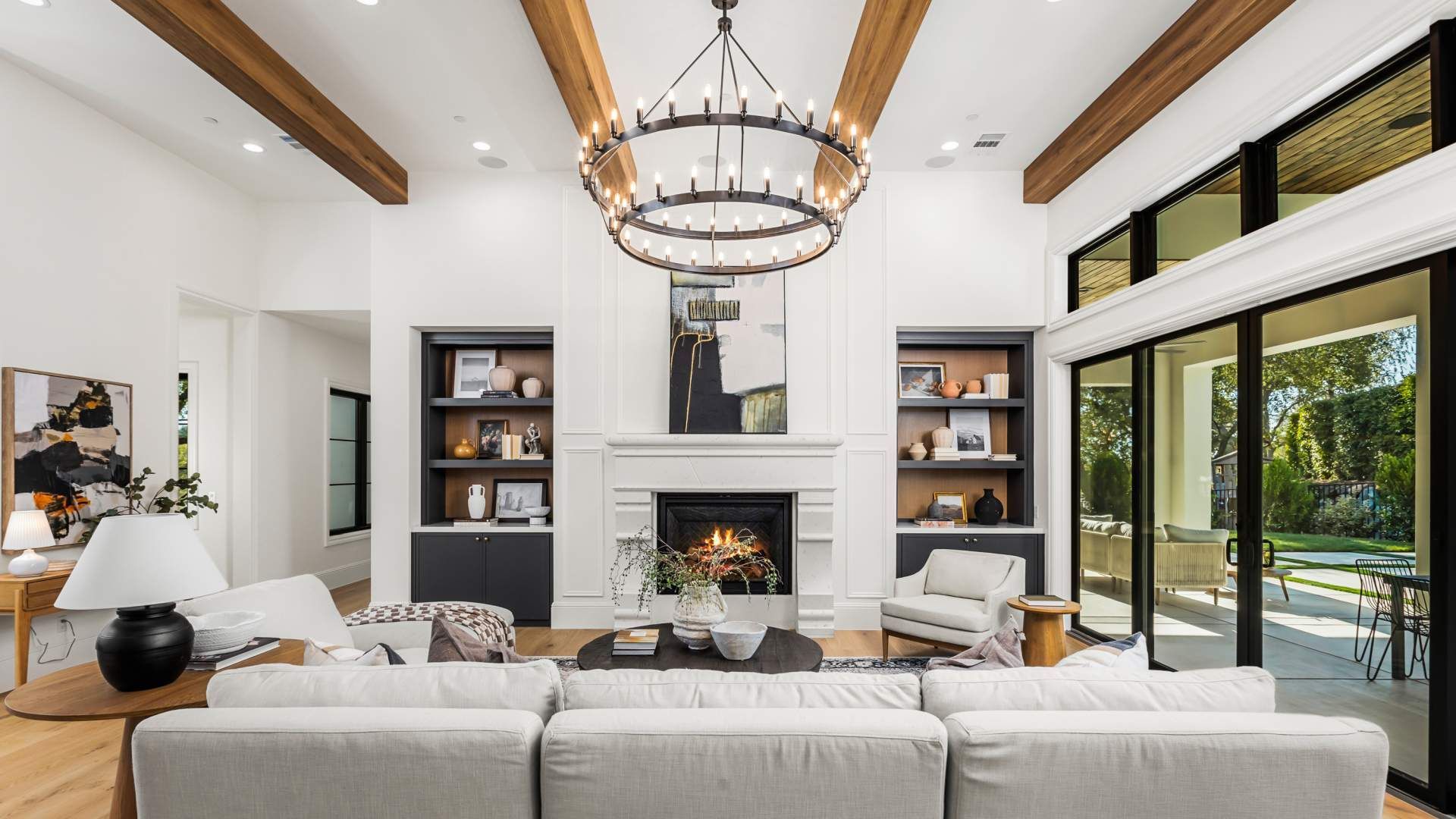 This home lives like a one-story, with a grand great room with exposed beams, fireplace, chandelier, surround sound system and a wall of windows and sliders. The chef’s dream kitchen has a massive quartz center island with an apron sink and a veggie sink, quartz backsplash, a 48-inch Wolf range, a Jenn-Air refrigerator/freezer and convection microwave, a Cove dishwasher and a Fisher & Paykel dishdrawer dishwasher. The dining area is designed with a stunning 54-bottle wine display, built-ins and a wine fridge. The master retreat boasts a fireplace and a spa-like bathroom with large soaking tub, marble floors and marble walk-in shower. Additional living areas on the main floor include a guest suite, an office, laundry with GE washer and dryer, and a stunning powder bath with a custom granite sink and vanity.