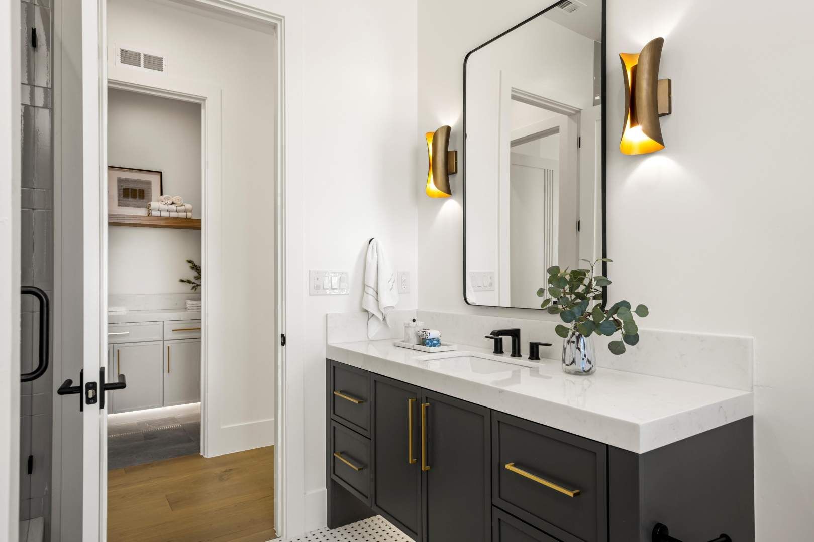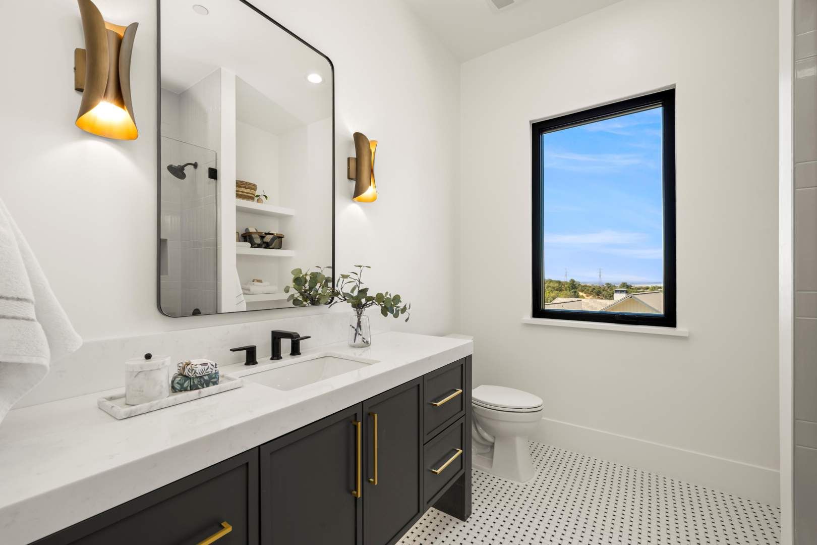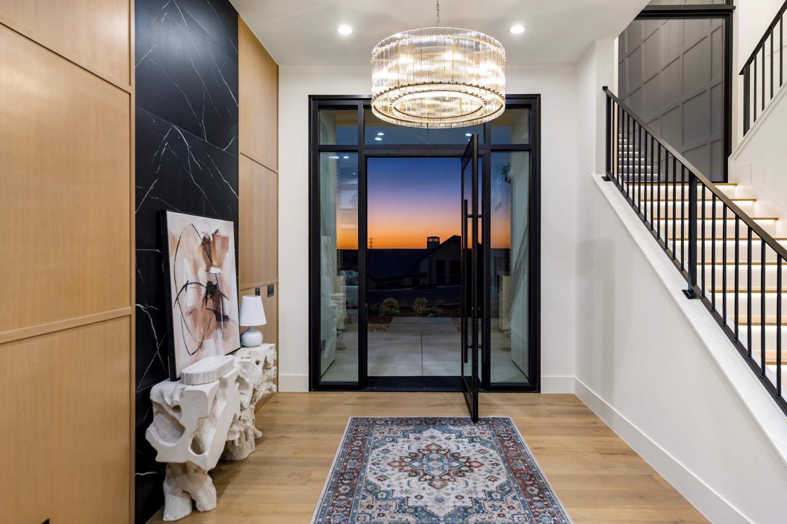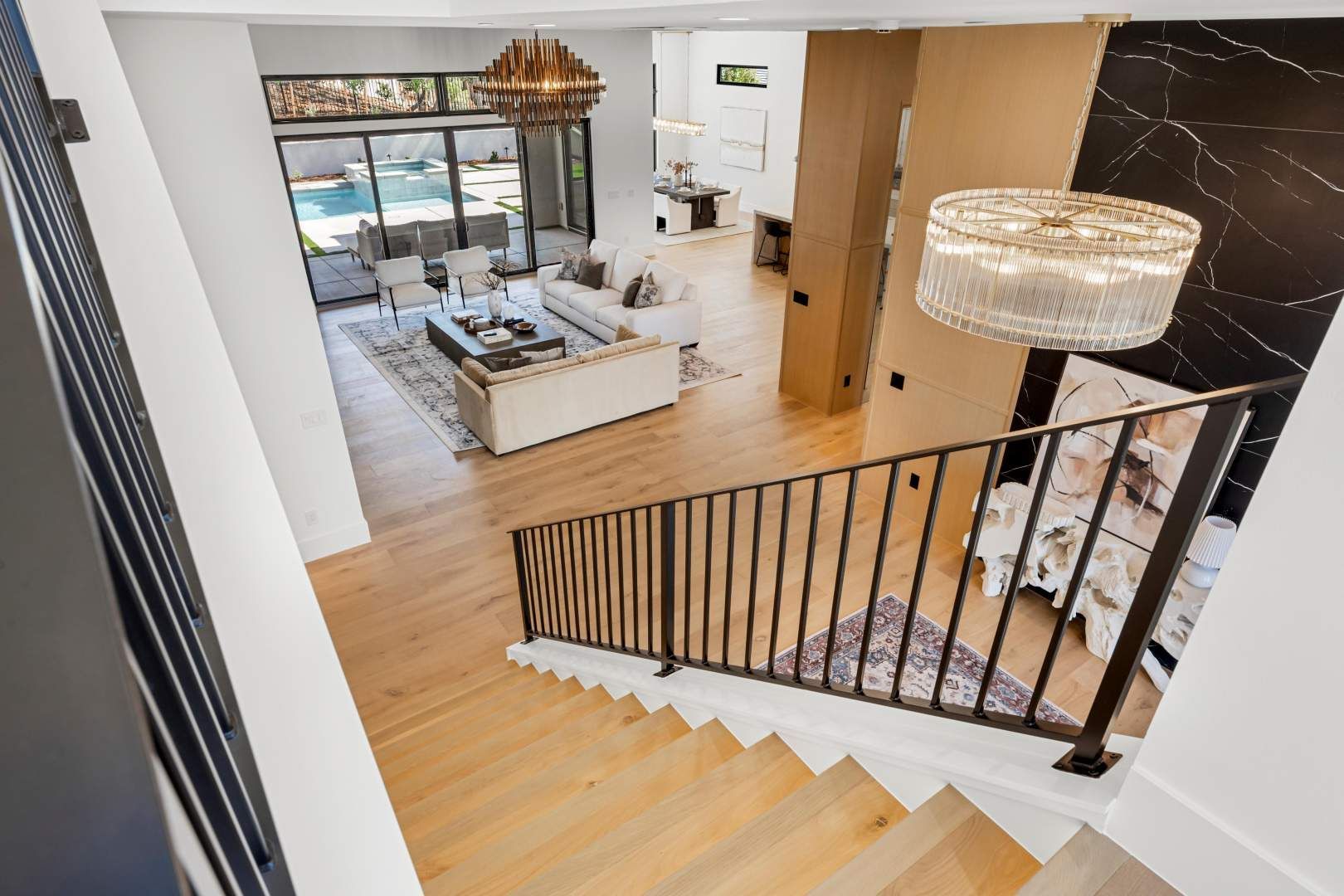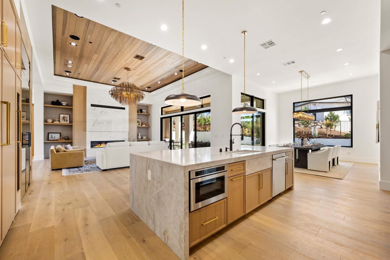 Designed for effortless single-story living, the floor plan includes a spacious great room with a 72′ Mezzo fireplace, soffit lighting and surround sound, the kitchen with a prep kitchen, a large formal dining area, a guest suite, an office, laundry room complete with GE washer and dryer, a powder bath with quartzite sink and countertop and a generous primary suite finished in beautiful lime stone paint, a 42″ Cosmo fireplace and sliding doors directly to the pool and spa. The primary bath features a large walk in shower with multiple shower heads, a unique and special matte soaking tub, double vanities and s spacious walk in closet.